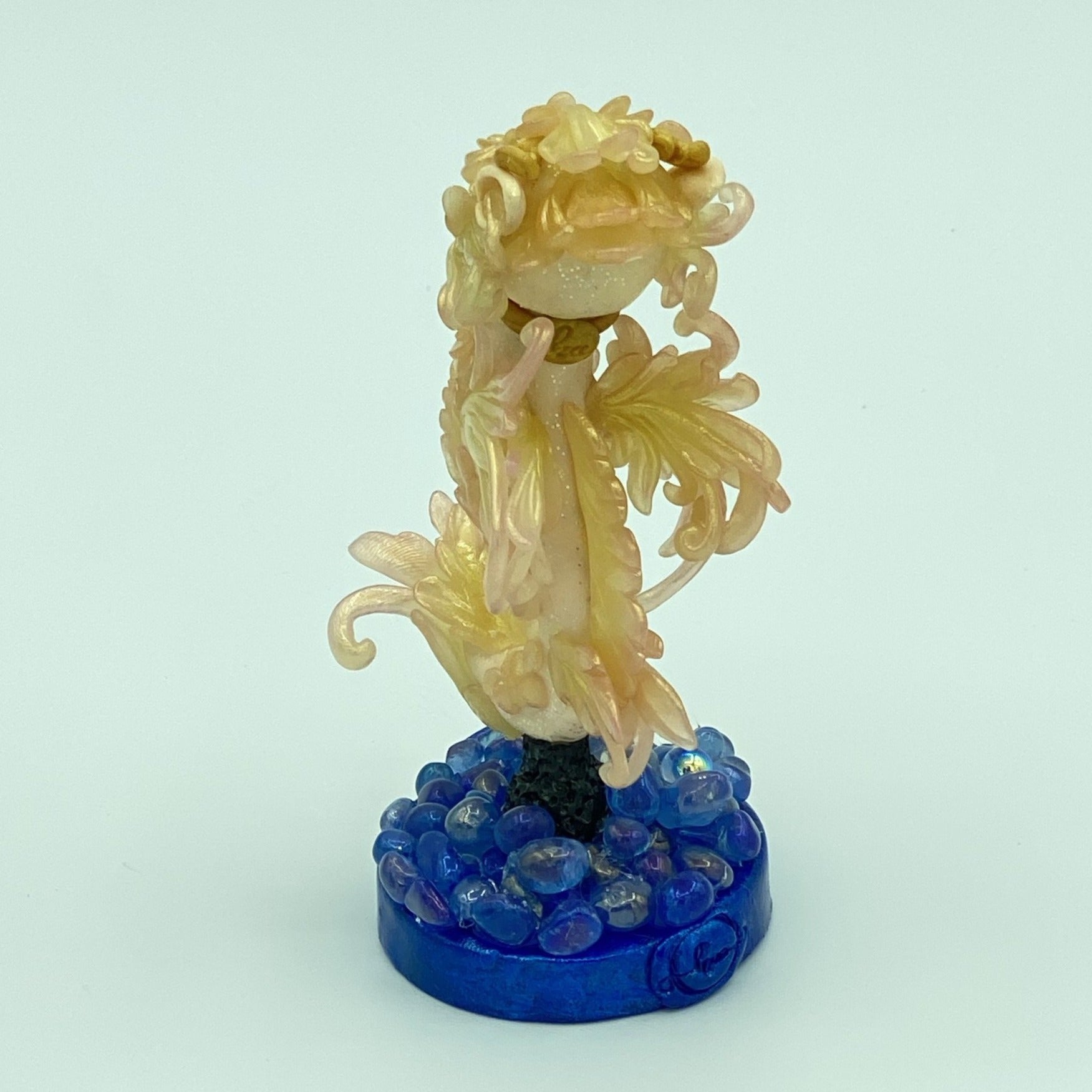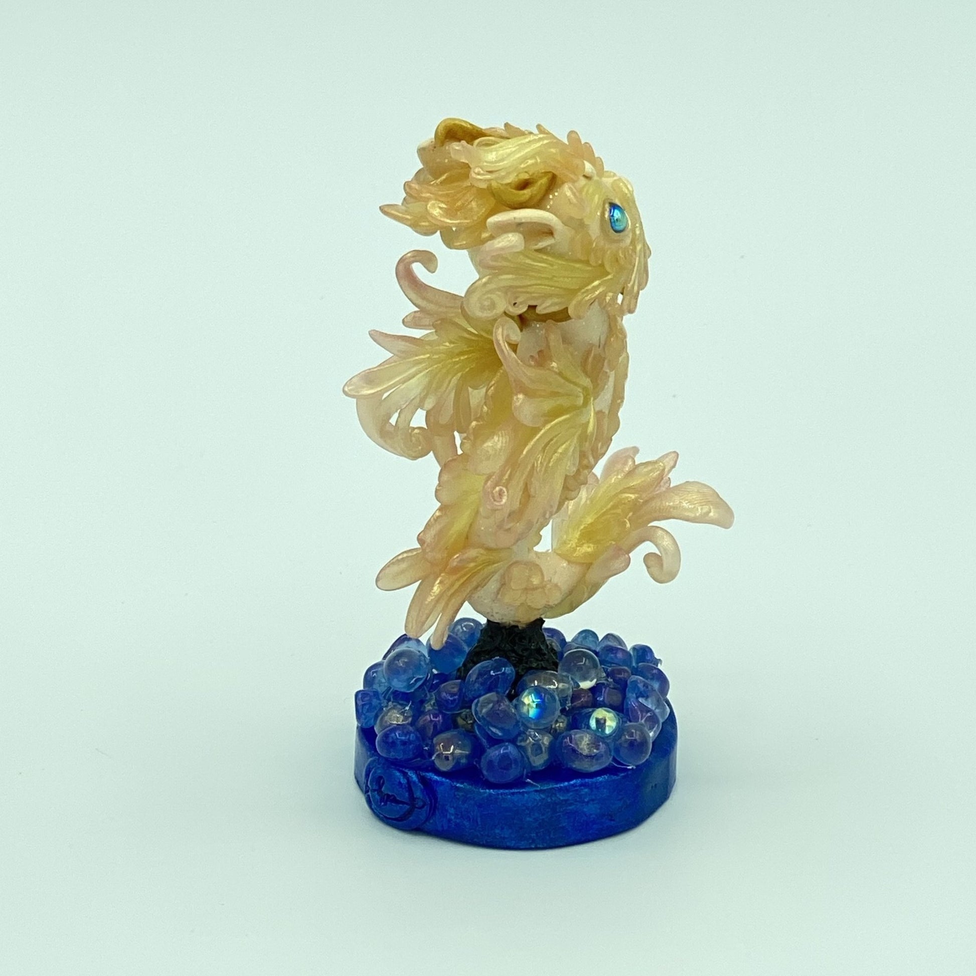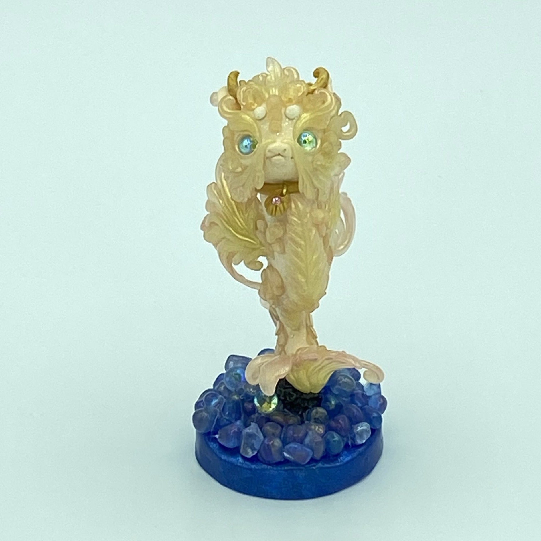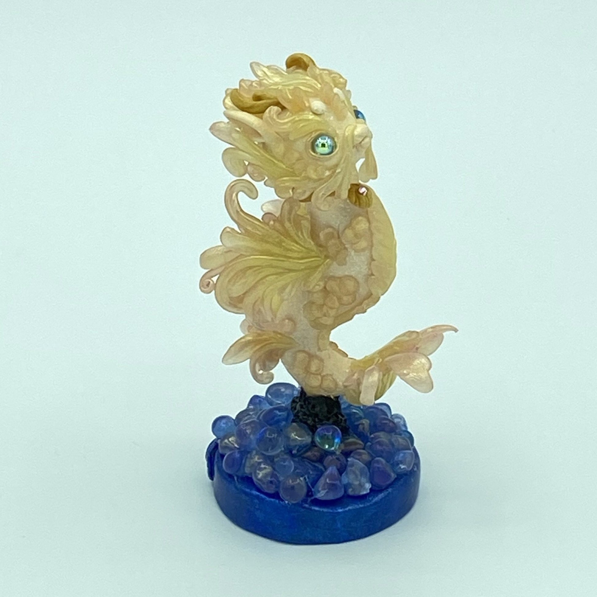 Pretty and delicate, this Peach and Gold water dragon is rare and elusive! Made entirely out of Sculpey Polymer Clay, she sits atop her rock on her clay stand that's adorned with colorful blue stones. She has green AB czech glass cabochon eyes that change color with the light and is accented with pearl ex mica powders.
