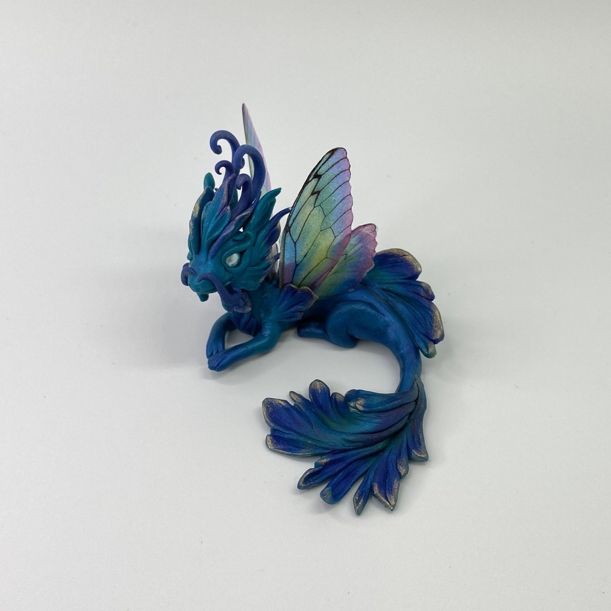 Fanciful fairy dragon in colors of peacock blue and purple and accentuated with blue, green, purple and gold. Made from Premo Polymer clay, glass beads for eyes and resin wings.