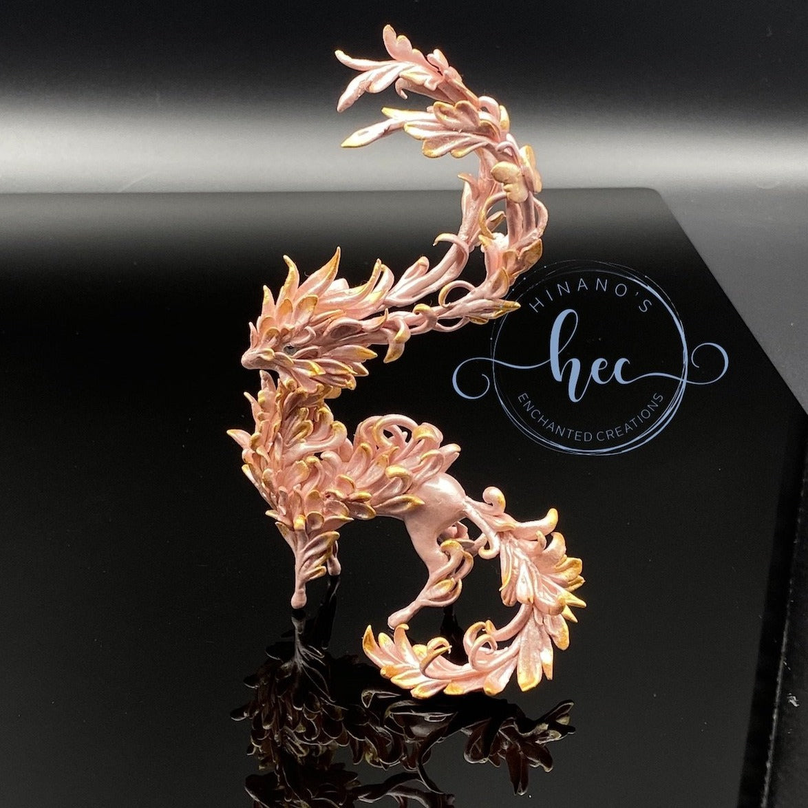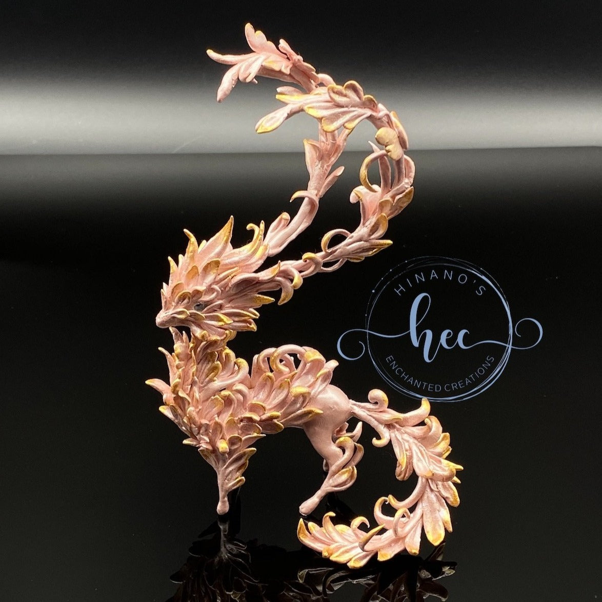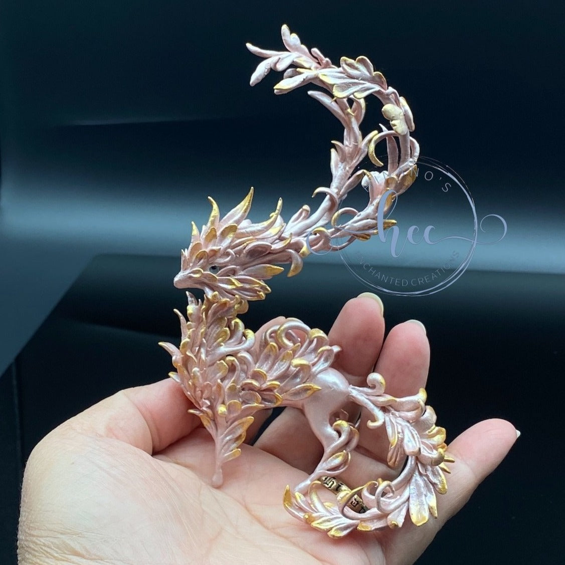Forest Spirit Dragon in pearly pink hues and gold. She is one of the few sculpts I have created made entirely out of high quality air dry clay. Light as a feather but tons of details and shimmer that pictures cannot do justice to.