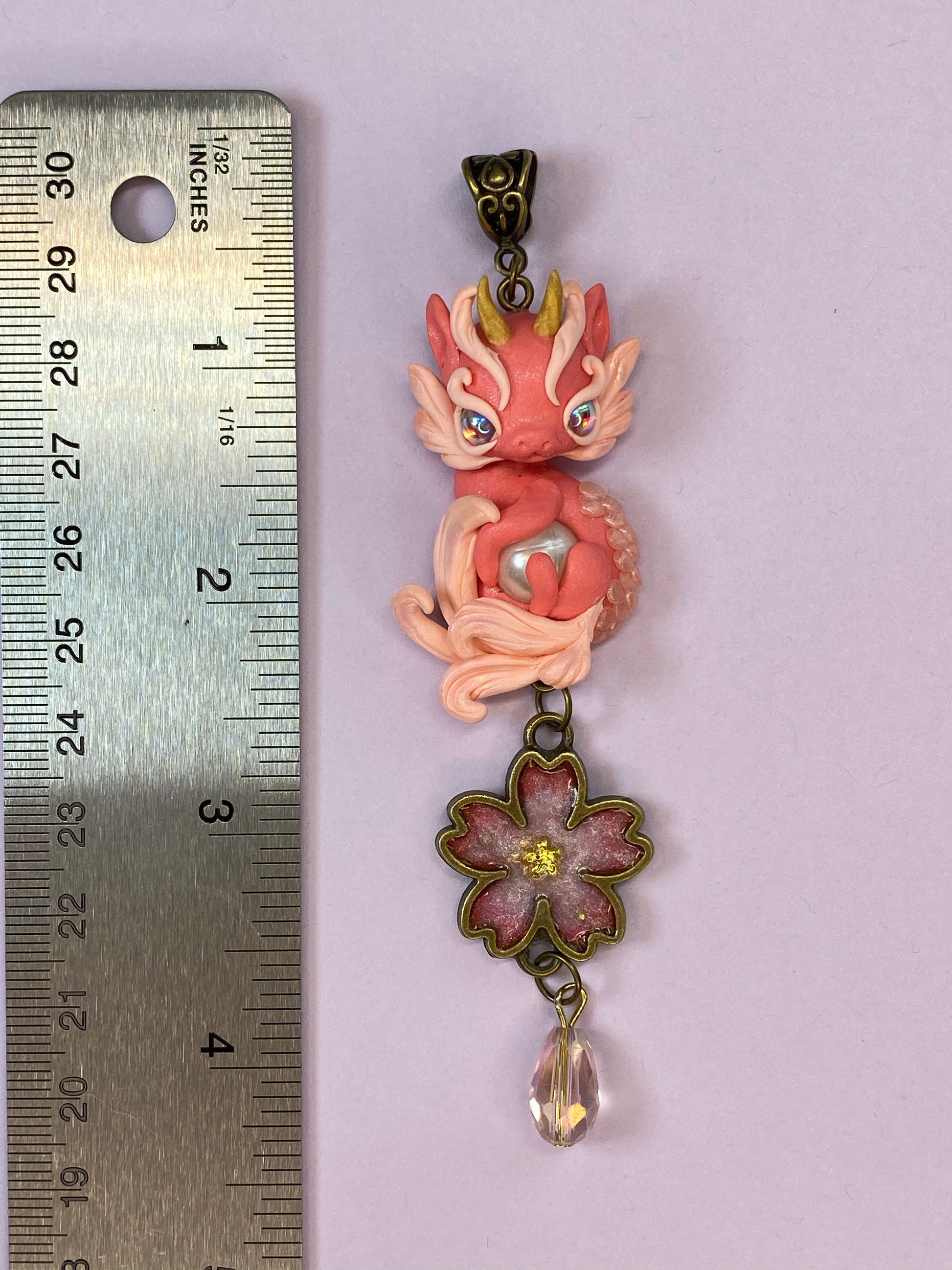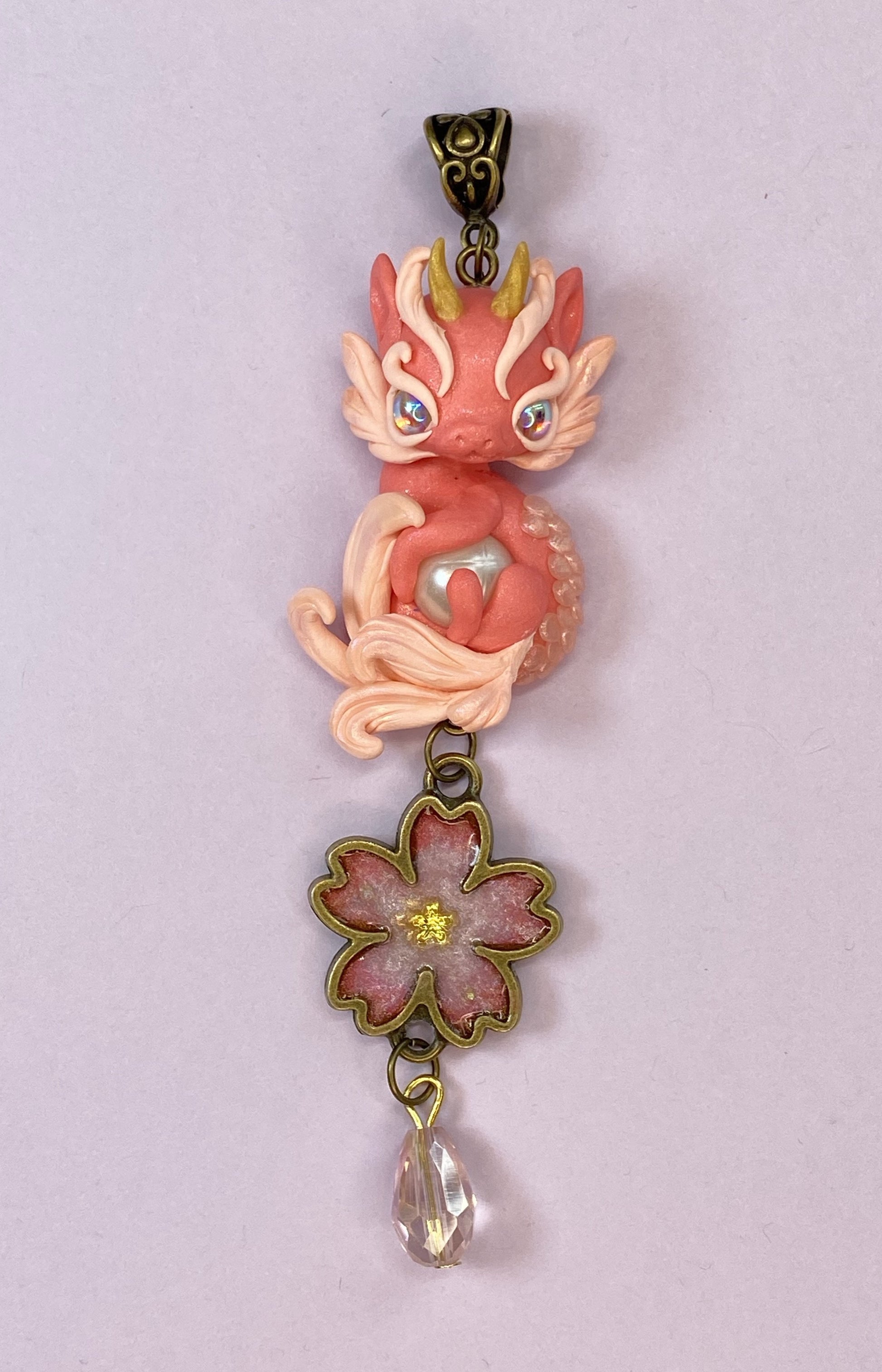 This tiny pink dragon has pearlescent scales on her back as she guards her little pearl. She comes with a resin Sakura Charm and pink Crystal. Materials used include premo sculpey clay, ab cabochon crystal for eyes, tiny pearl and pearl ex powders. Leather necklace included.