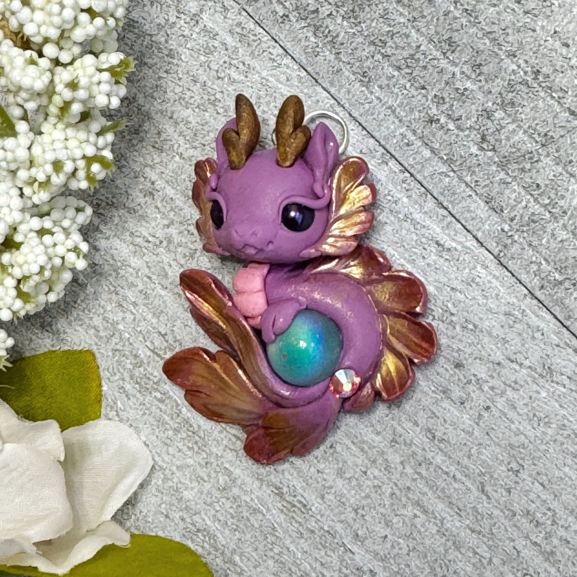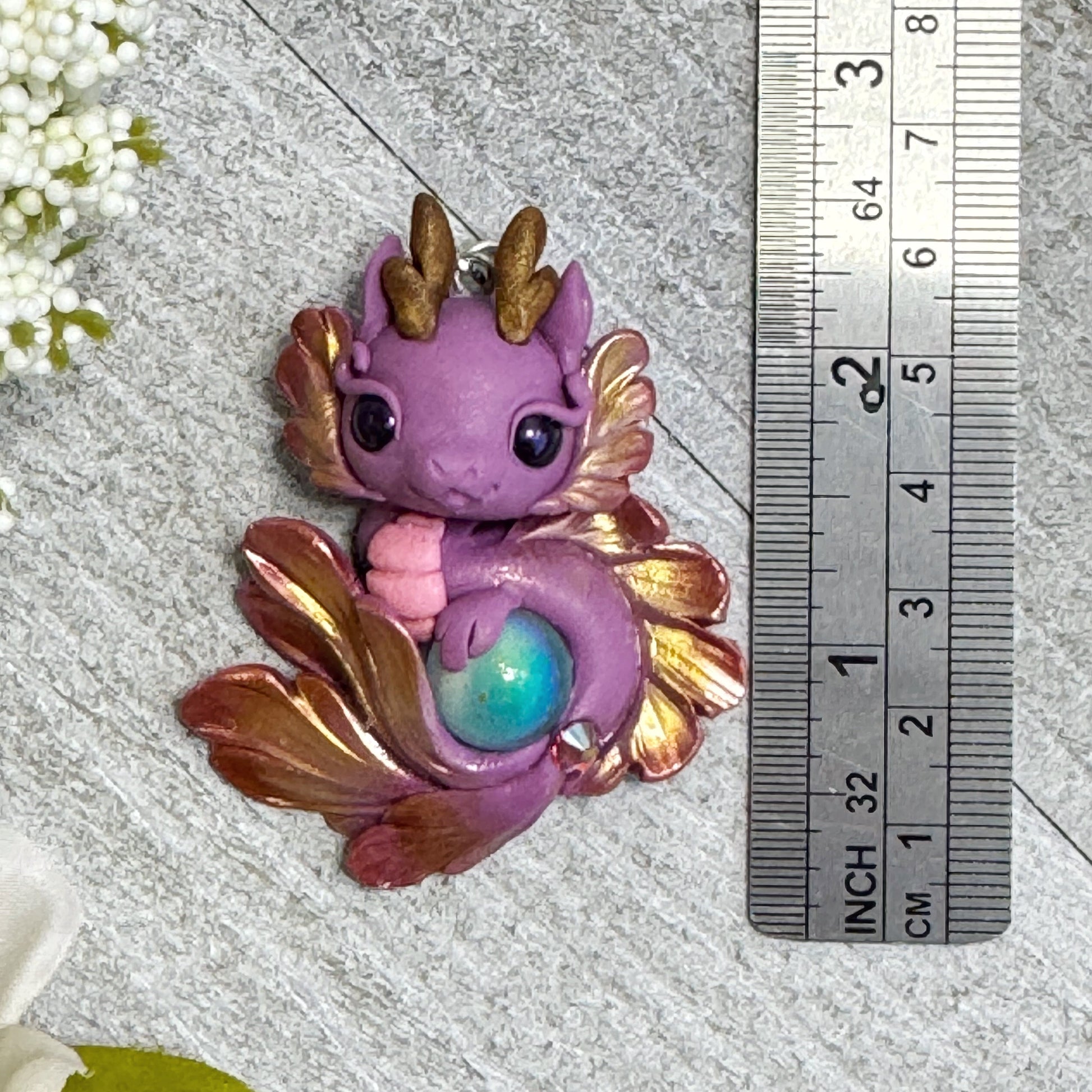 The Purple Sunset Baby Dragon Pendant is a playful and enchanting accessory handcrafted from polymer clay. Adorned with sparkling glass beads and vibrant pigment powders, it shines with a glossy varnish finish and UV Resin. Paired with an 18" leather cord necklace, this one-of-a-kind dragon adds a magical touch of twilight charm to any outfit.
