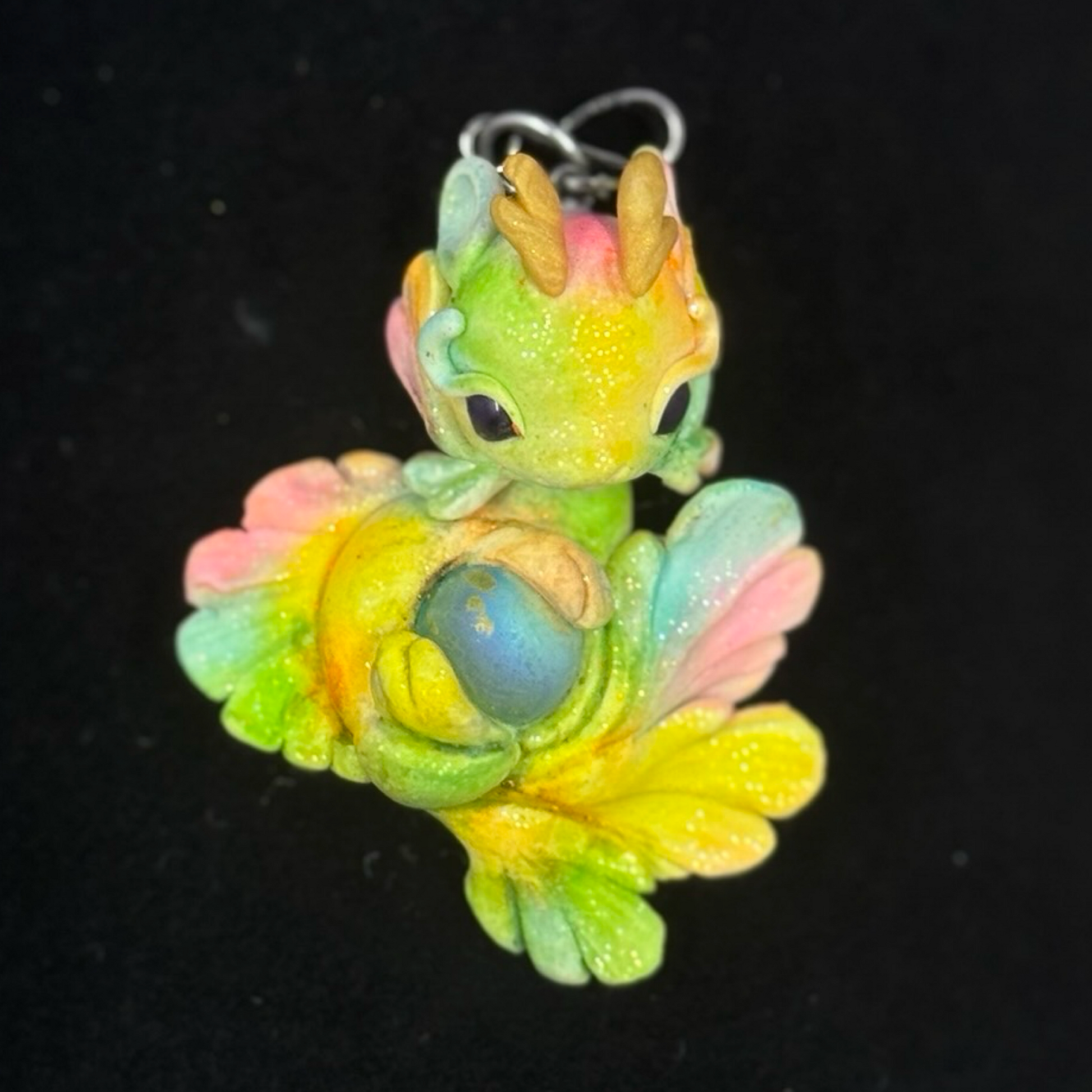 Add a touch of magic to your style with the Rainbow Baby Dragon Pendant. Handmade with polymer clay, glass beads, marble, and vibrant pigment powders, this adorable pendant features a cute baby dragon surrounded by a rainbow of colors. Comes with a durable leather cord necklace for a complete look.