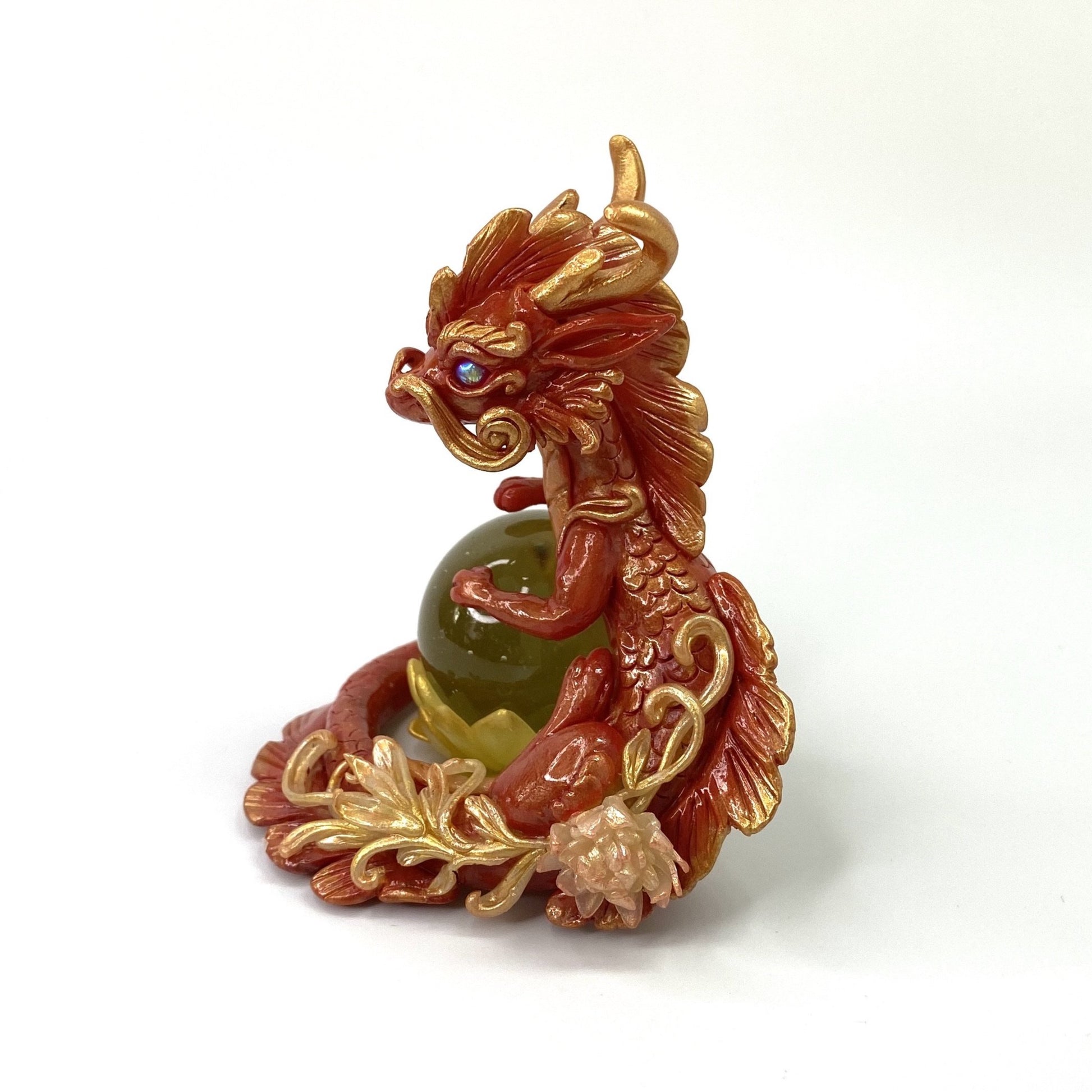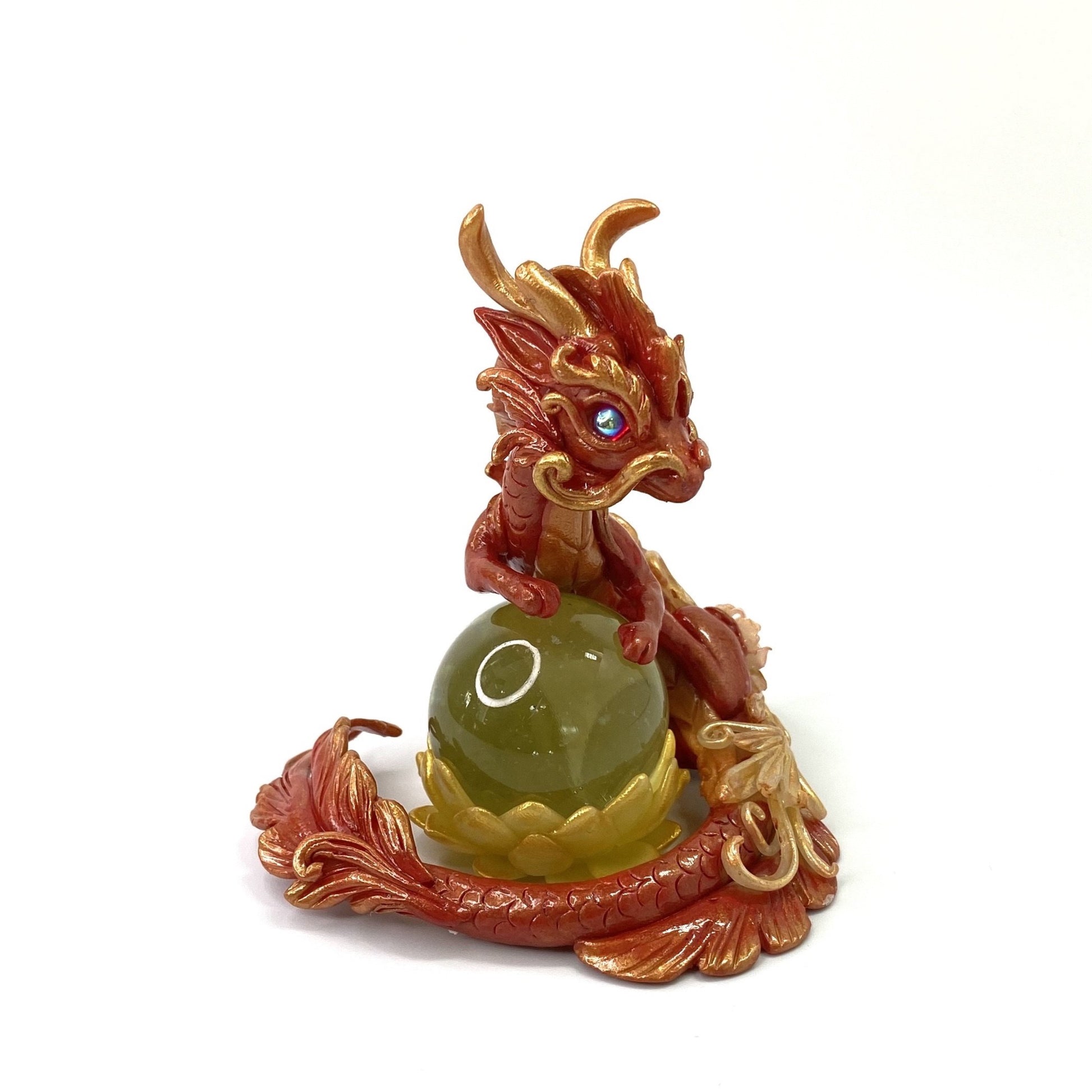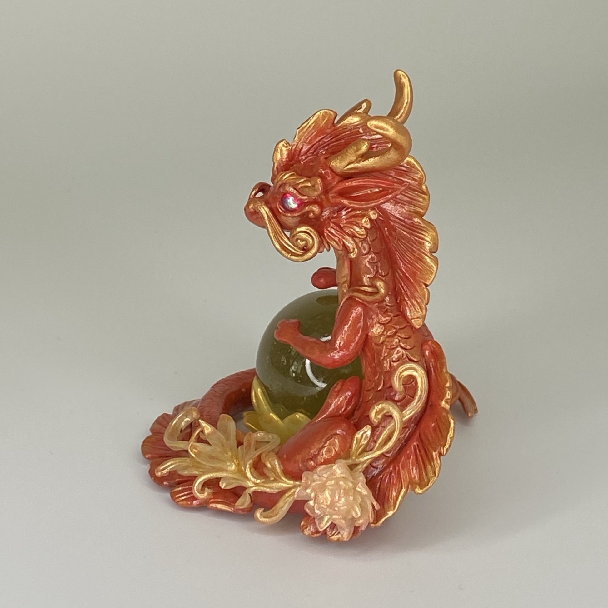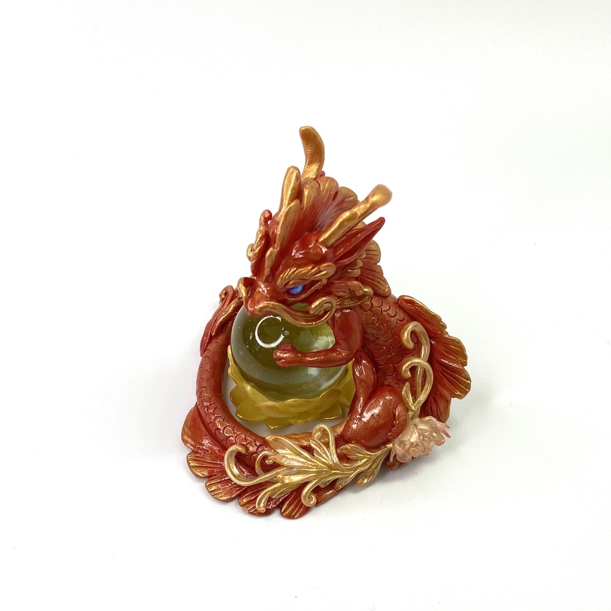 Red and gold dragon with rose gold accents and filigree floral design stands guard over a marble lotus flower. Made out of Super Sculpey polymer clay, AB coated glass cabochon for eyes and a glass marble. Dragon and marble lotus are two separate pieces so you can pose them as you want.