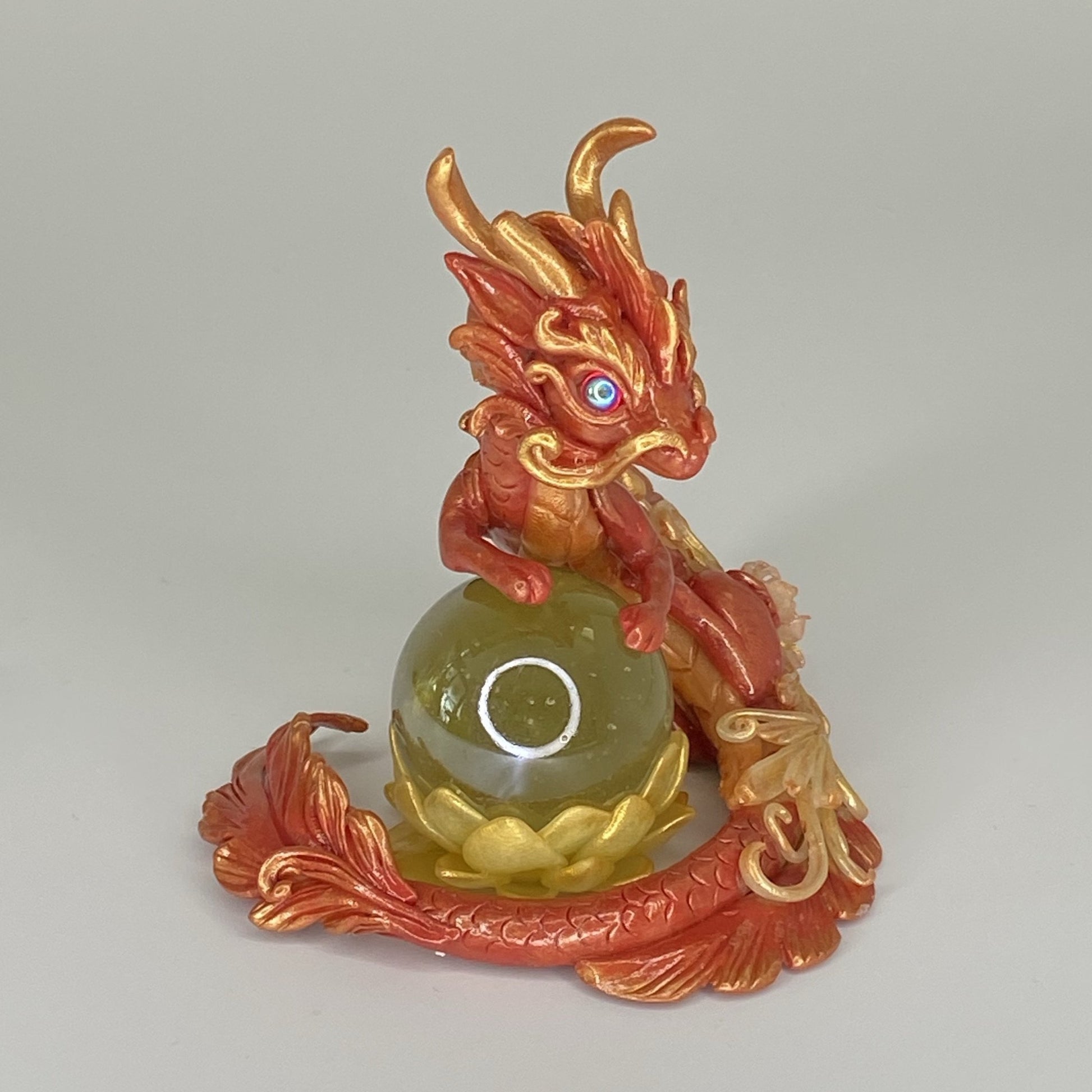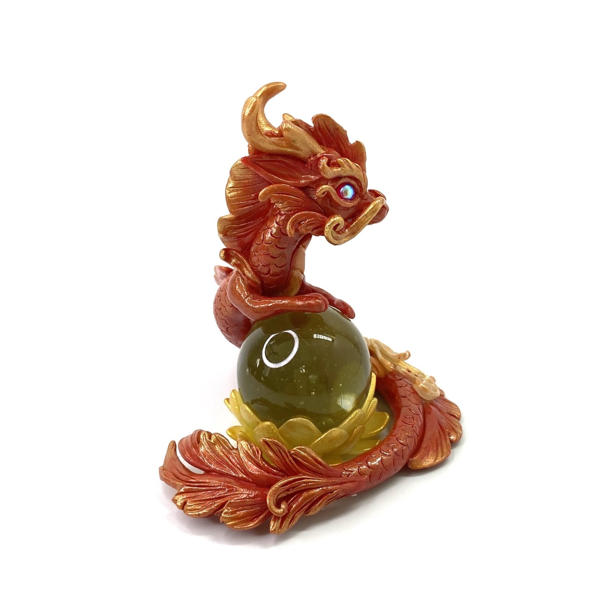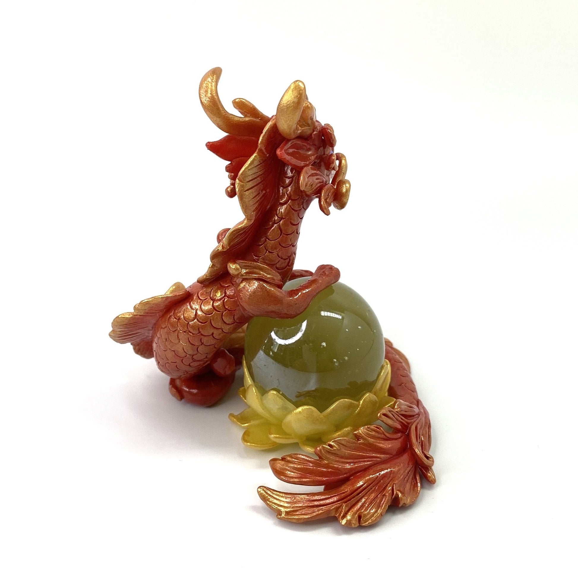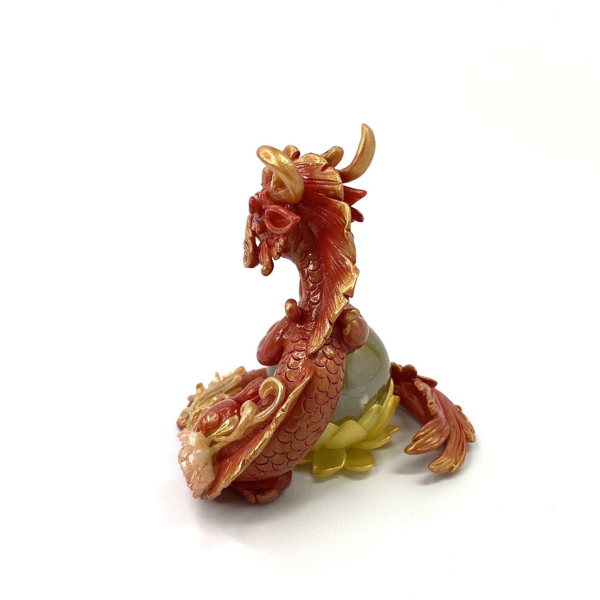 Red and gold dragon with rose gold accents and filigree floral design stands guard over a marble lotus flower. Made out of Super Sculpey polymer clay, AB coated glass cabochon for eyes and a glass marble. Dragon and marble lotus are two separate pieces so you can pose them as you want.
