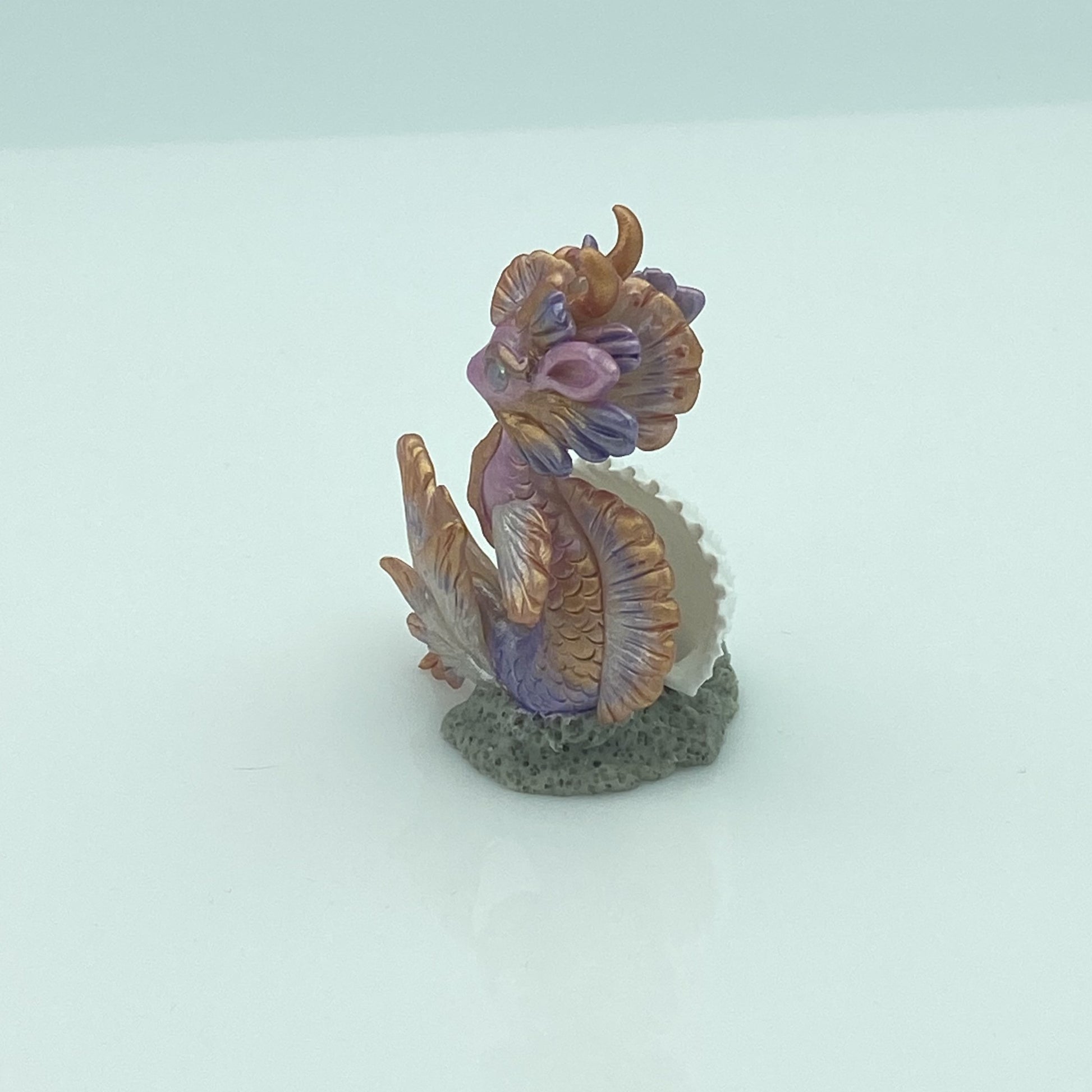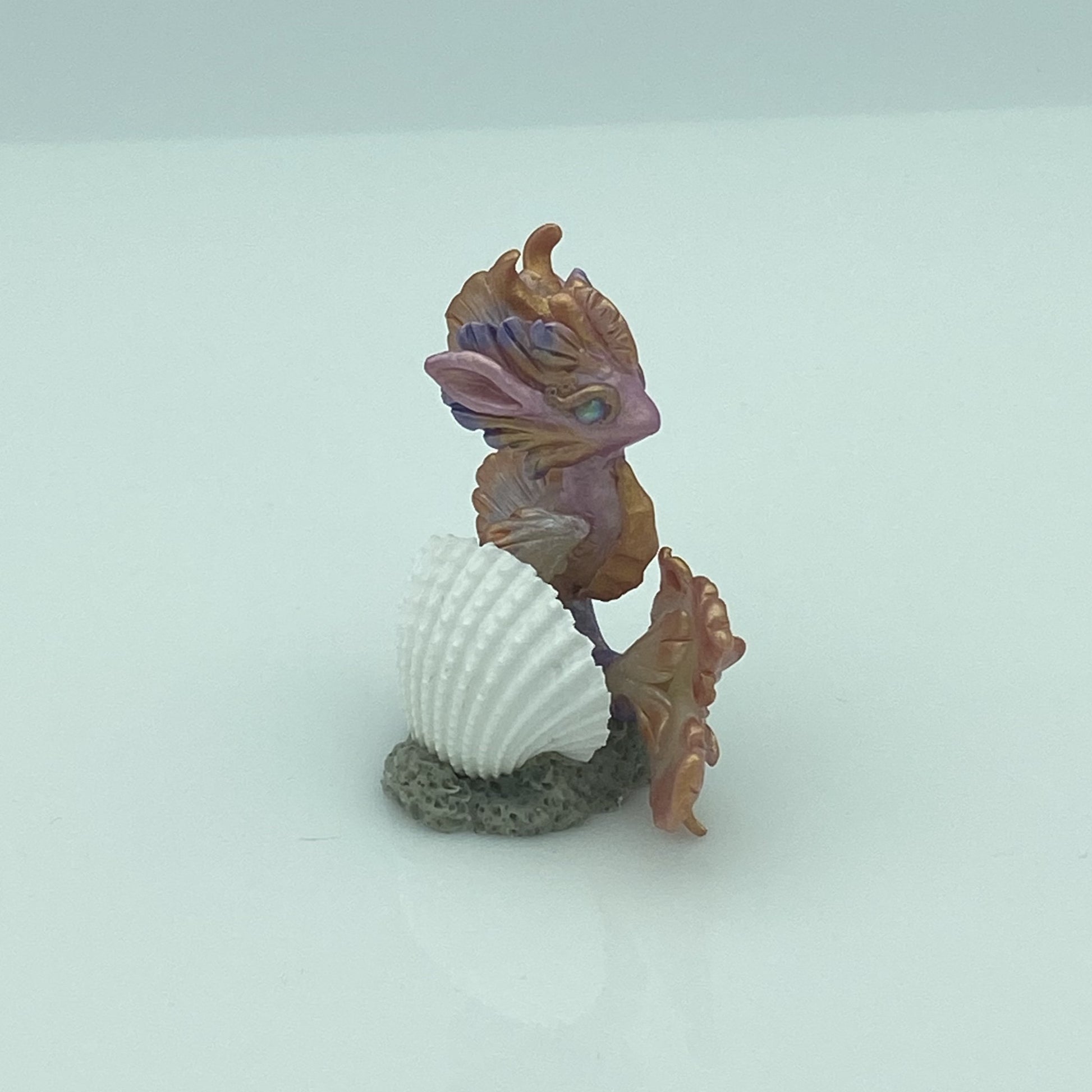 Baby Dragon Fry in colors of pink, rose gold and lavender guards her seashell. Sculpted in Super Sculpey polymer clay and painted in iridescent acrylic paints.
