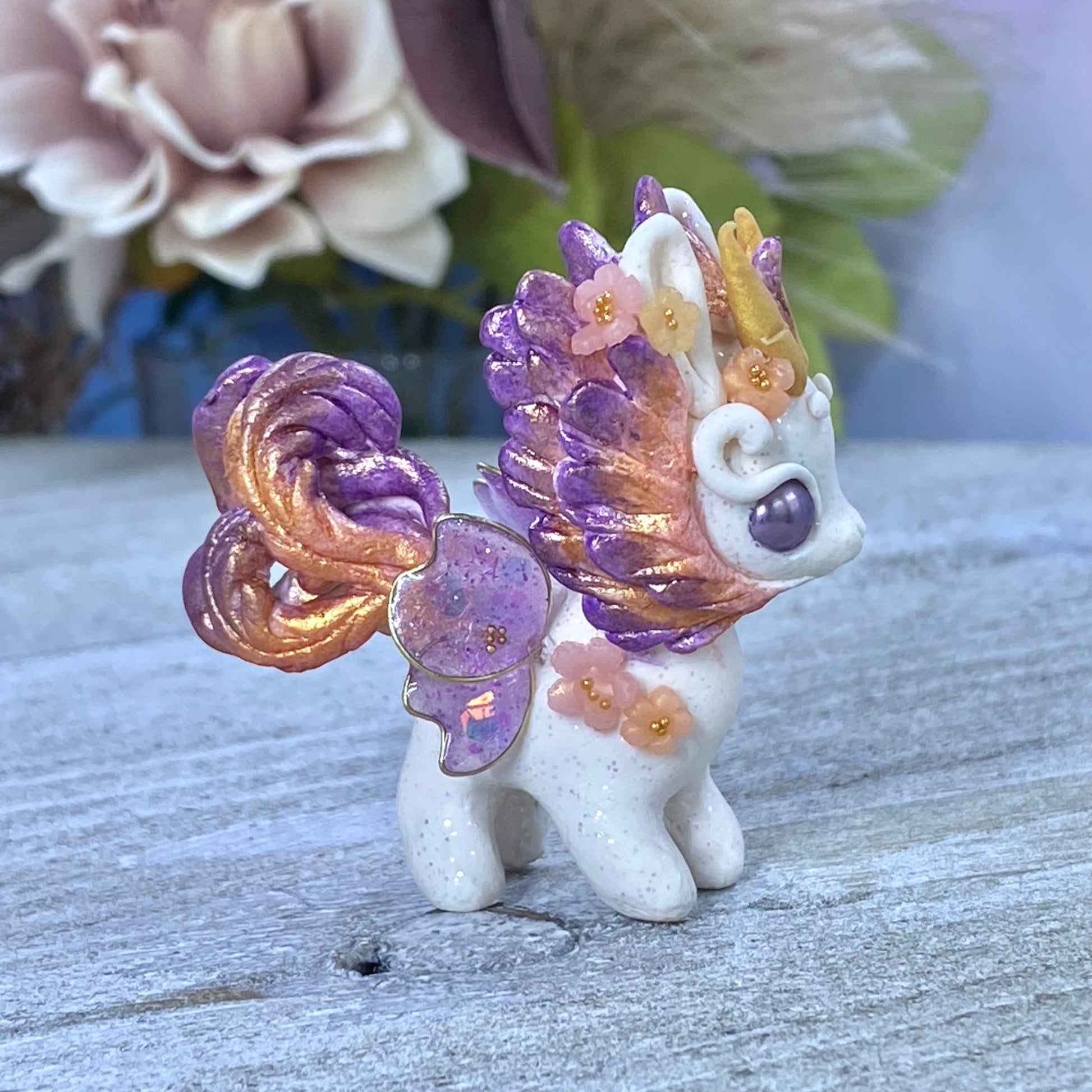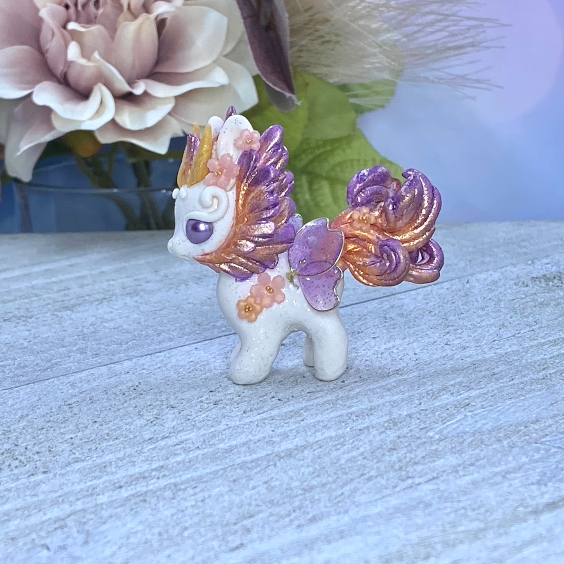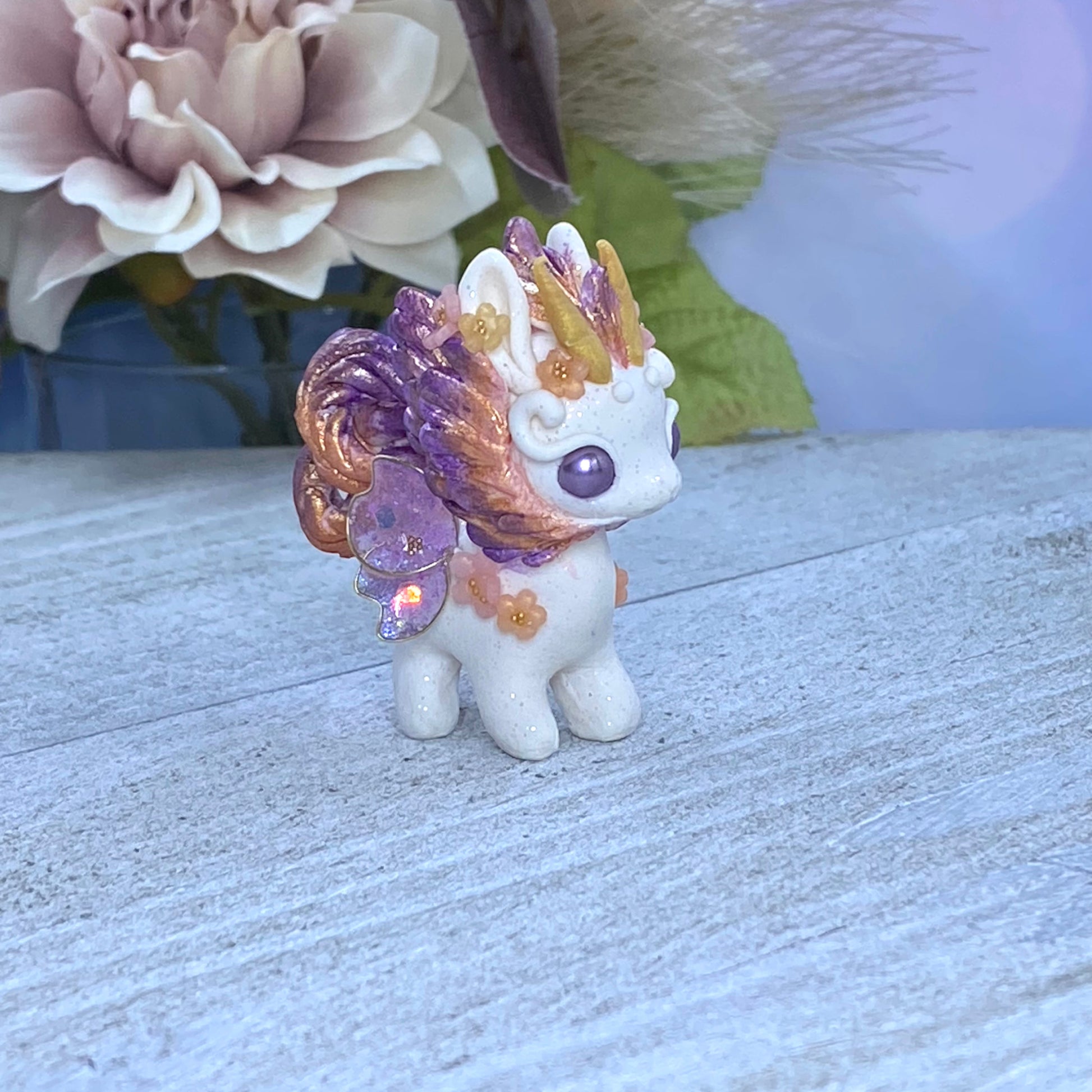 Introducing Sunset Bunnigon, a hand-sculpted work of art crafted from polymerclay, wire, resin and gold seed beads. Its captivating hues of plum, orange and gold will make a stunning addition to any home decor. Finished with delicate cherry blossom flowers, this piece of art is sure to become a treasured keepsake.