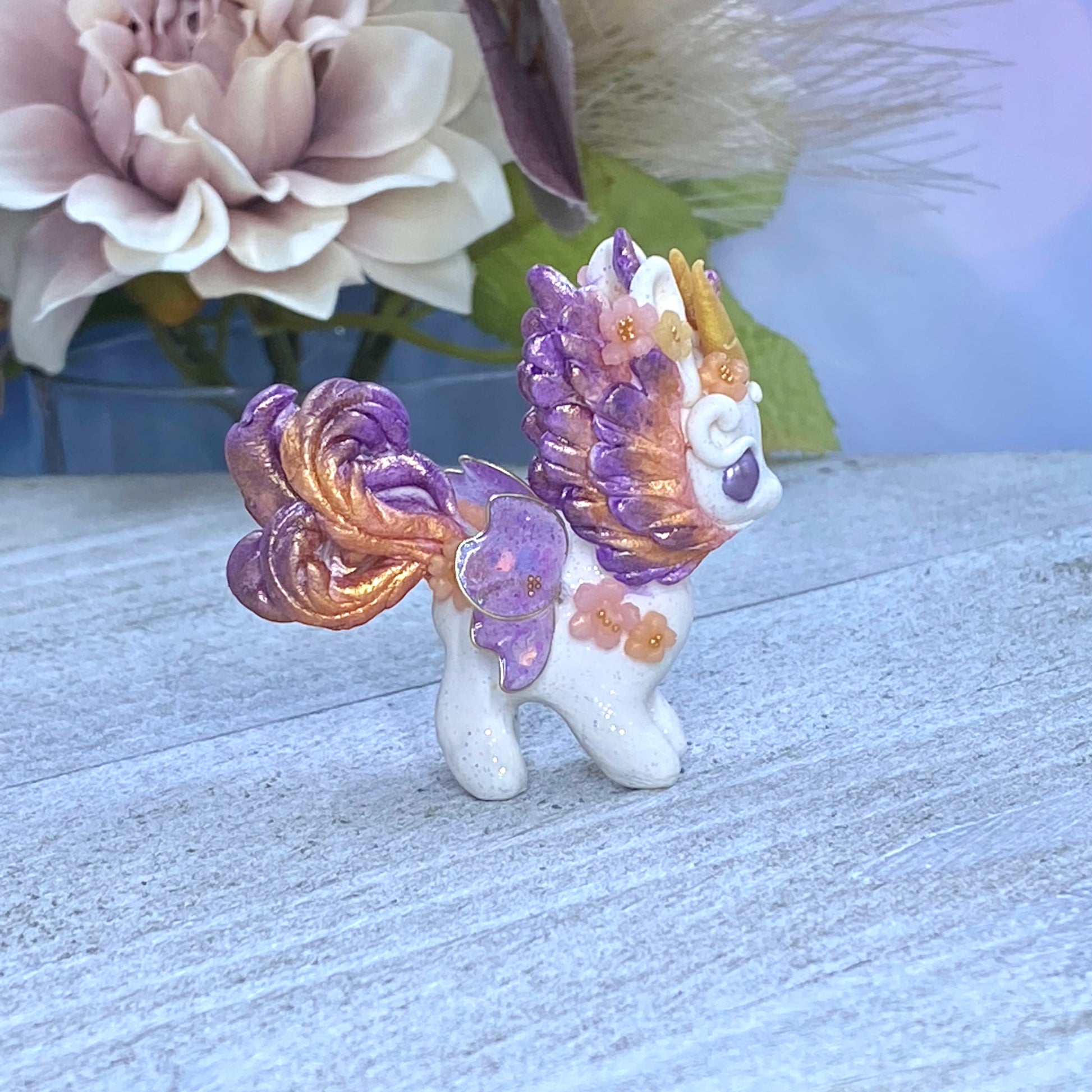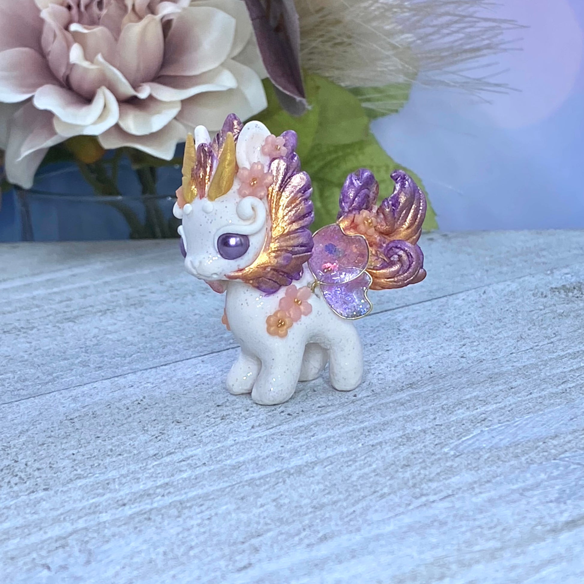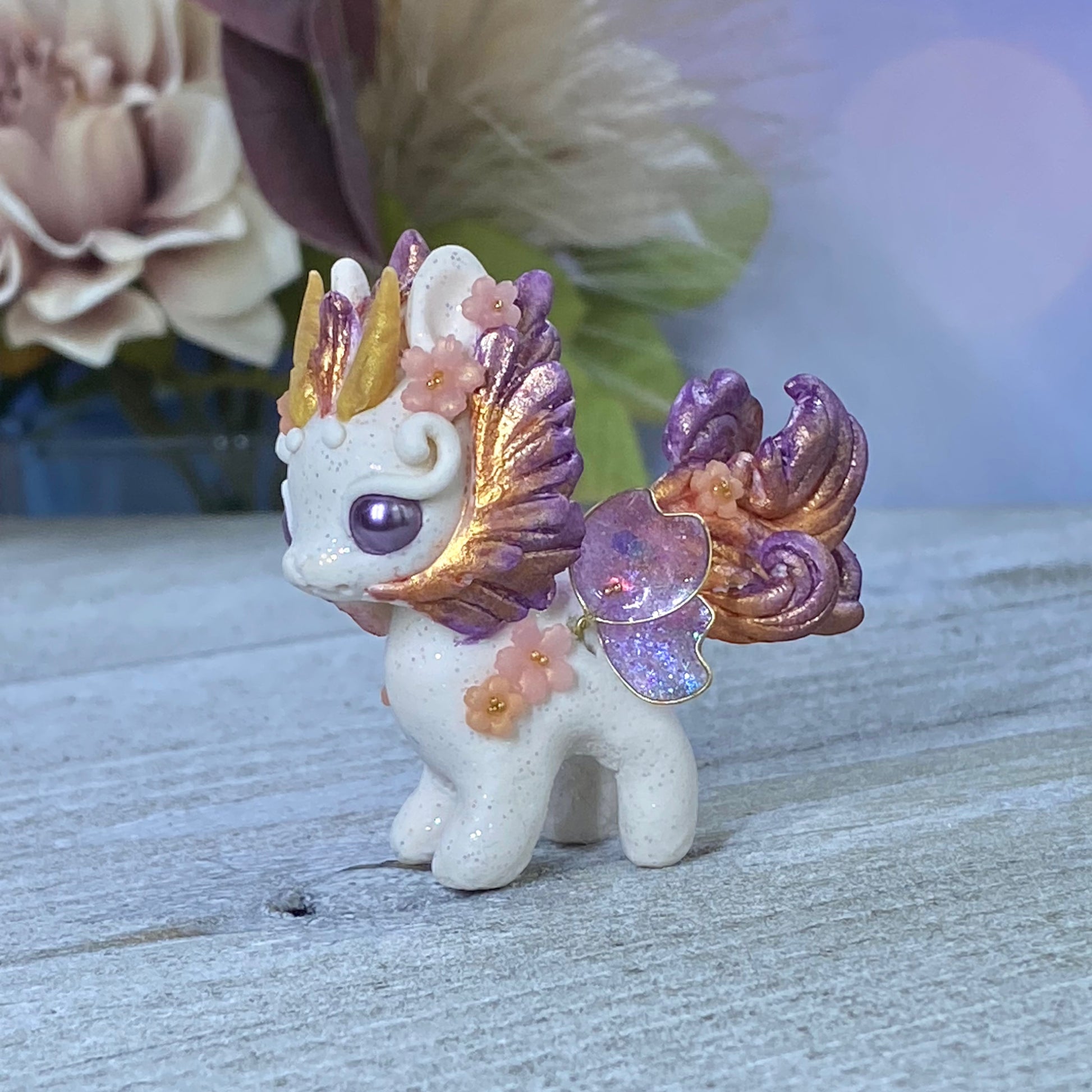 Introducing Sunset Bunnigon, a hand-sculpted work of art crafted from polymerclay, wire, resin and gold seed beads. Its captivating hues of plum, orange and gold will make a stunning addition to any home decor. Finished with delicate cherry blossom flowers, this piece of art is sure to become a treasured keepsake.