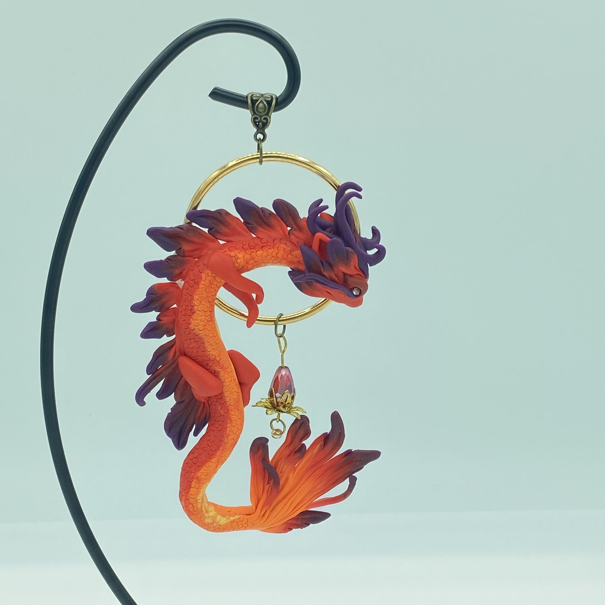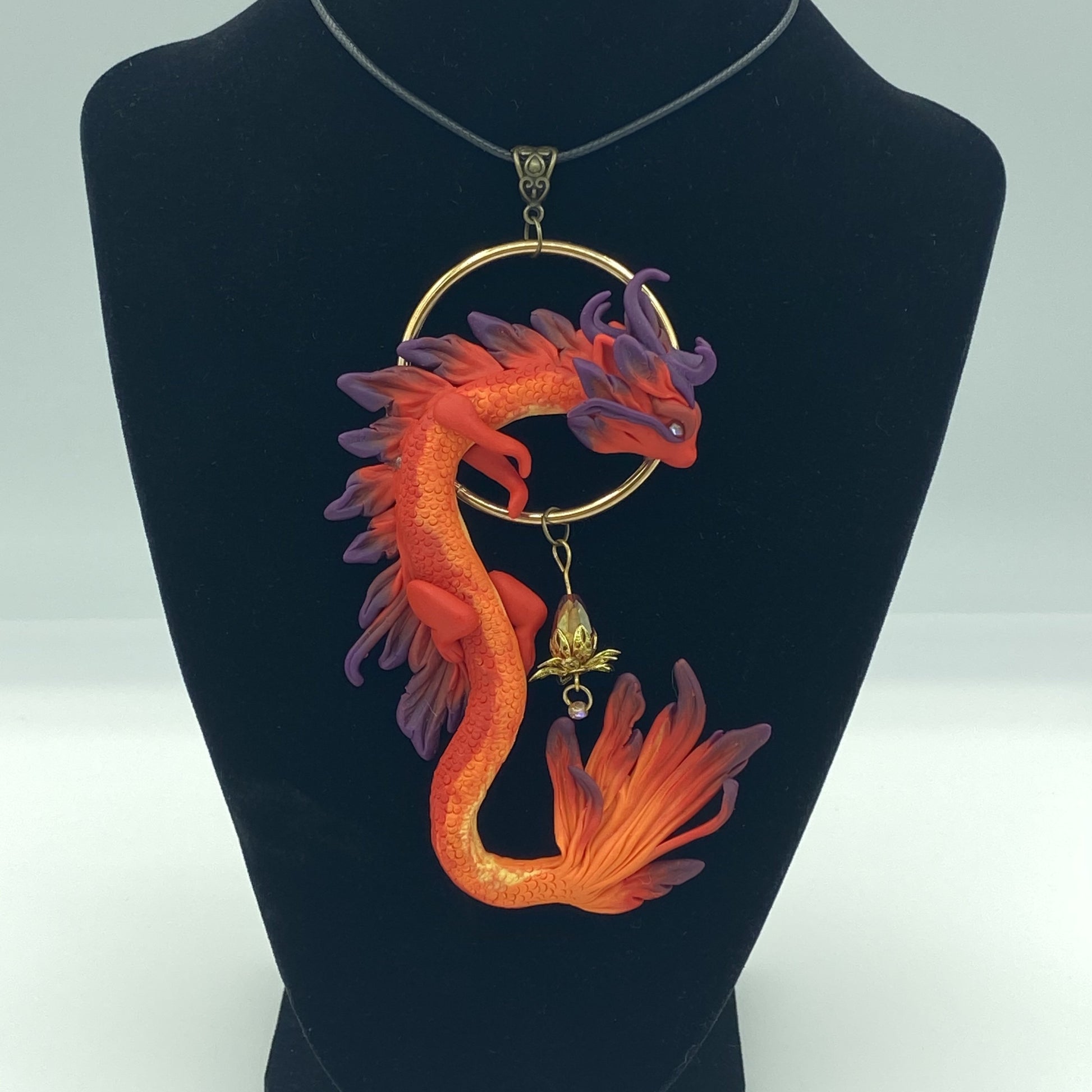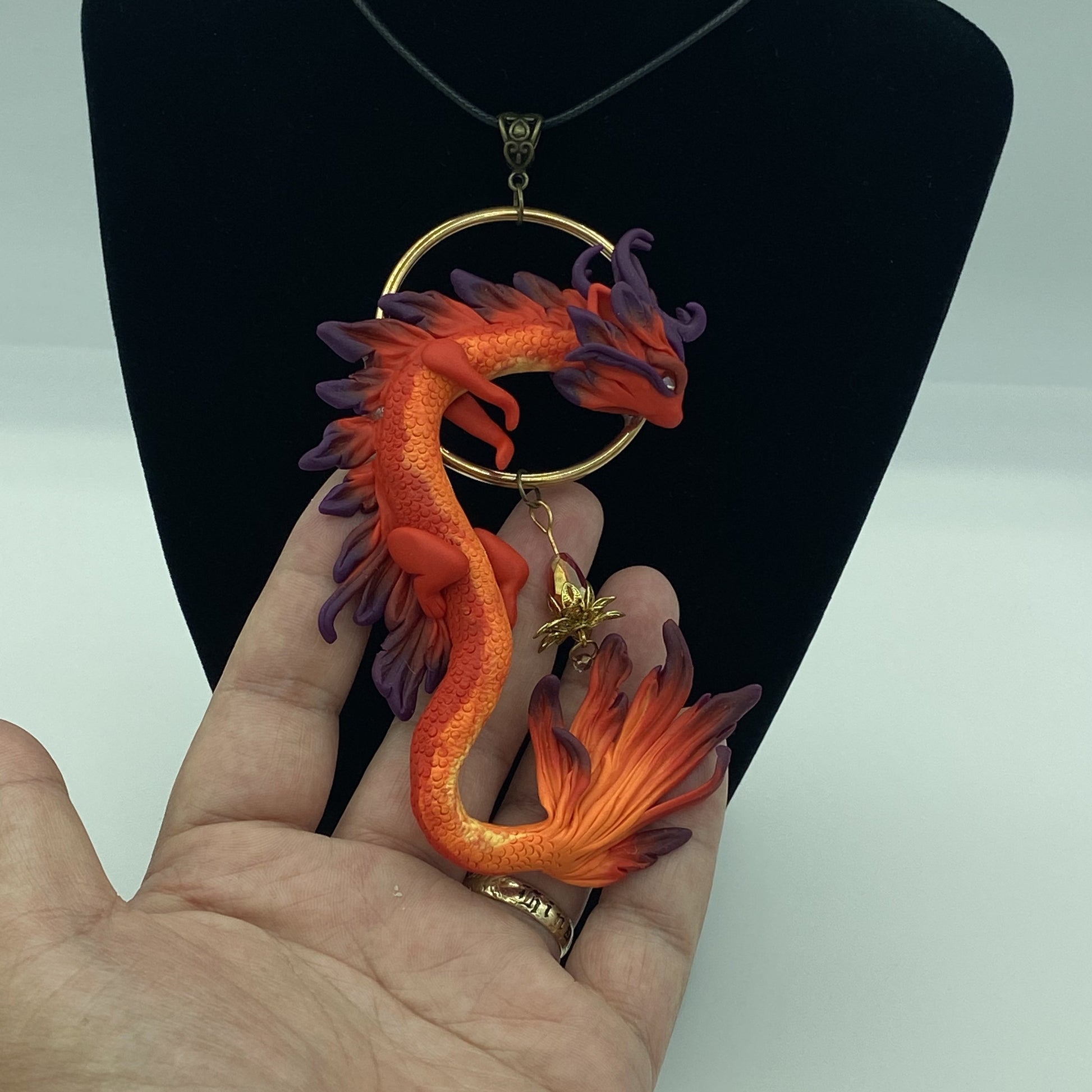Beautiful sunset dragon is made out of Polymer clay. All the fiery shades of sunset are captured in vibrant hues. He's attached to a gold ring with a pendant bail and would make a lovely wall decoration. He has swarovski crystal eyes.