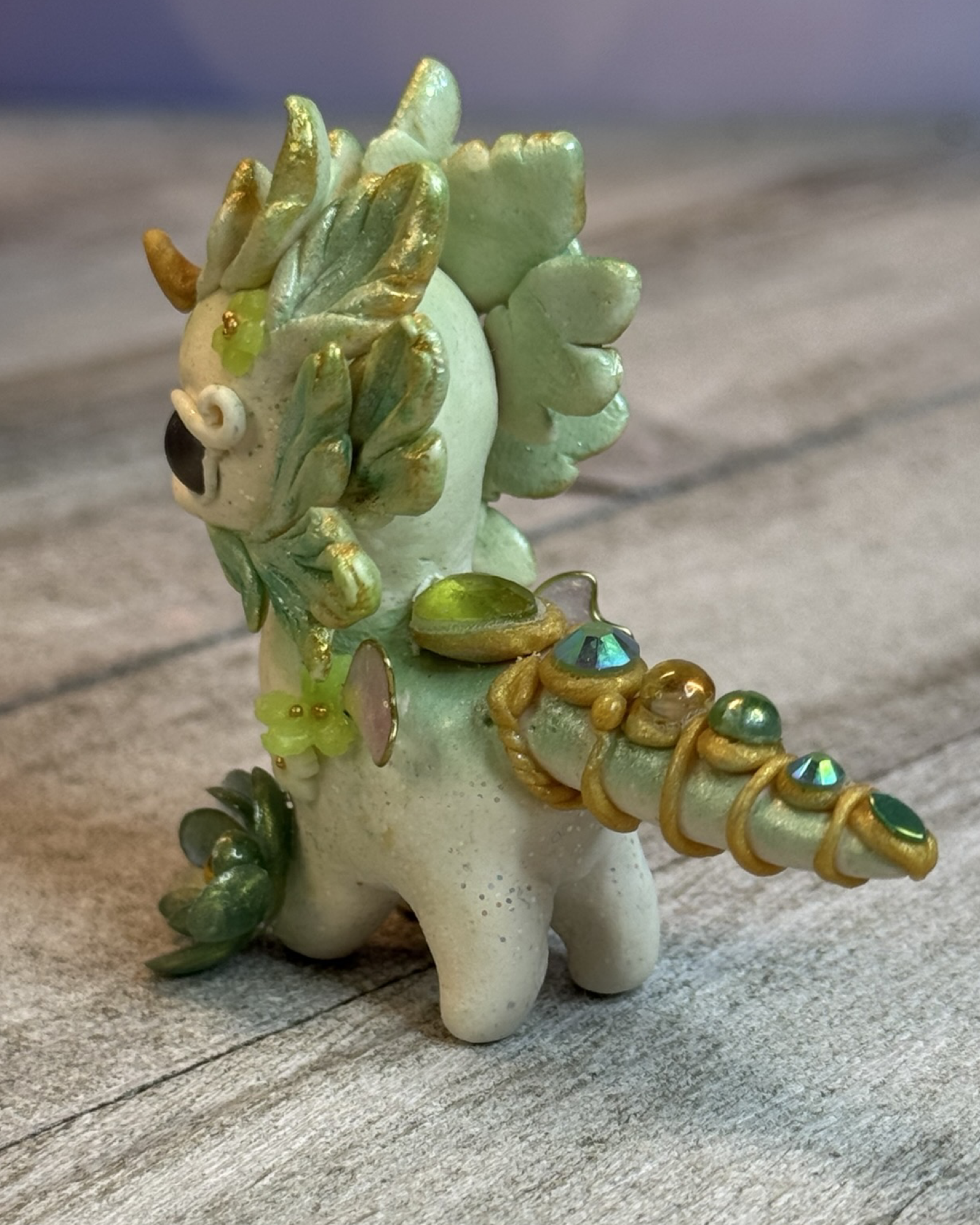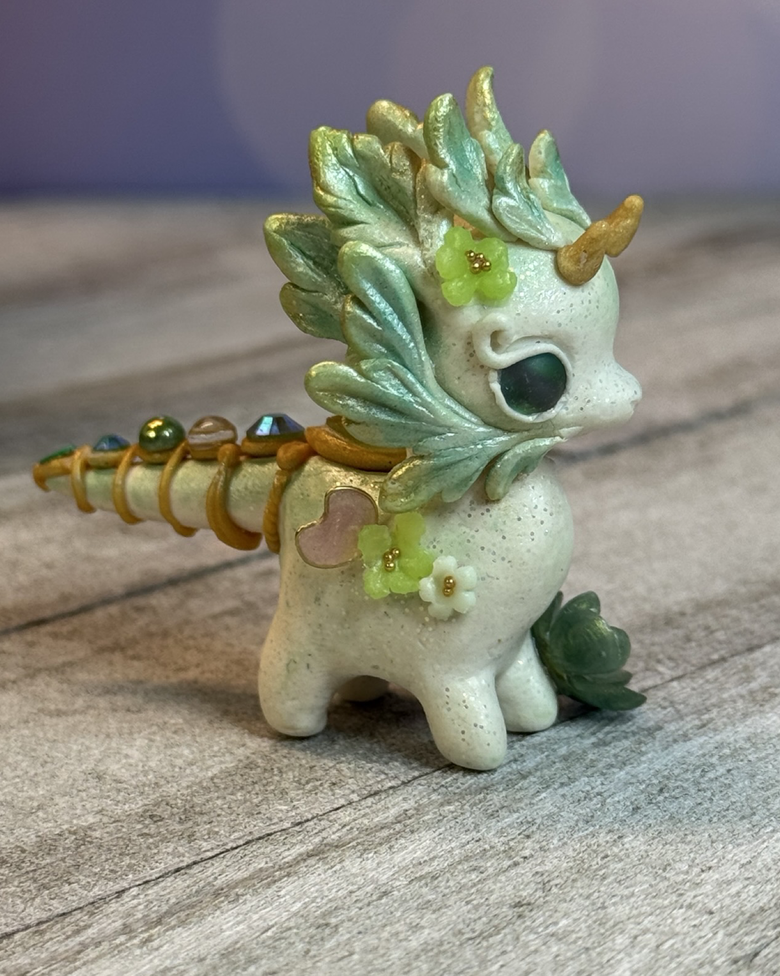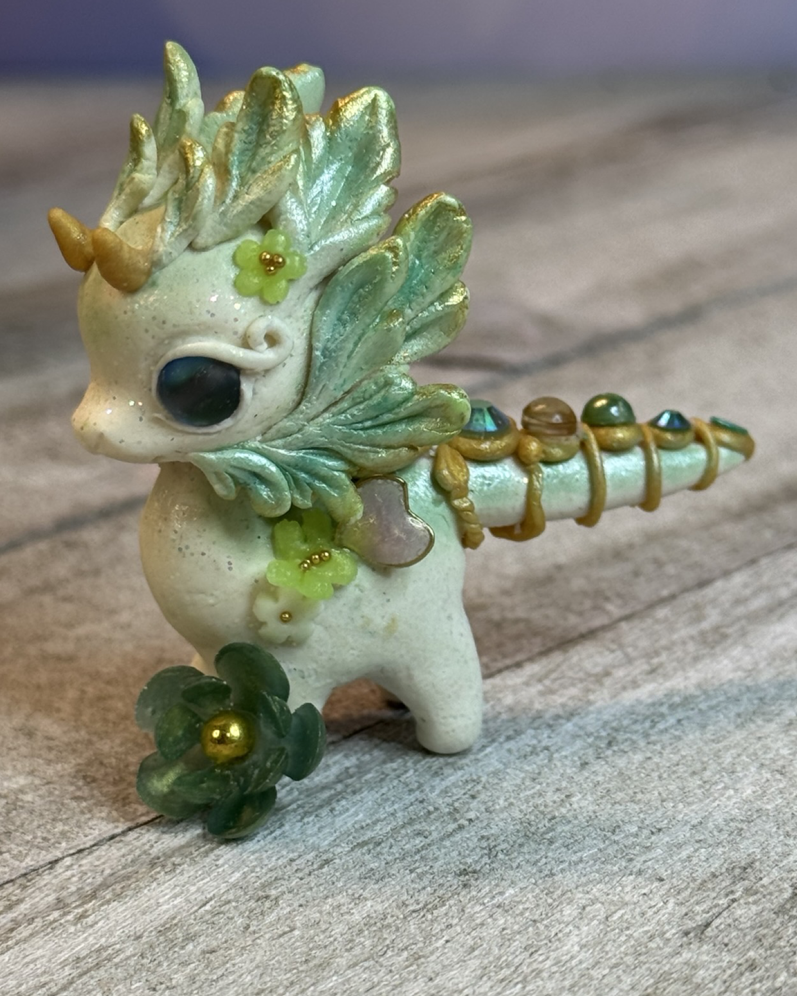 Meet your new desk companion, the Tiny Dragonfly Bunnigon! Handmade with love and attention to detail, this tiny pastel green creature features glass bead eyes, gold seed beads for flowers, and even a small, hand sculpted resin flower petal. With faux crystals and a glass bead tail, it's the perfect blend of charm and whimsy. Bring a touch of playful joy to your workspace with this little cutie.