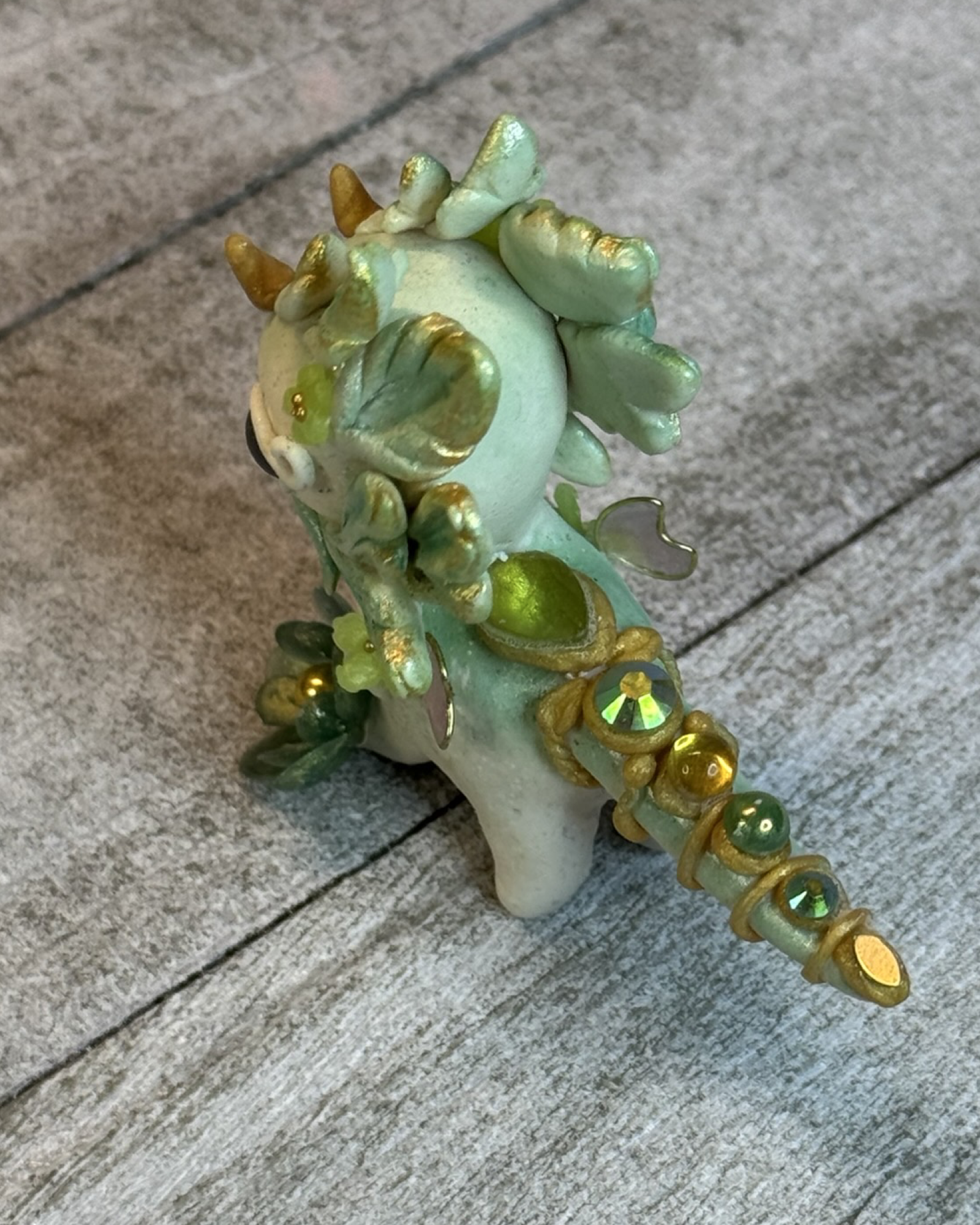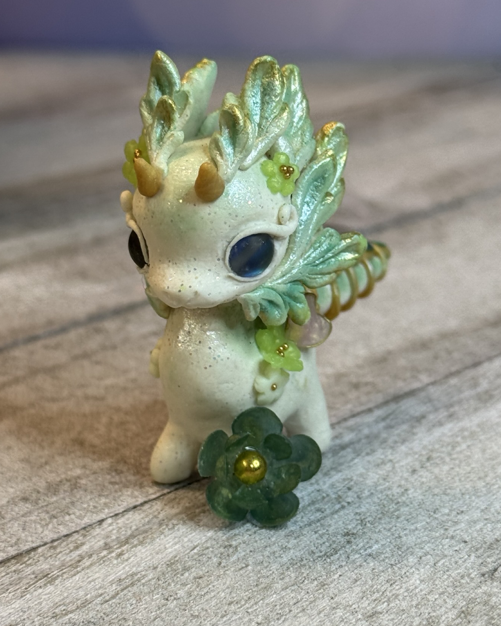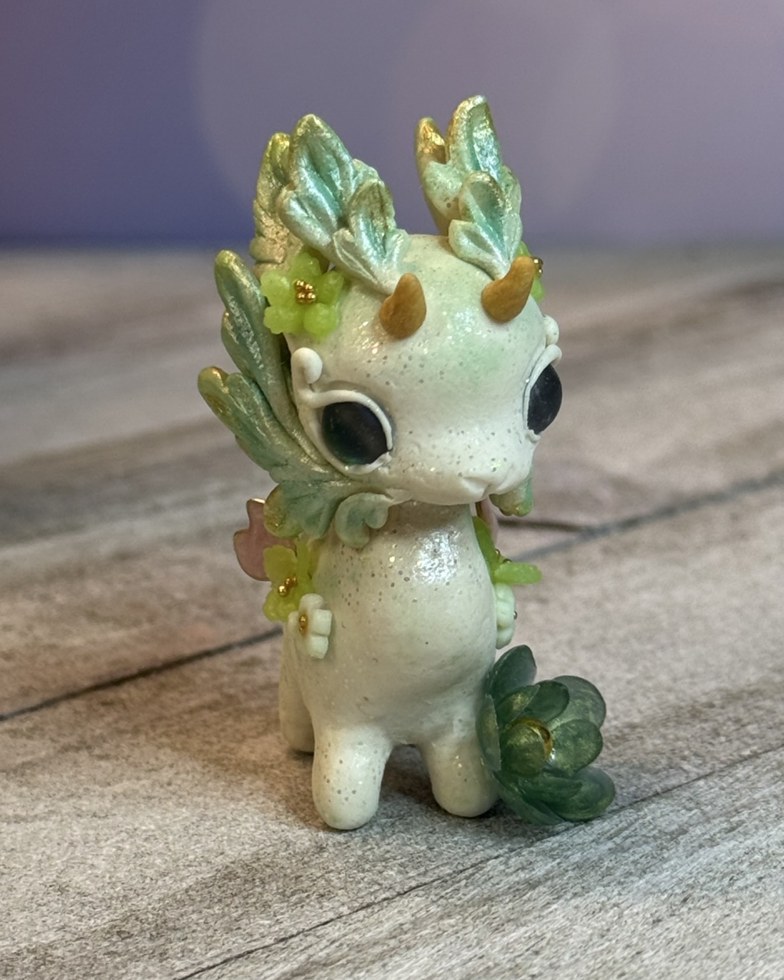 Meet your new desk companion, the Tiny Dragonfly Bunnigon! Handmade with love and attention to detail, this tiny pastel green creature features glass bead eyes, gold seed beads for flowers, and even a small, hand sculpted resin flower petal. With faux crystals and a glass bead tail, it's the perfect blend of charm and whimsy. Bring a touch of playful joy to your workspace with this little cutie.