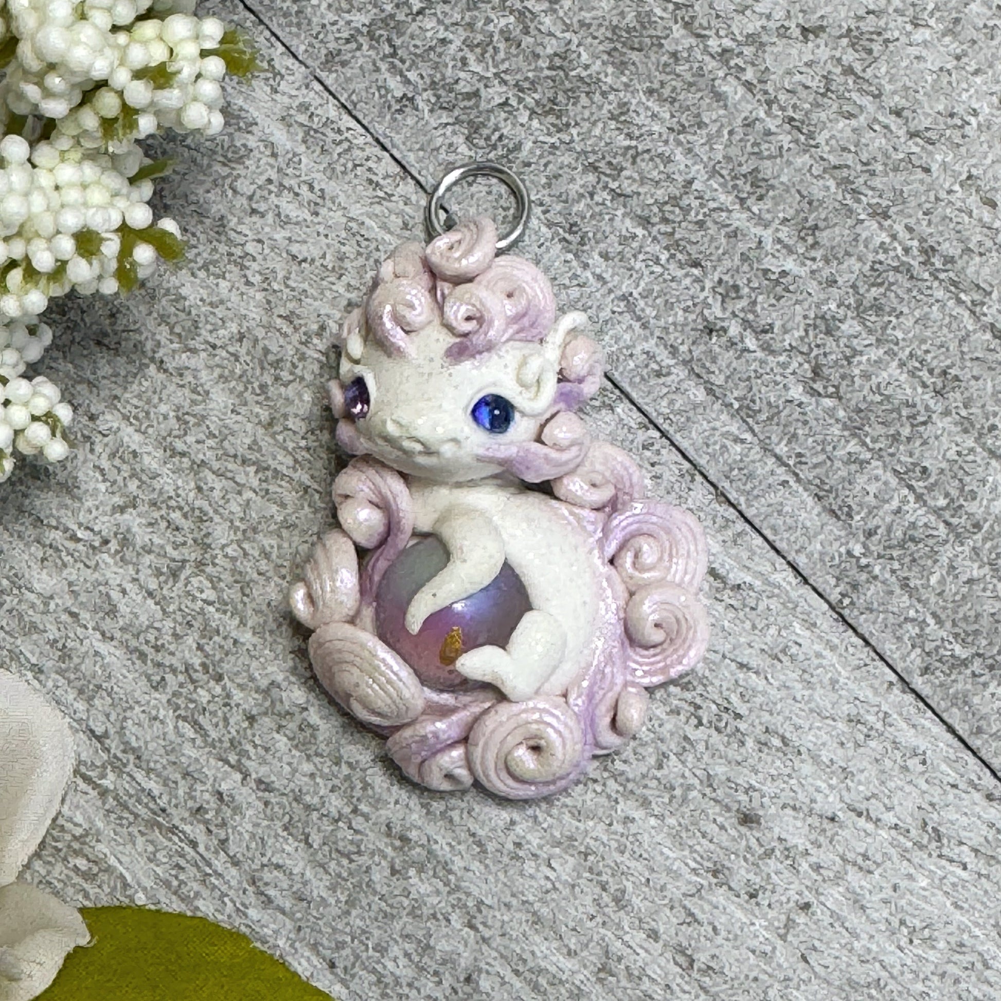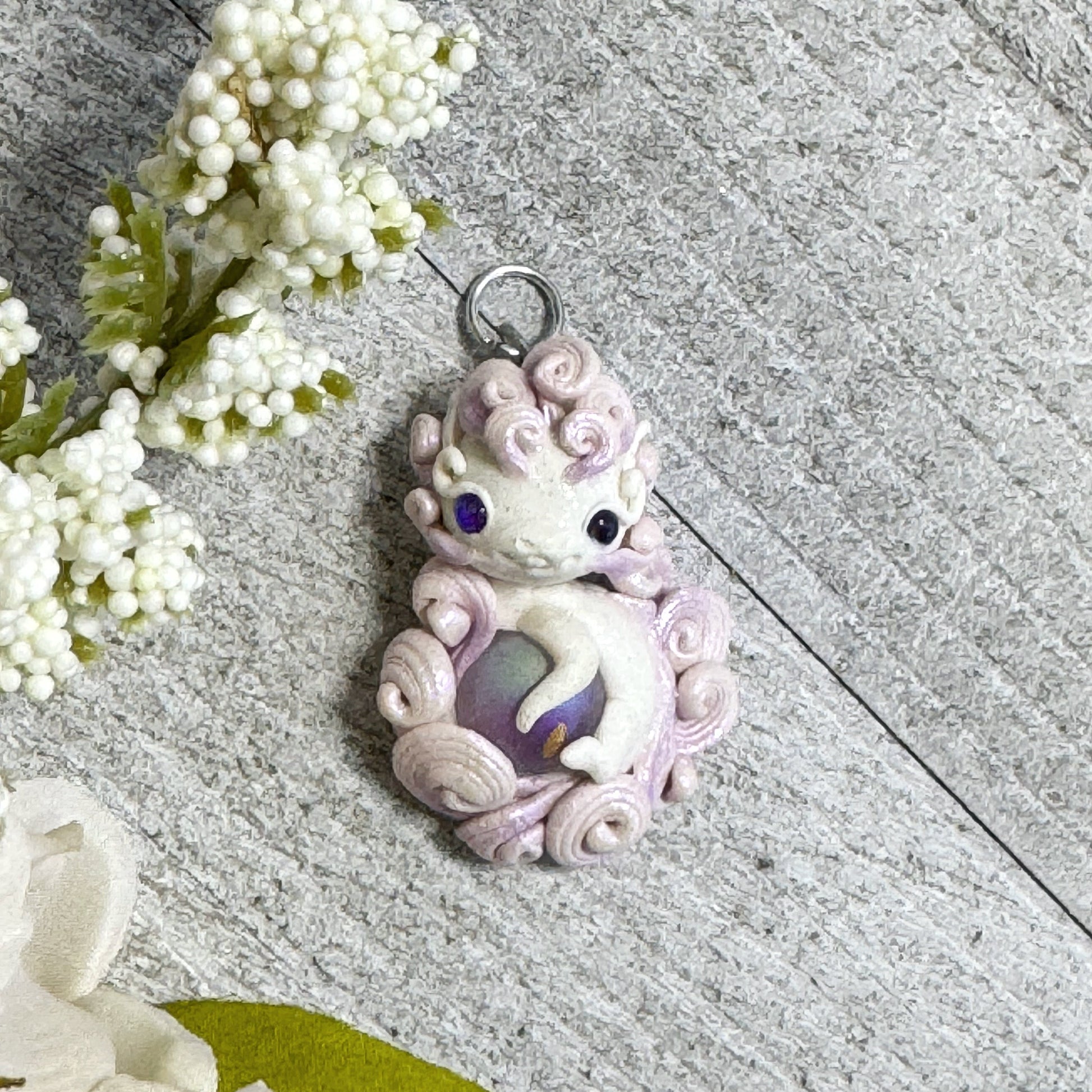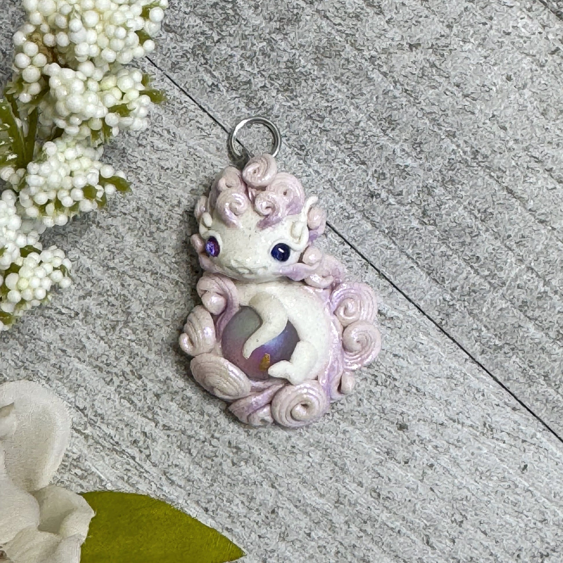 This Mini Purple and White Baby Dragon Pendant is a whimsical treasure crafted from polymer clay and topped with a shimmering glass cabochon. Its iridescent pigments and glass marble details catch the light, making your new tiny dragon friend sparkle with magic. Comes ready to wear on an 18" leather cord necklace—perfect for adding a playful touch to any outfit. Each piece is one-of-a-kind, just like your little dragon companion!