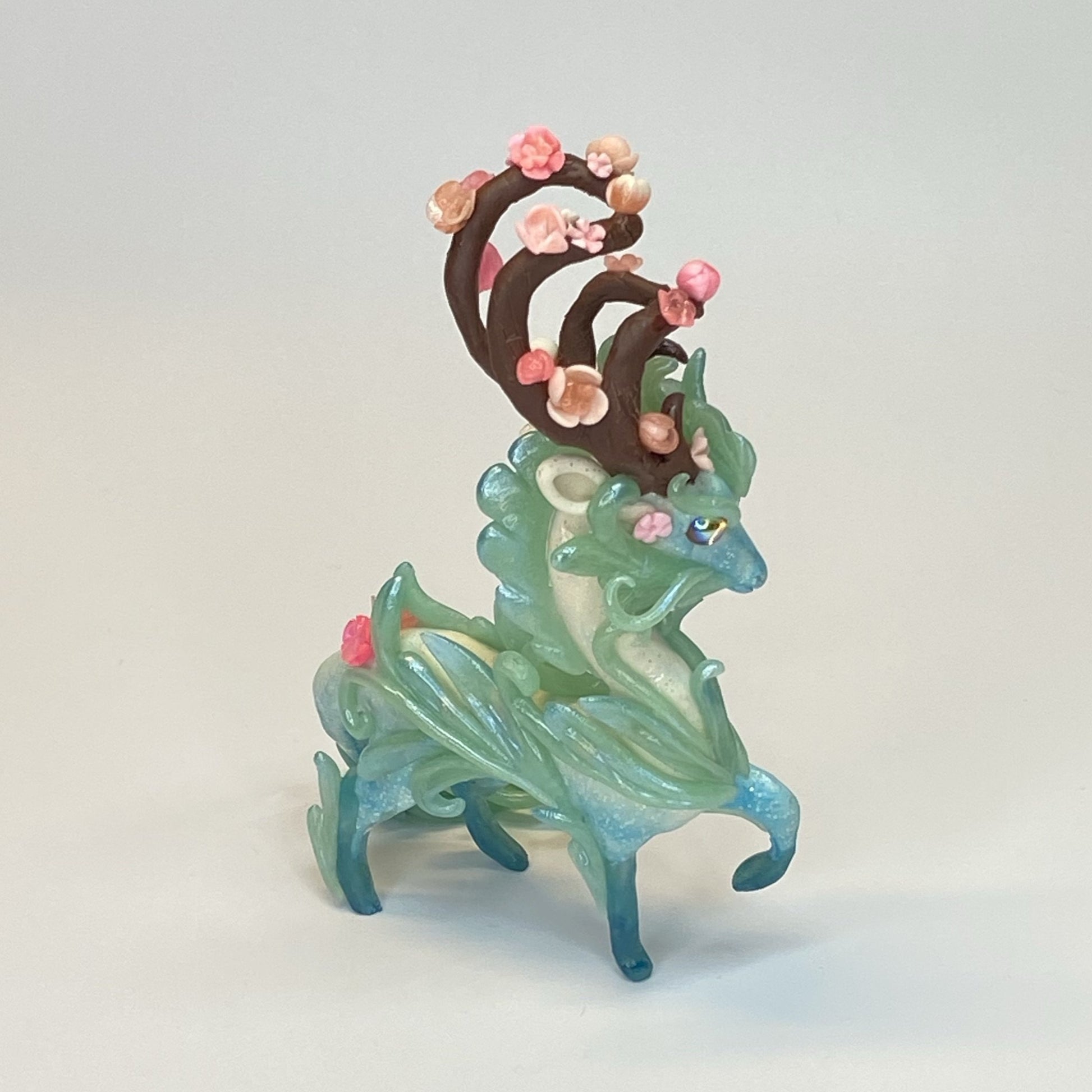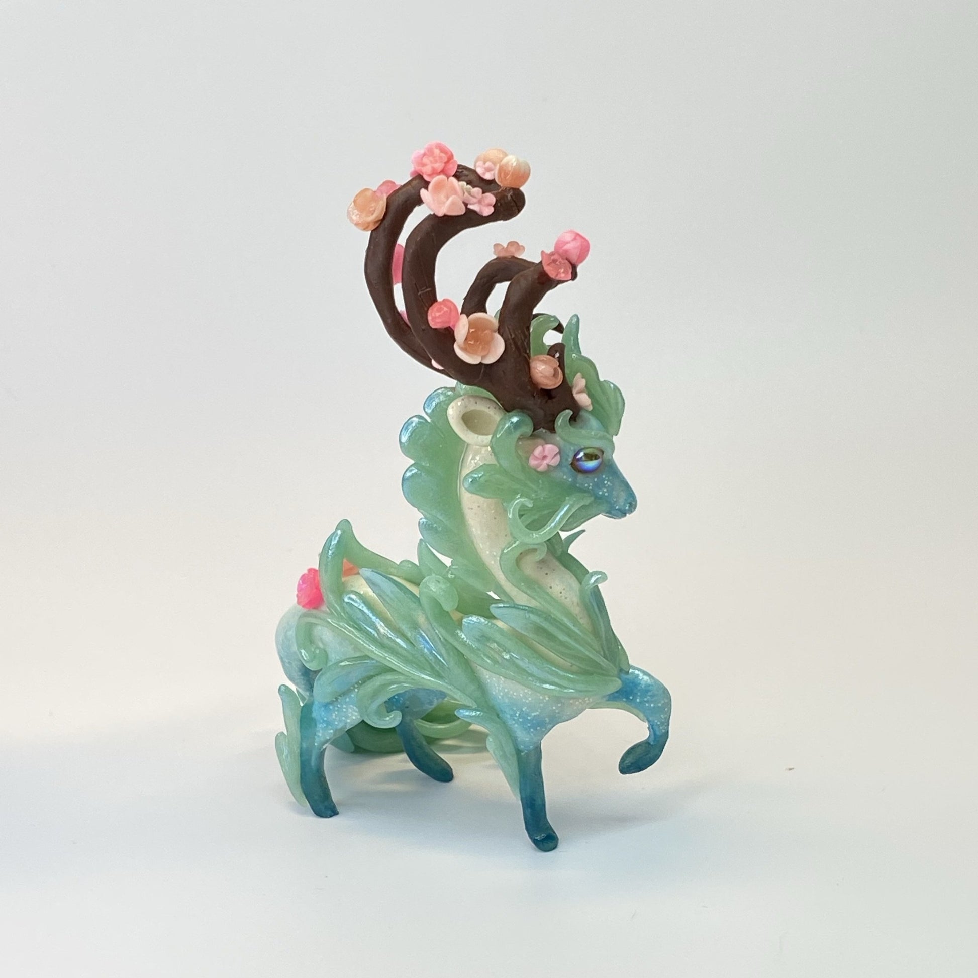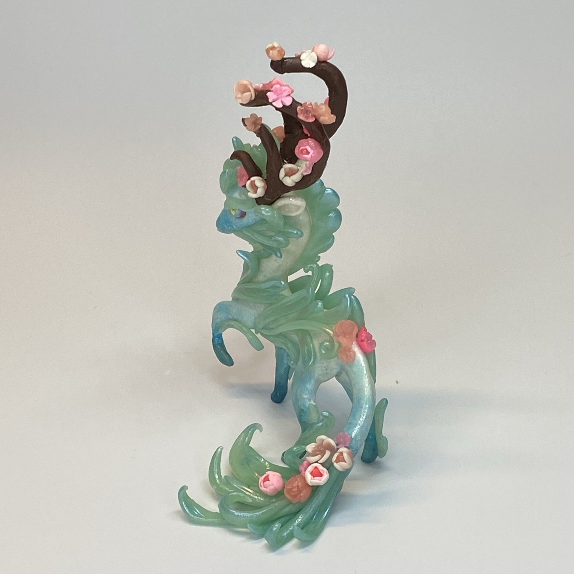 Water blossom dragon walks along the banks of rivers, waterfalls and waterways, purifying the water that gives all plants and blossoms life. Sculpted by hand out of Premo White frost and premo translucent polymer clays, accented with pastel chalks and adorned with pink blossoms. AB coated czech glass cabochons for eyes.