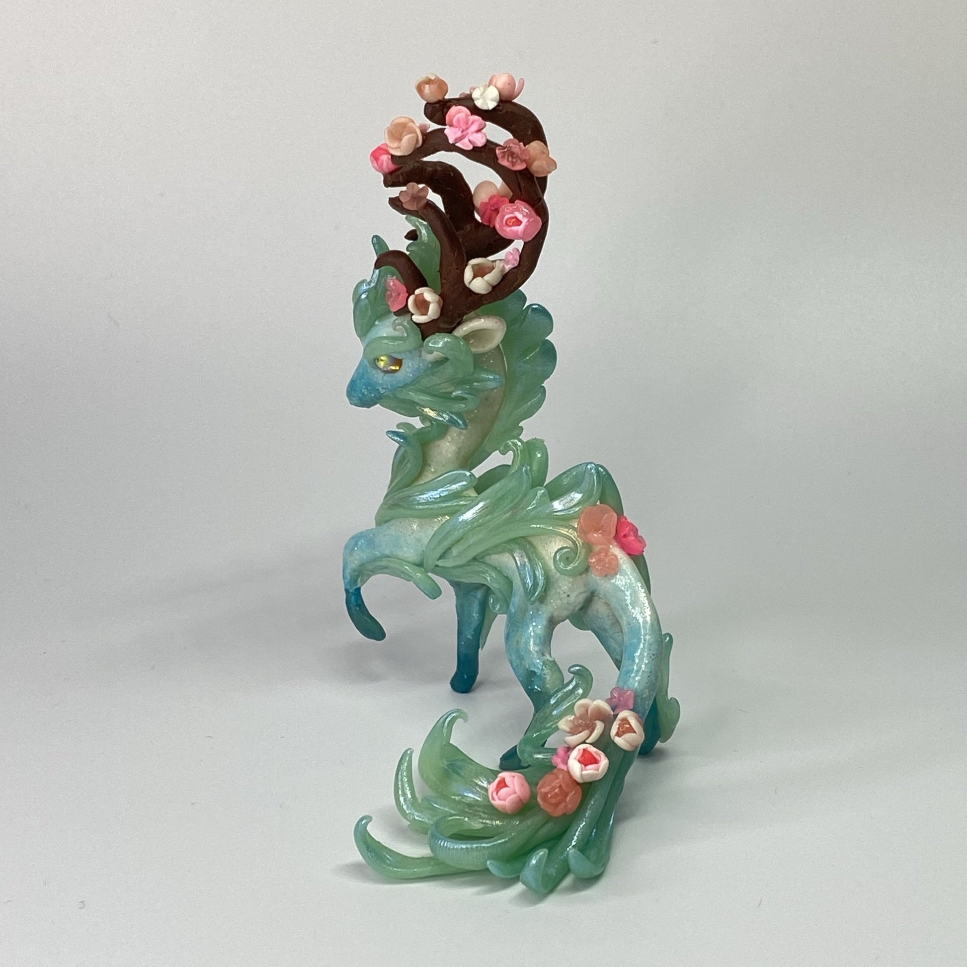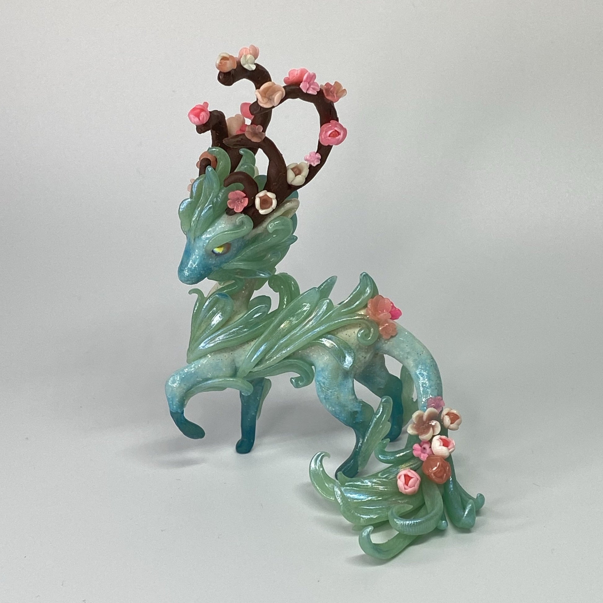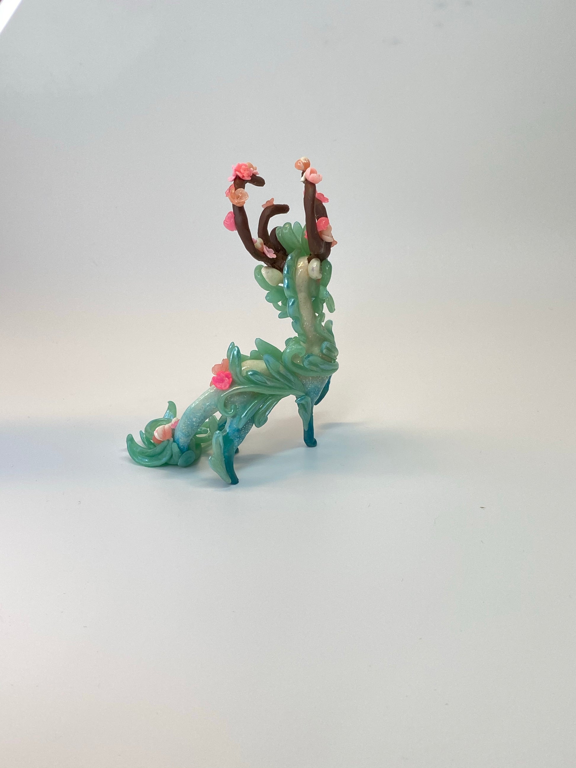 Water blossom dragon walks along the banks of rivers, waterfalls and waterways, purifying the water that gives all plants and blossoms life. Sculpted by hand out of Premo White frost and premo translucent polymer clays, accented with pastel chalks and adorned with pink blossoms. AB coated czech glass cabochons for eyes.