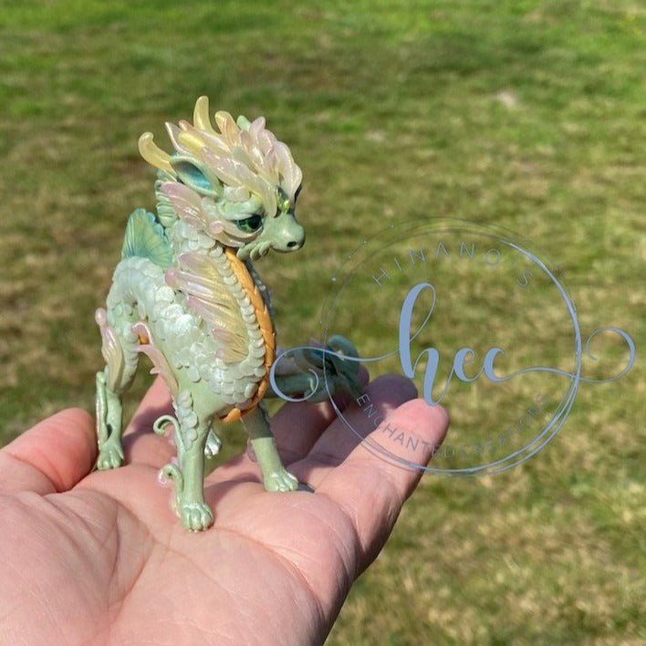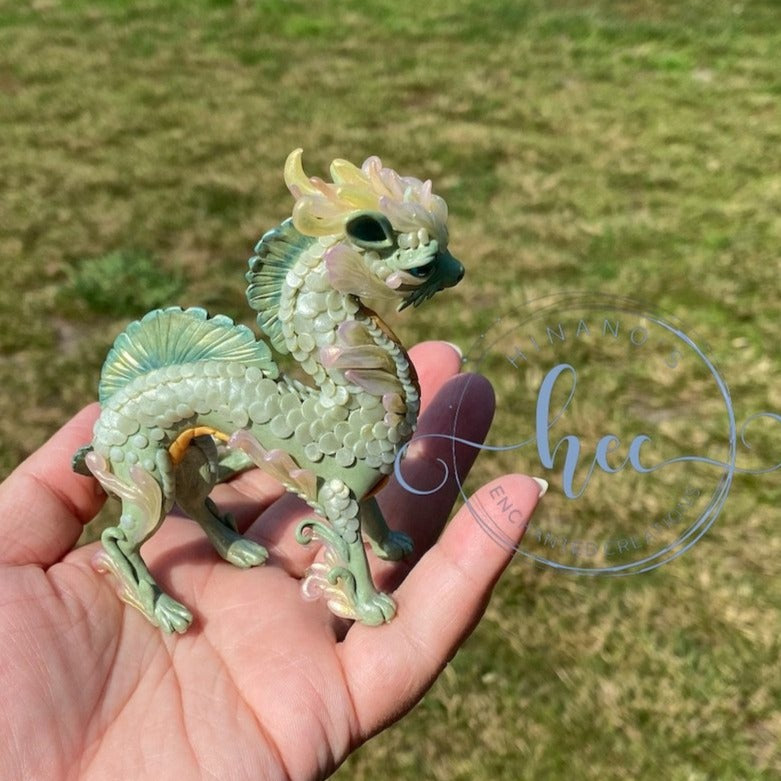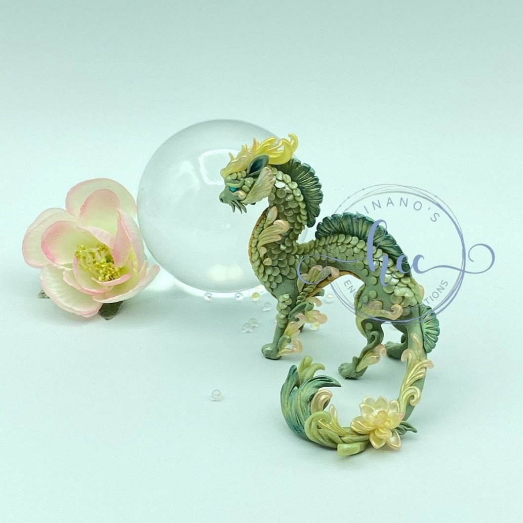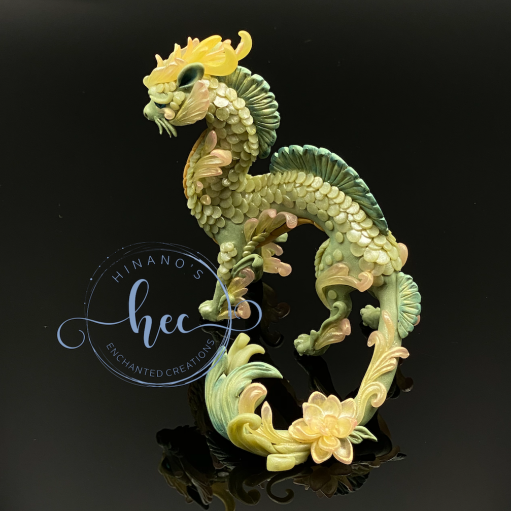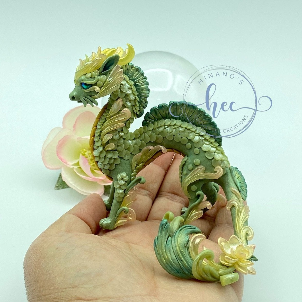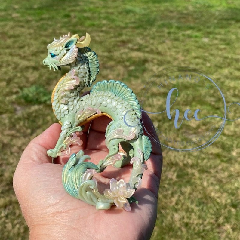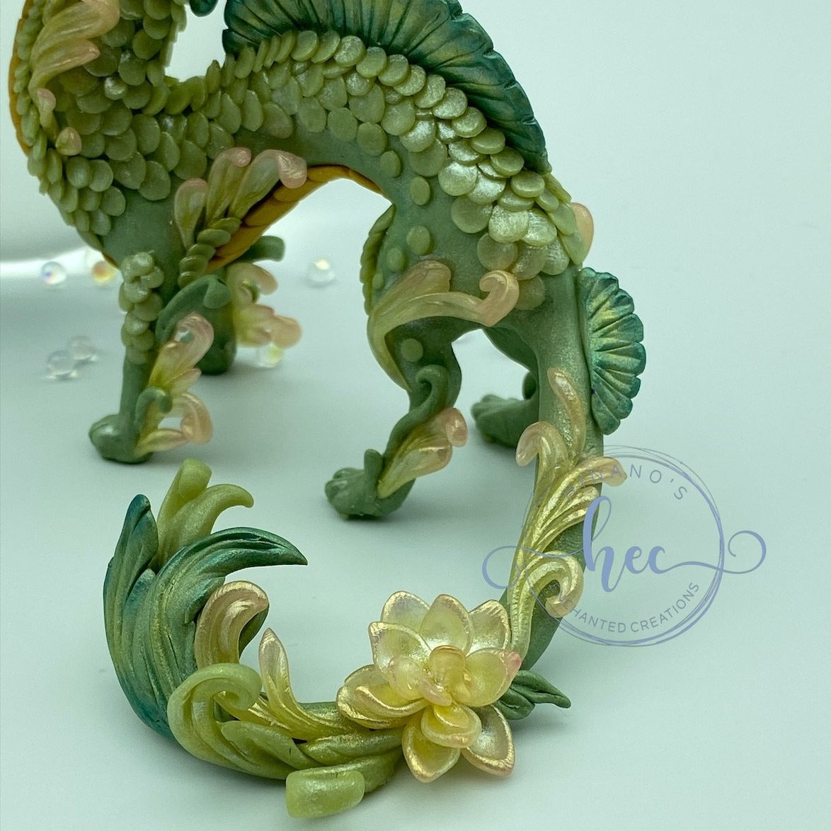 She is sculpted by hand out of Sculpey Premo Clay. She's sage green with shimmering scales and adorned with transluscent flower petals. She shimmers in the sun. Her eyes are made of rainbow hematite beads.