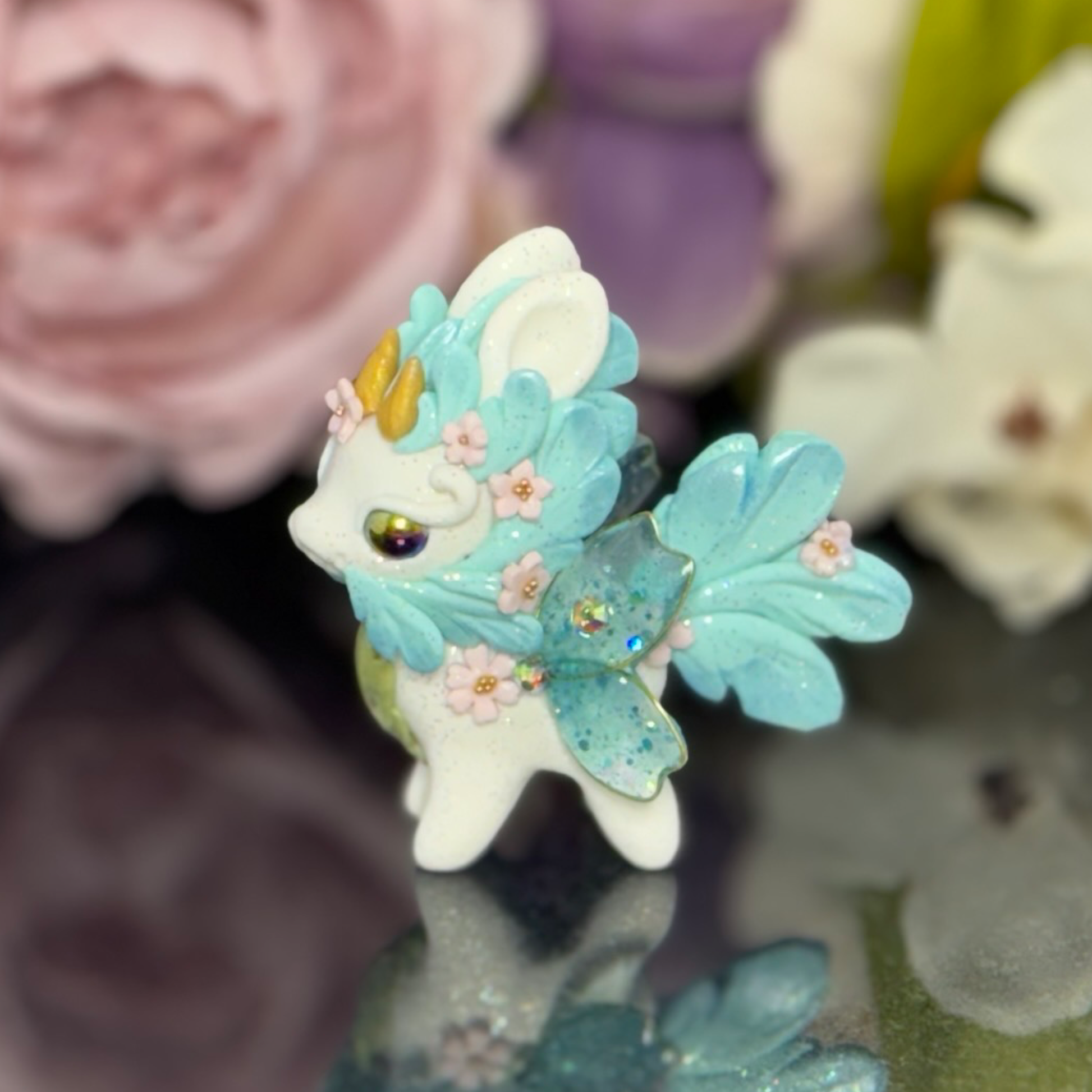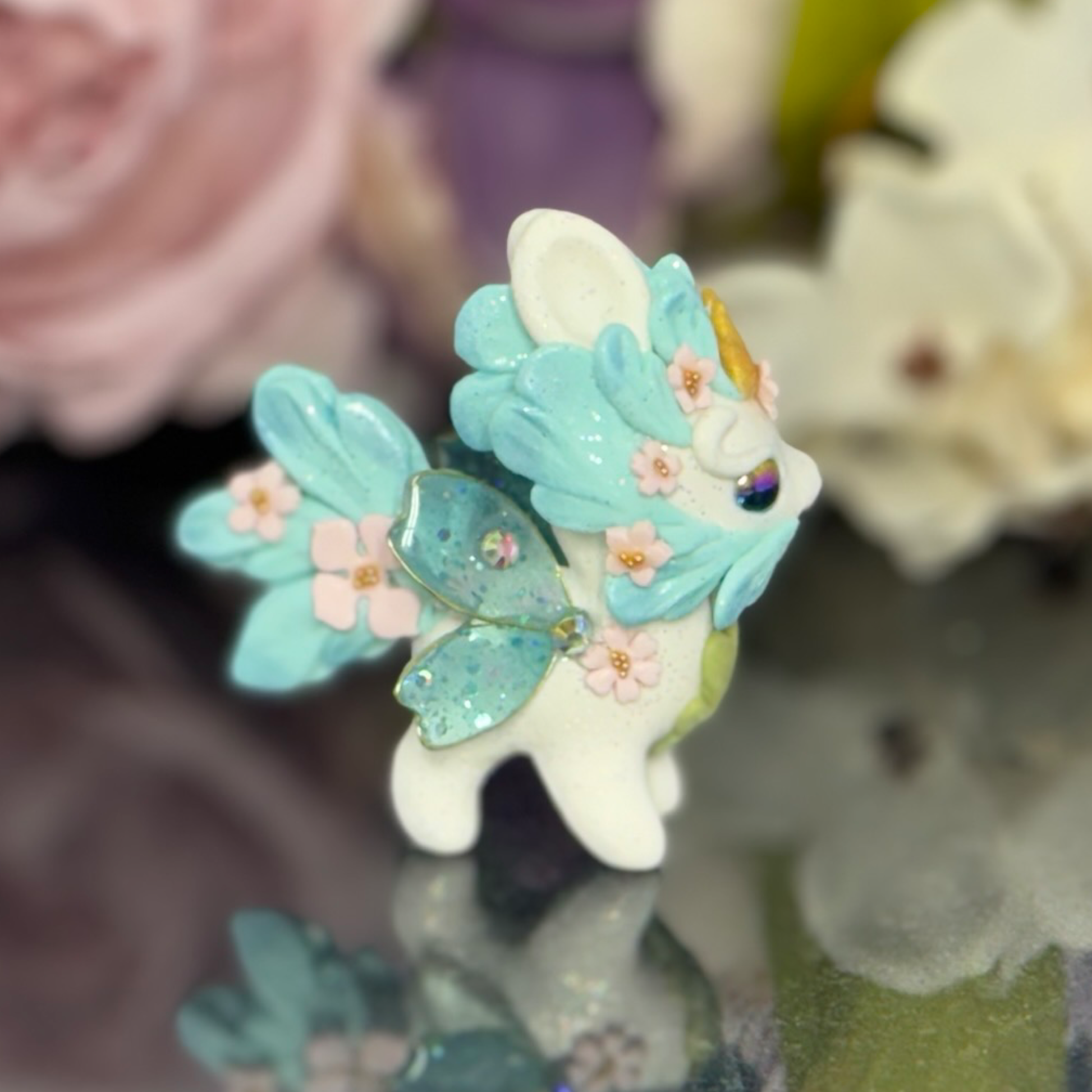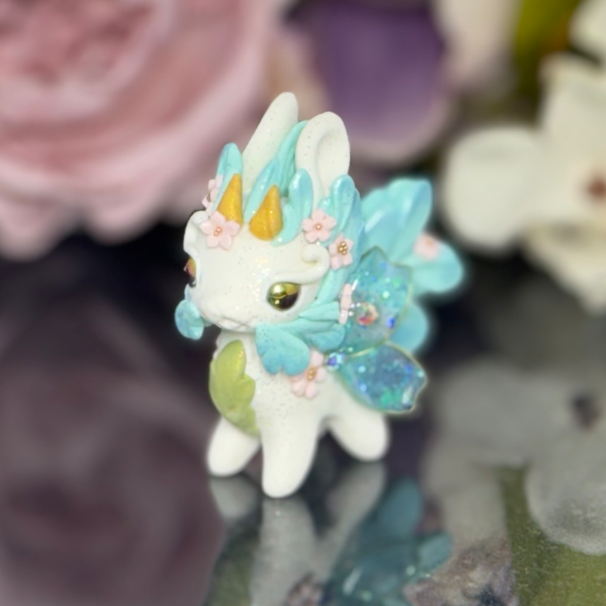 Upgrade your desk with our White and Blue Bunnigon, a polymer clay figurine with glass and gold seed bead accents. Adorned with pigment powders and wire, complete with UV resin sakura petal wings. Elevate your space with this expertly crafted companion.