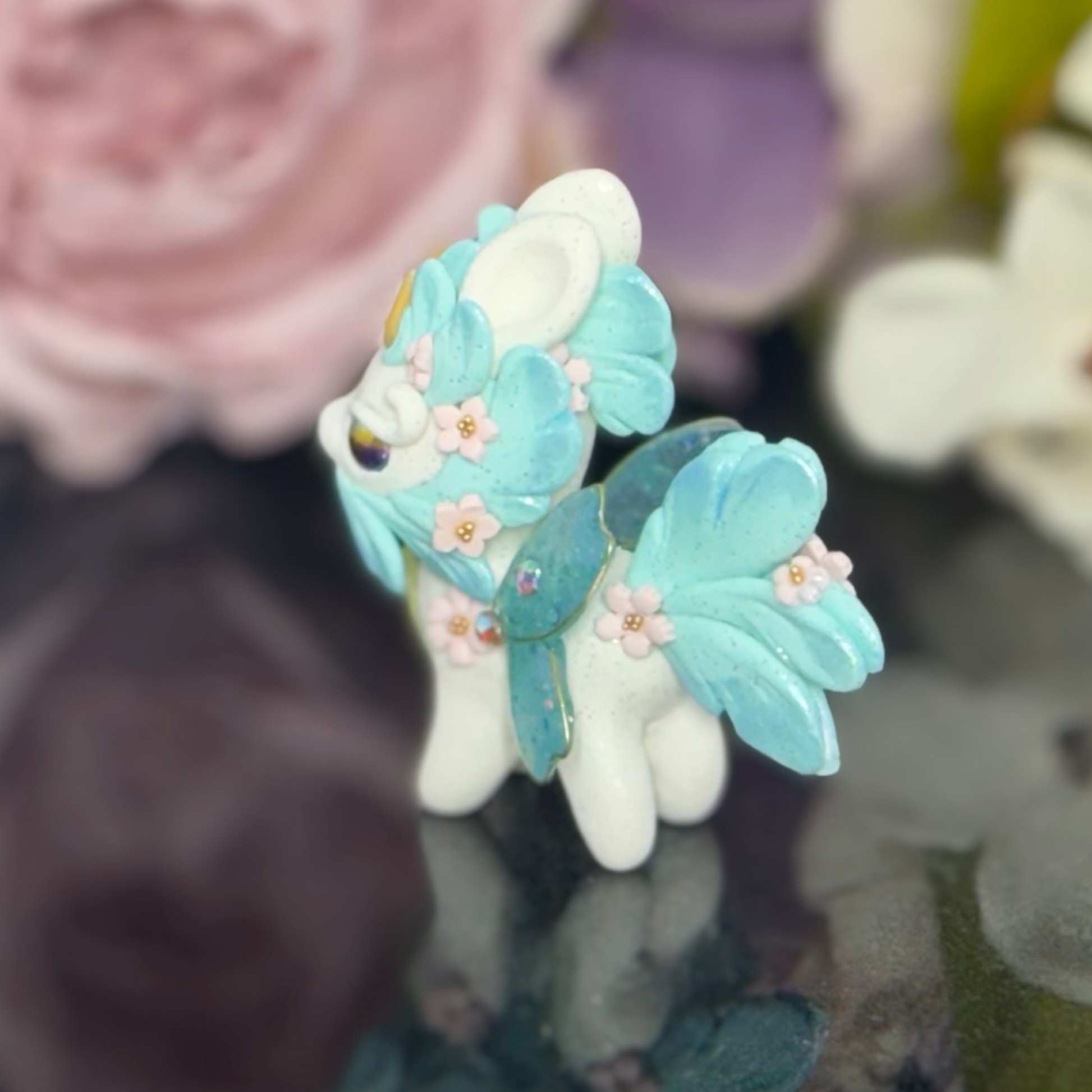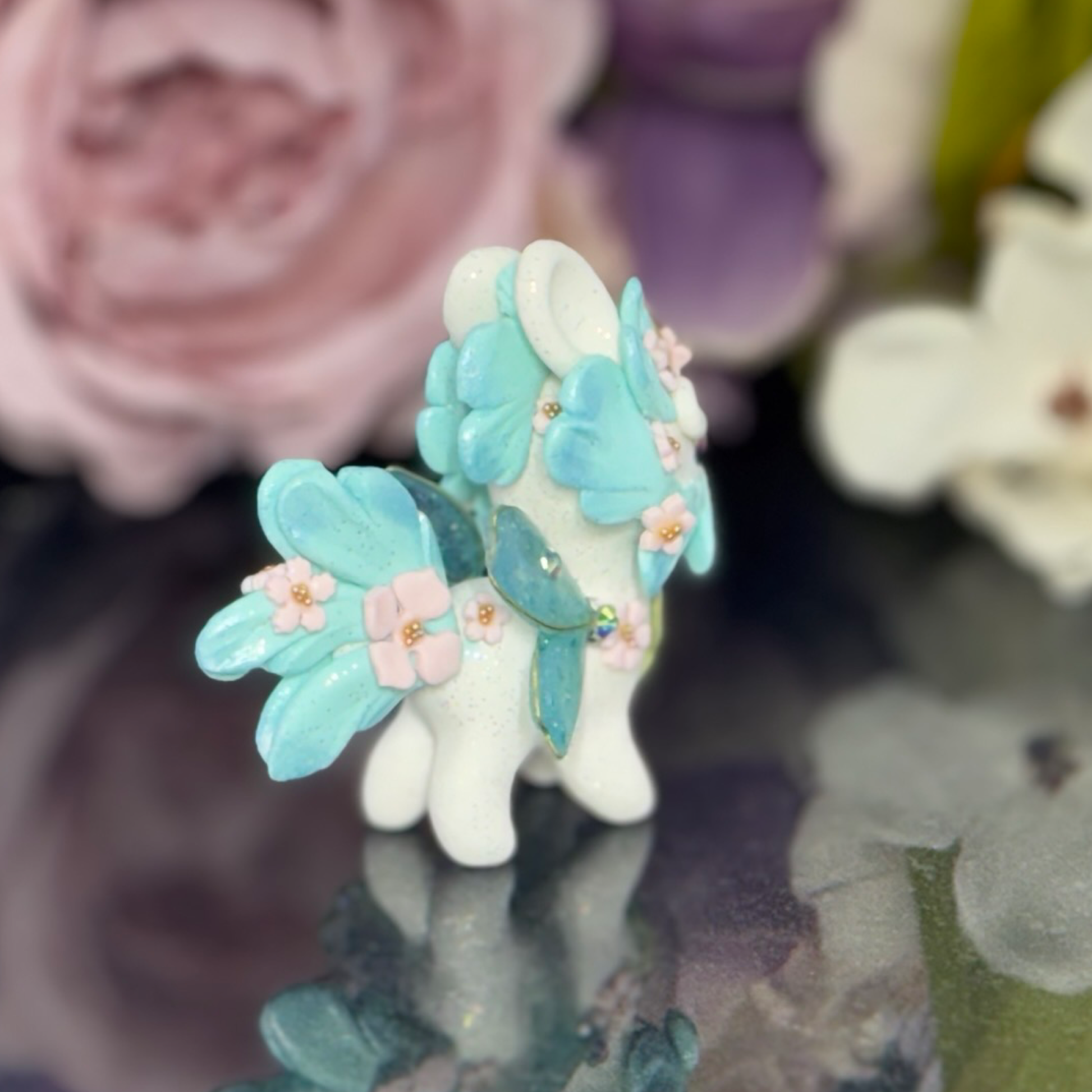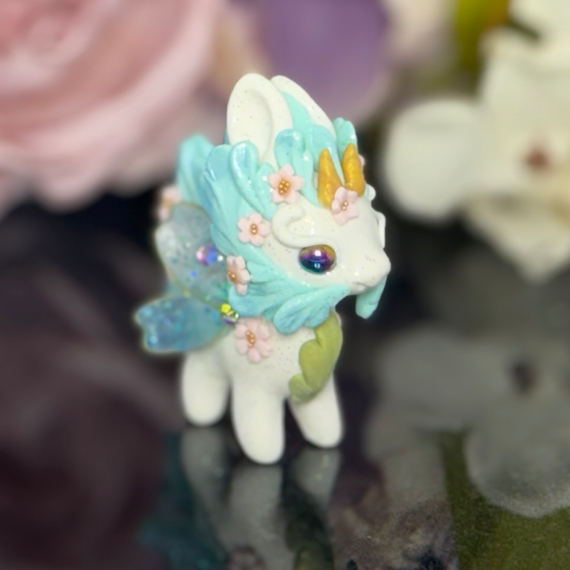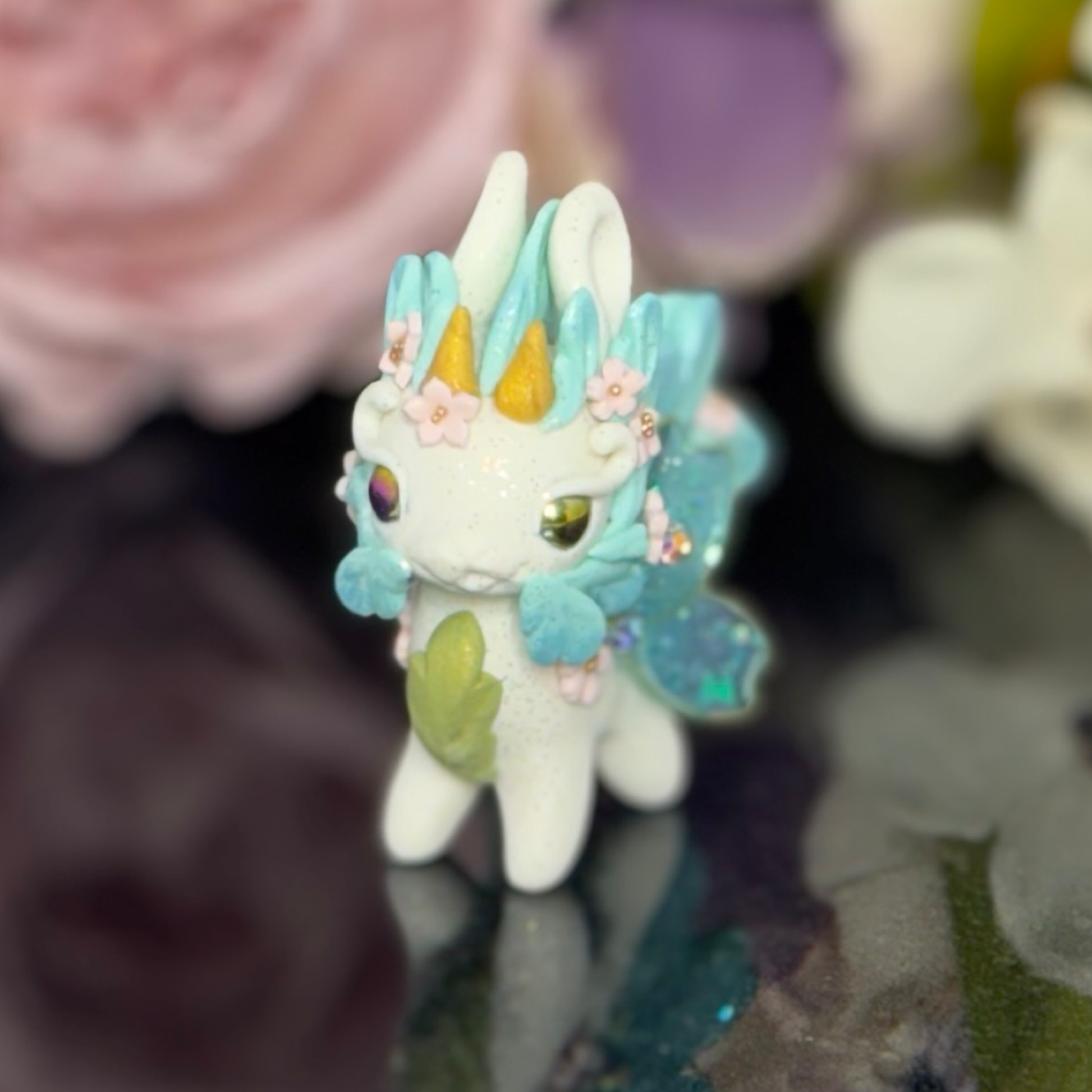 Upgrade your desk with our White and Blue Bunnigon, a polymer clay figurine with glass and gold seed bead accents. Adorned with pigment powders and wire, complete with UV resin sakura petal wings. Elevate your space with this expertly crafted companion.