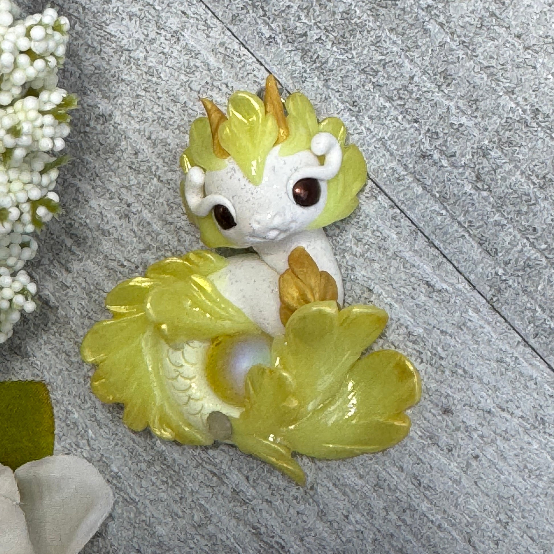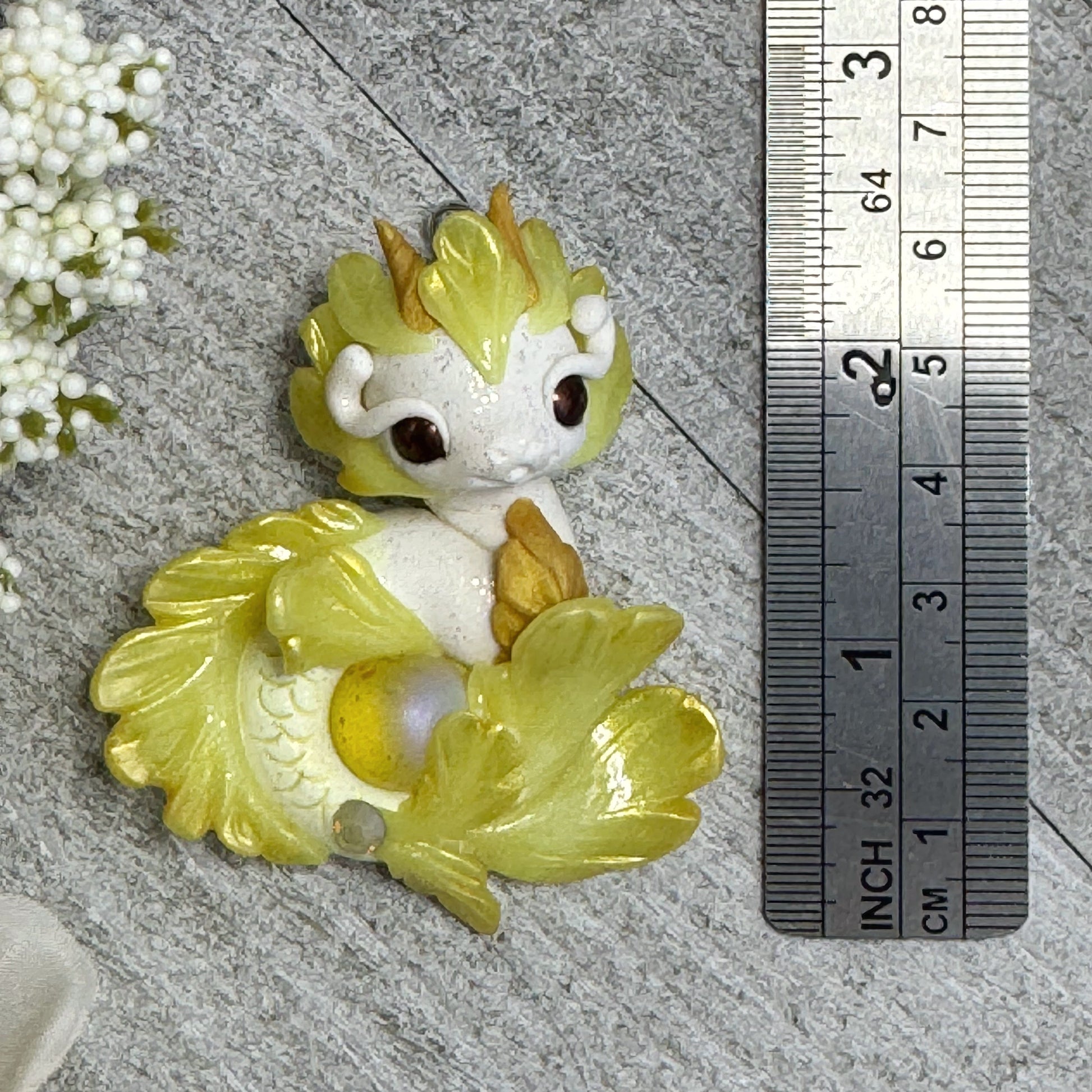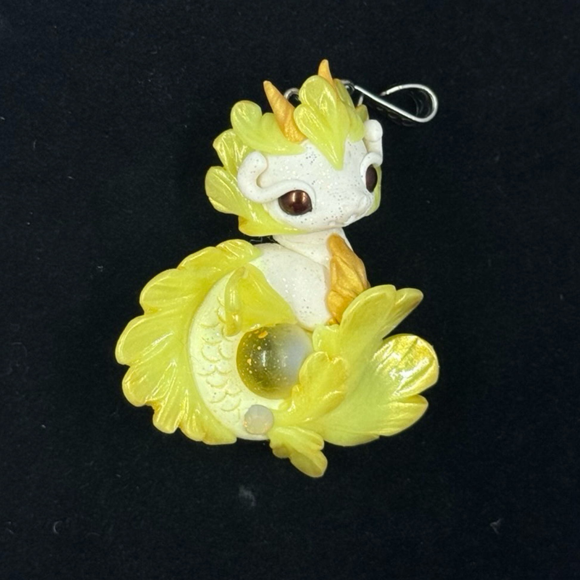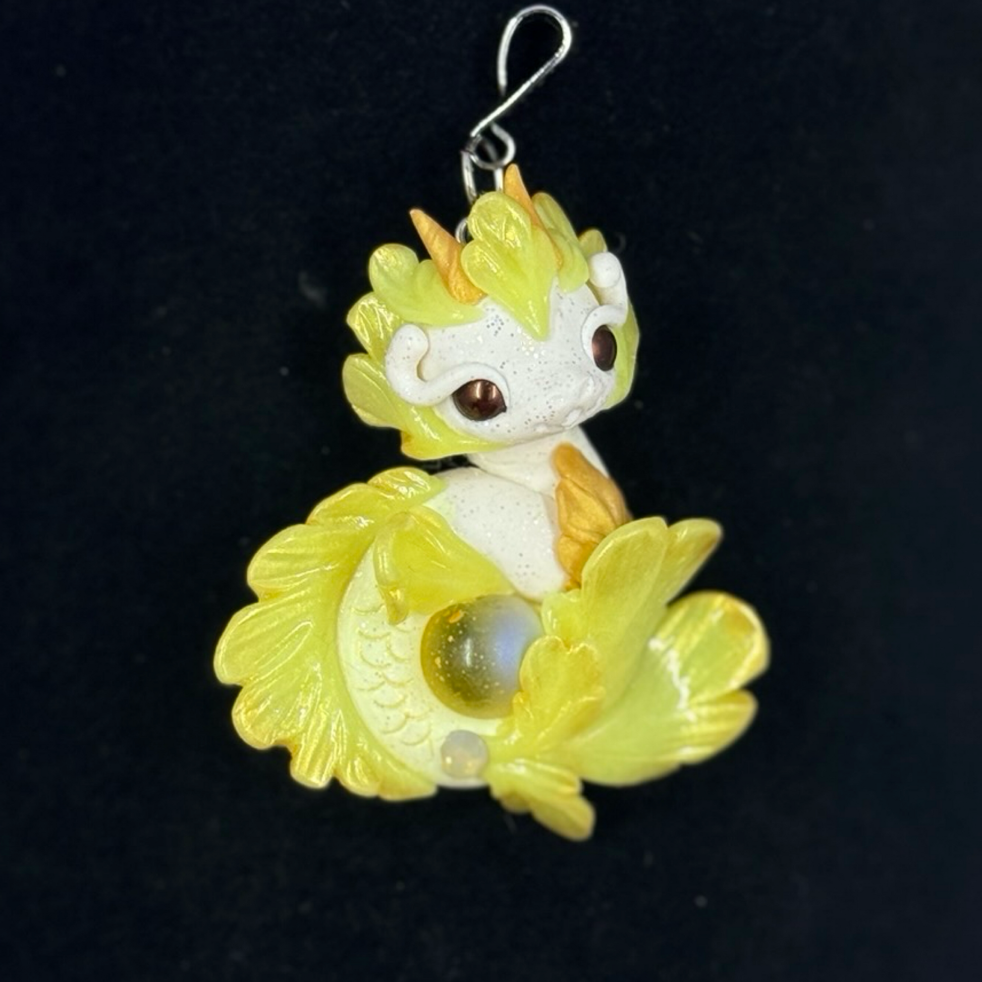 This White and Yellow Baby Sea Dragon Pendant is a delightful mix of sunny hues and sparkling details. Handmade from polymer clay and adorned with glass beads, vibrant pigment powders, and a glossy glass marble, it’s finished with UV resin and varnish for a radiant shine. Ready to wear on an 18" leather cord necklace, this one-of-a-kind sea dragon adds a playful and magical touch to any outfit.