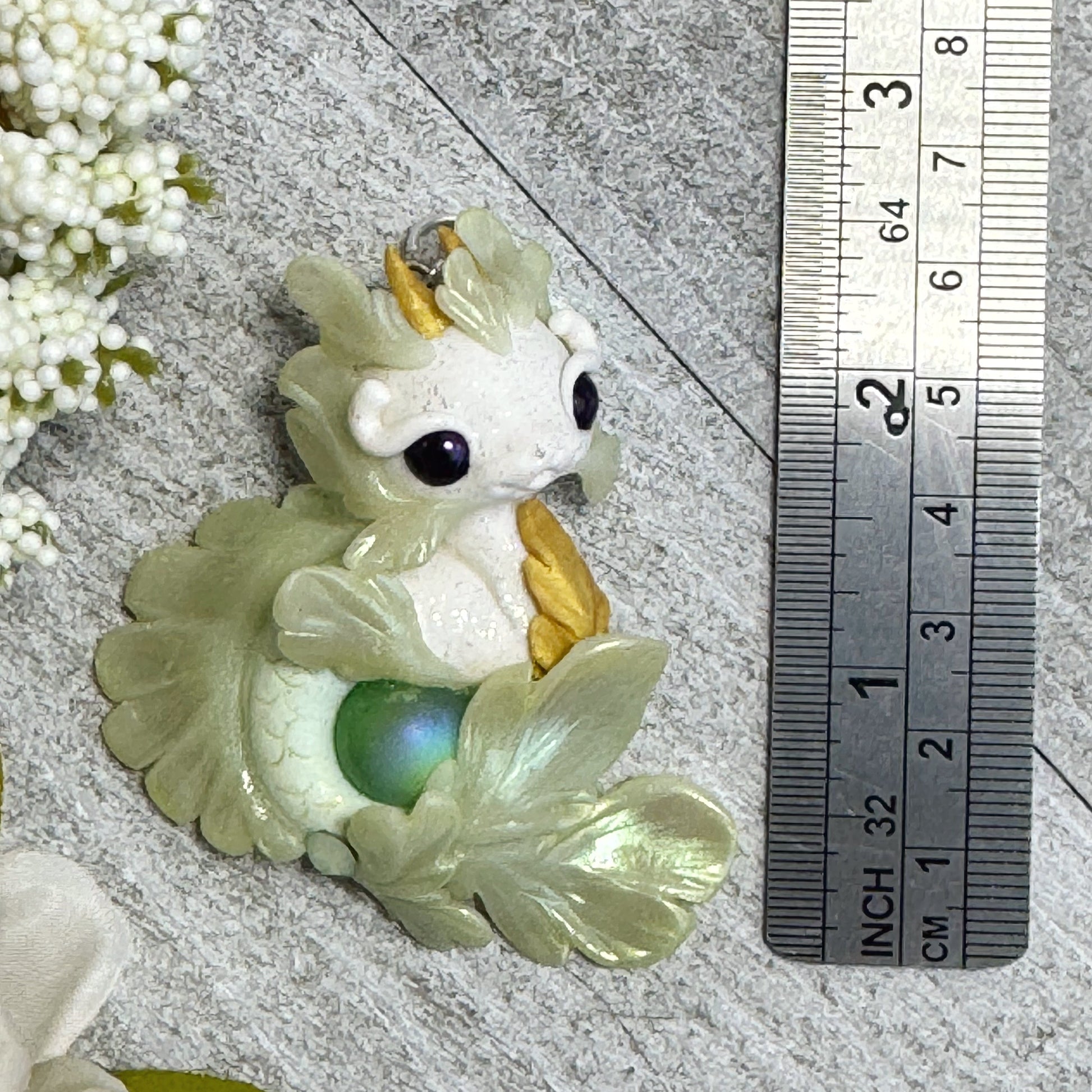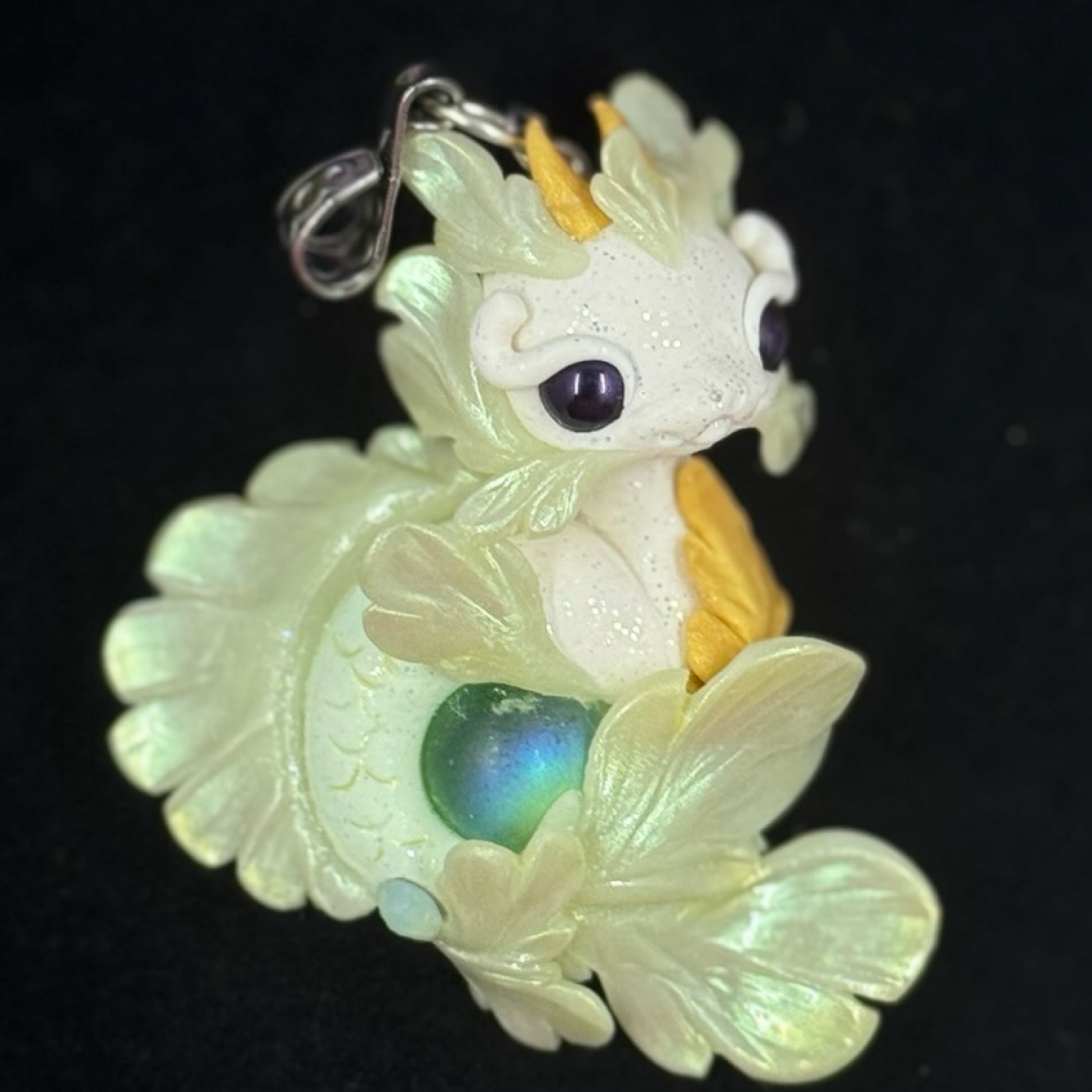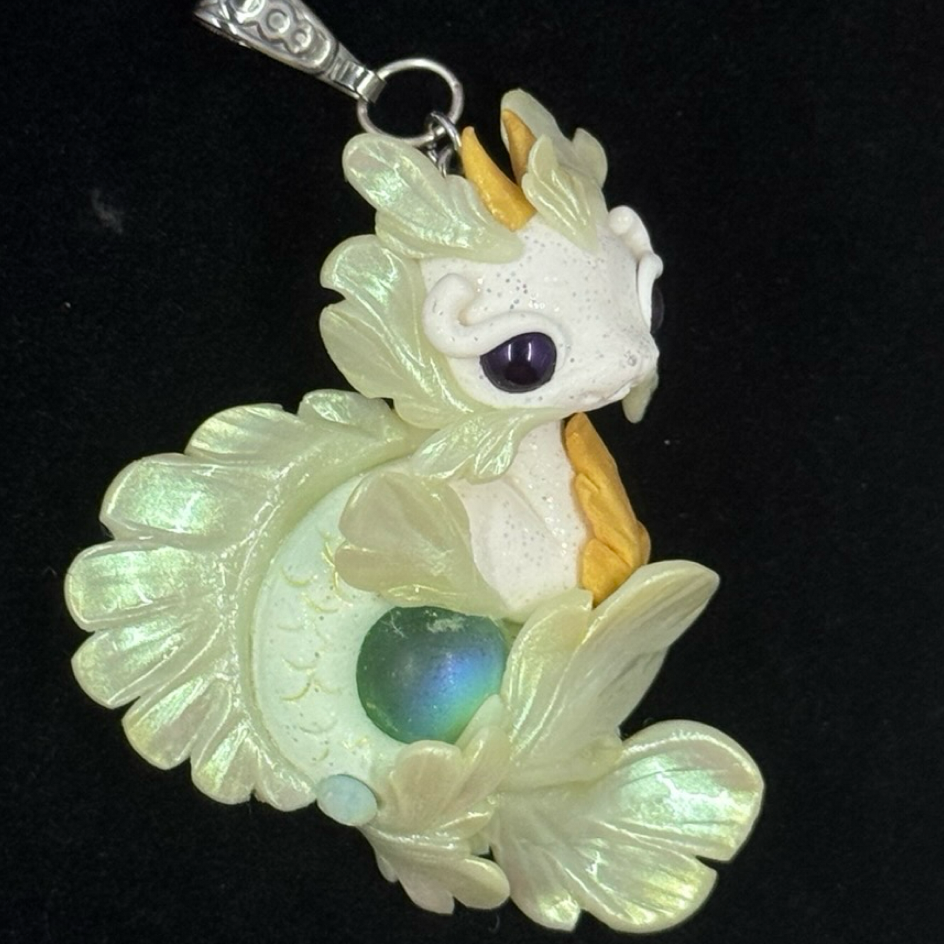 This White and Green Baby Sea Dragon Pendant is a whimsical treasure crafted from polymer clay. Adorned with sparkling glass beads, vibrant pigment powders, and a glossy glass marble, it’s sealed with UV resin and varnish for a radiant finish. Ready to wear on an 18" leather cord necklace, this one-of-a-kind sea dragon adds a playful and magical touch to any outfit.
