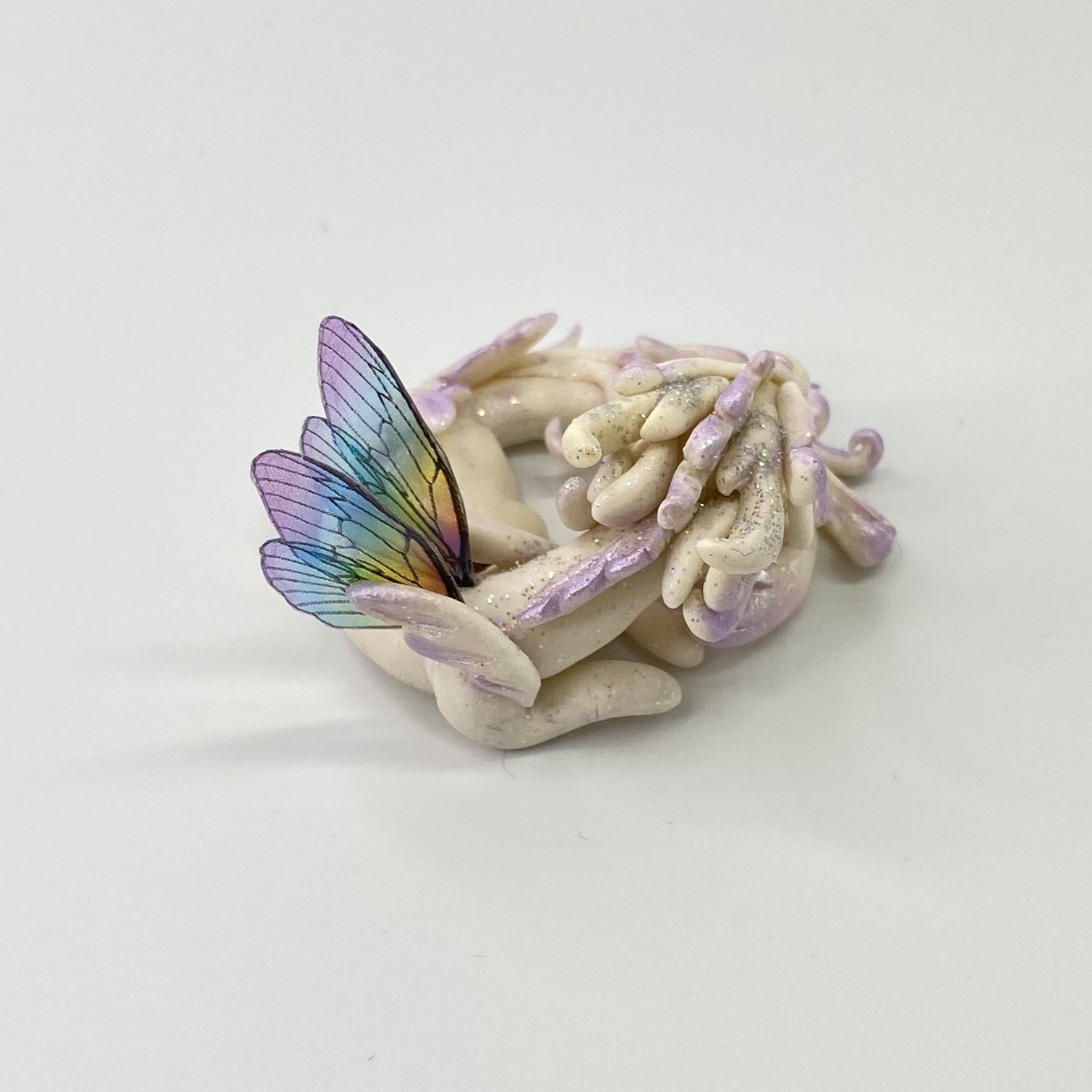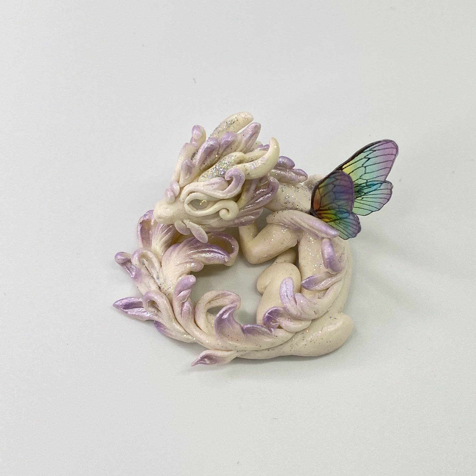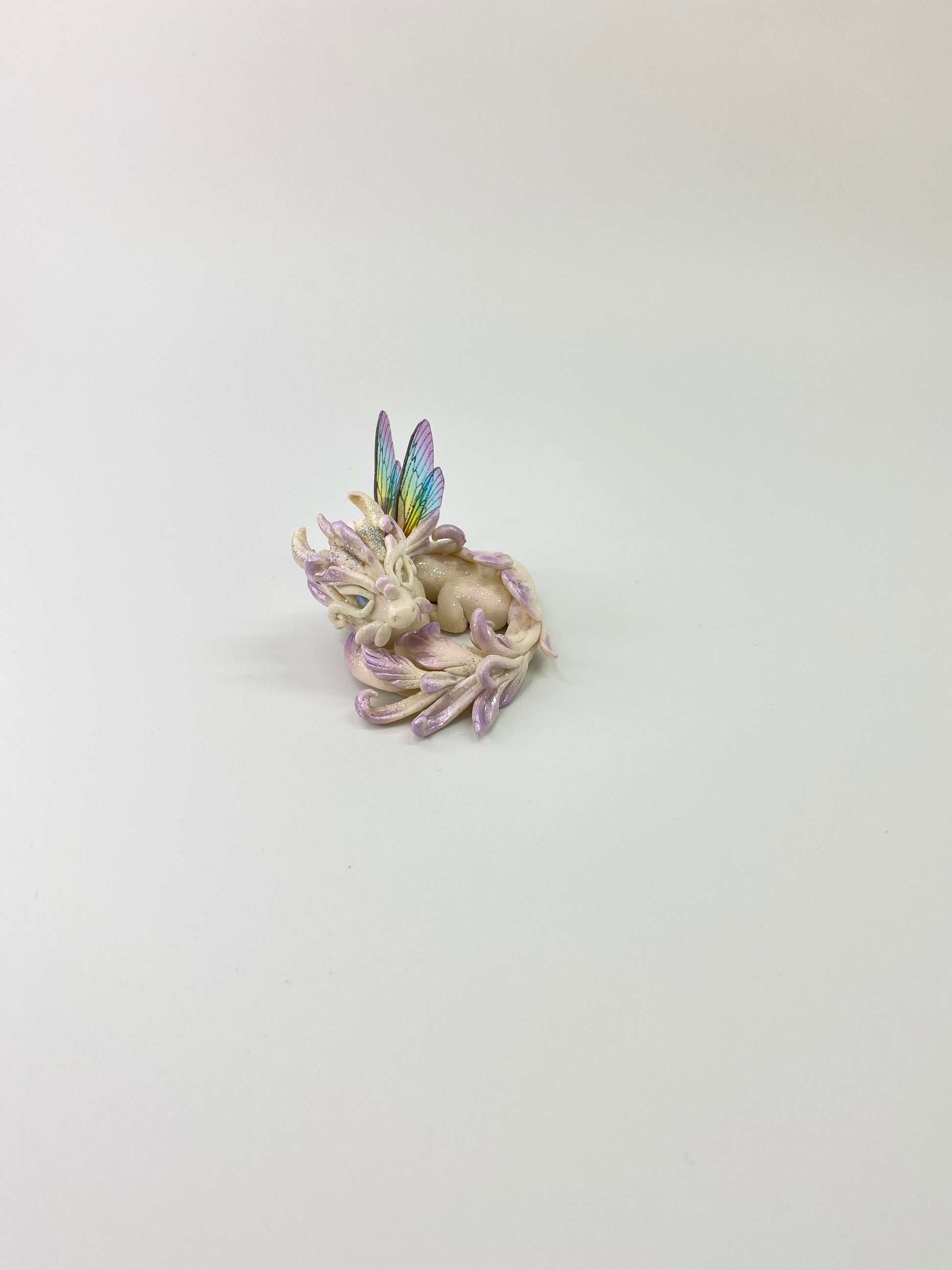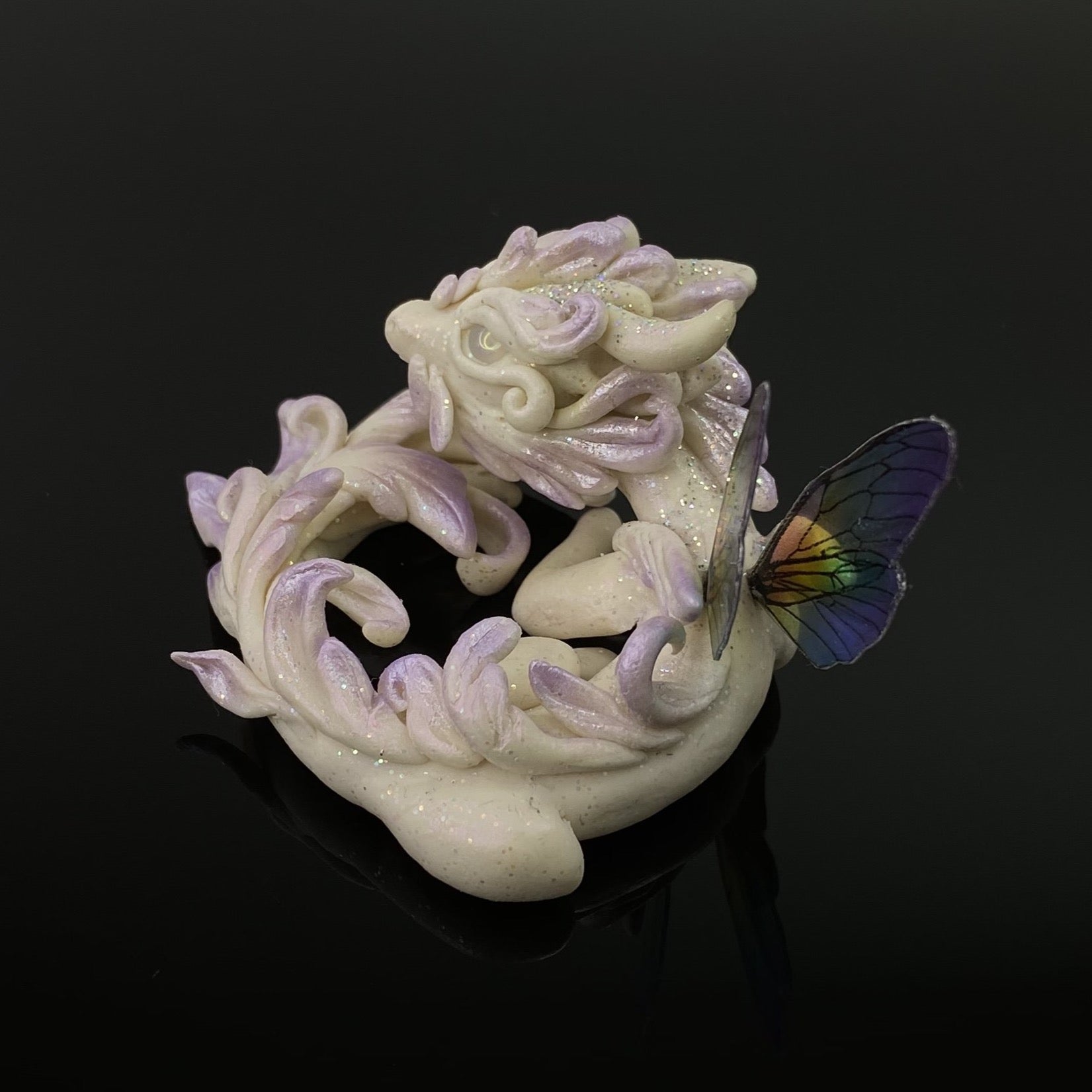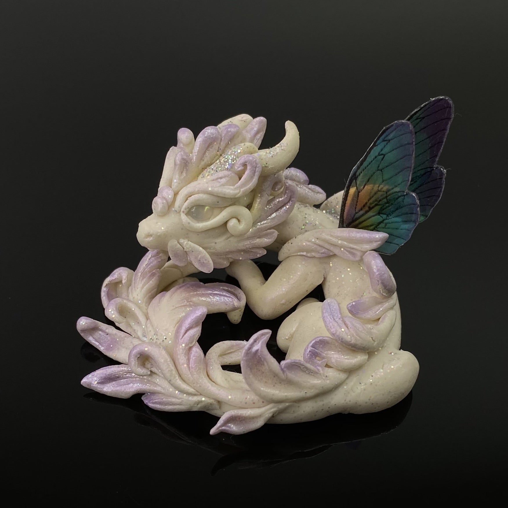 Frost white fairy dragon with lavender accented tail and mane. Made out of Sculpey Premo polymer clay, moonstone colored glass cabochons for eyes, acetate wings and pastel chalk for shading accents.