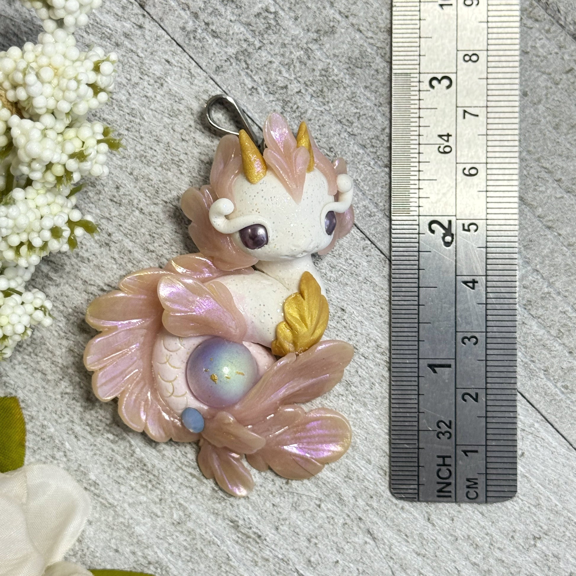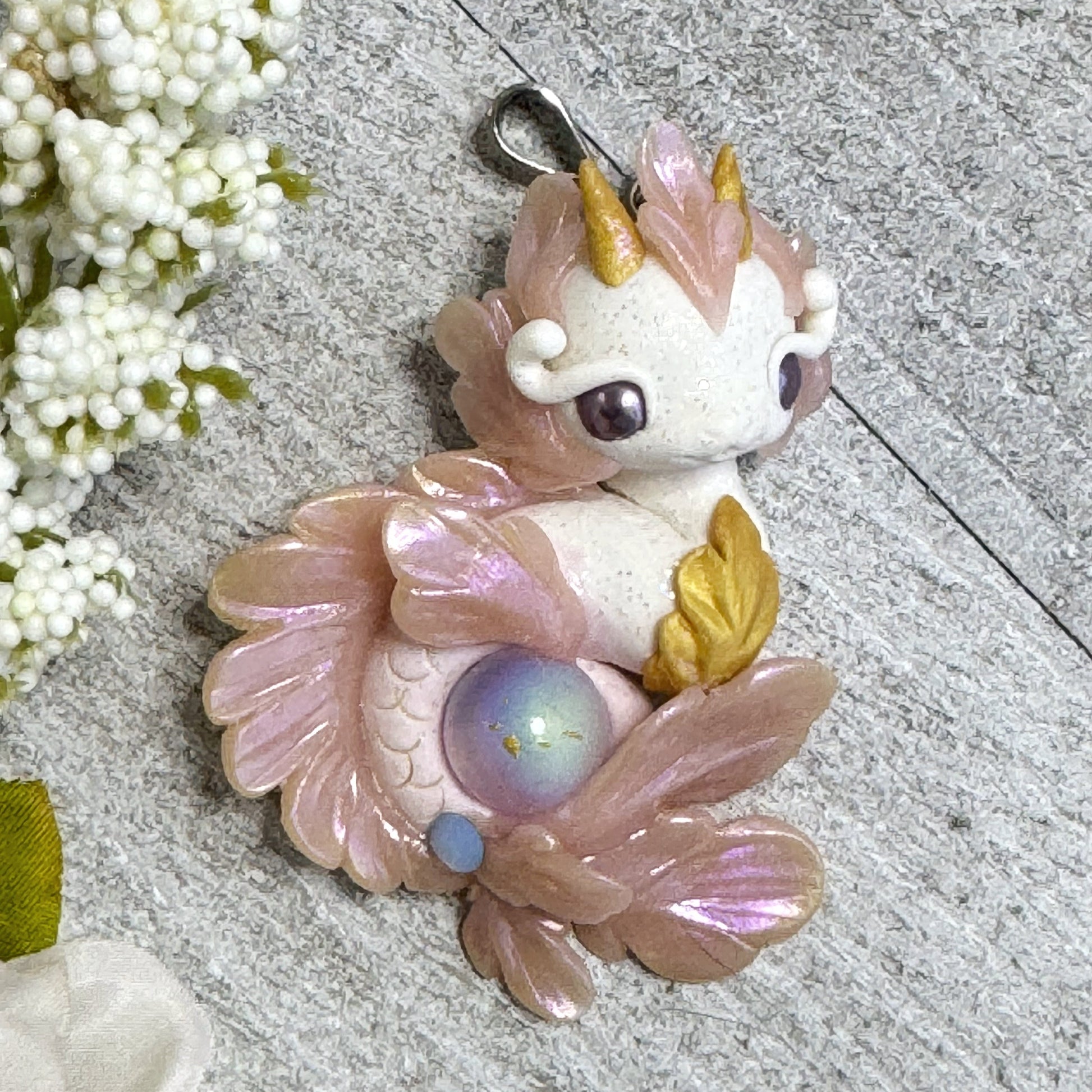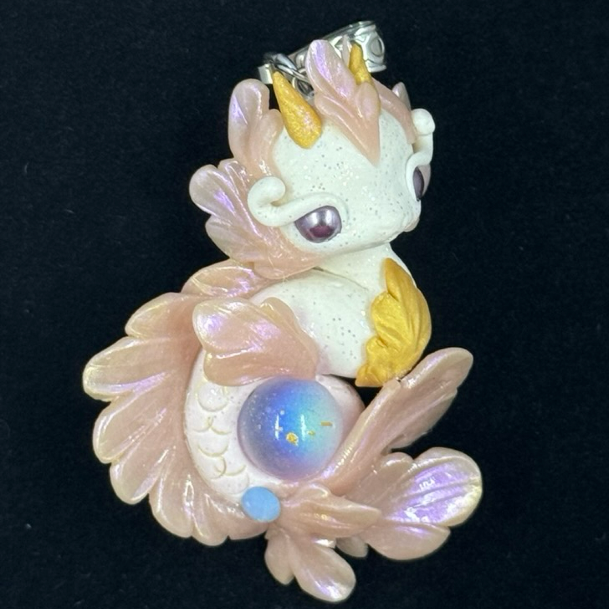 This White and Pale Purple Baby Sea Dragon Pendant is a charming and playful creation made from polymer clay. Featuring sparkling glass beads, vibrant pigment powders, and a glossy glass marble, it’s finished with UV resin and varnish for a radiant shine. Ready to wear on an 18" leather cord necklace, this one-of-a-kind sea dragon adds a magical touch of whimsy to any outfit.