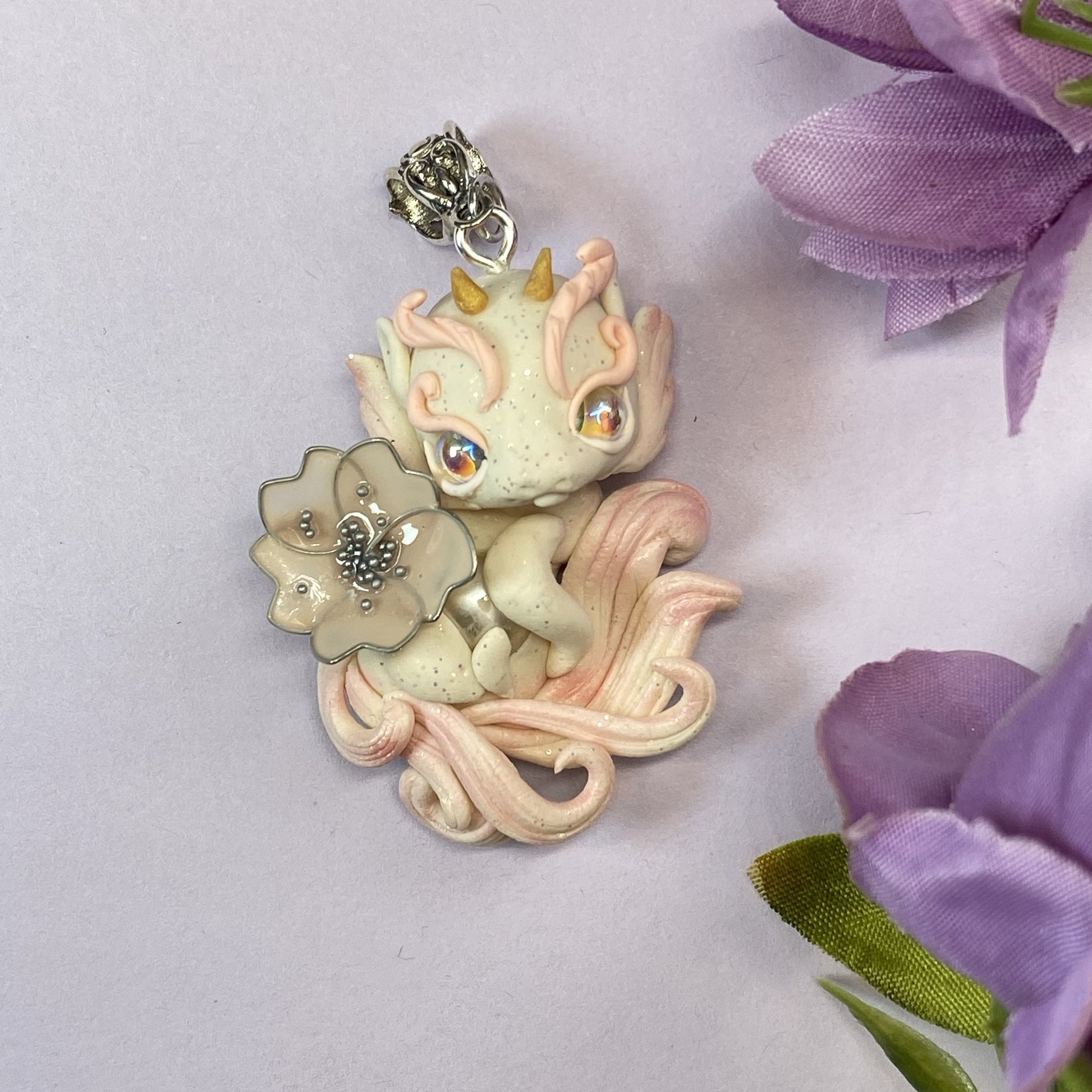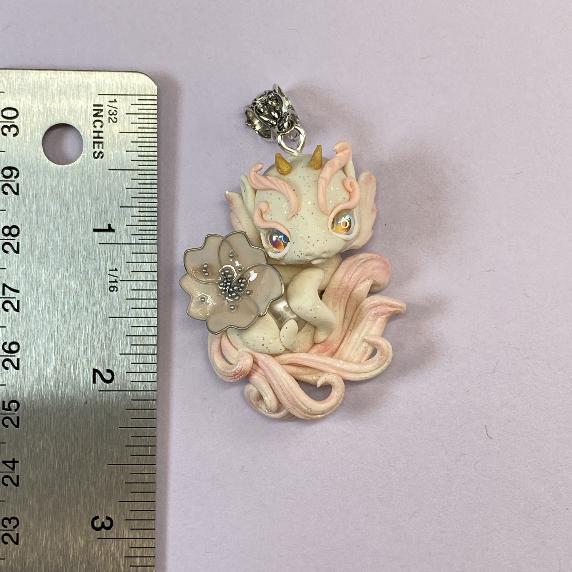 This tiny white and pink dragon is clutching a small pearl. She has a resin sakura flower that I made attached to her back. Materials used to create this piece include sculpey polymer clay, pan pastel pigments, resin, wire and seed beads for the sakura flower along with a tiny pearl. Leather necklace included.