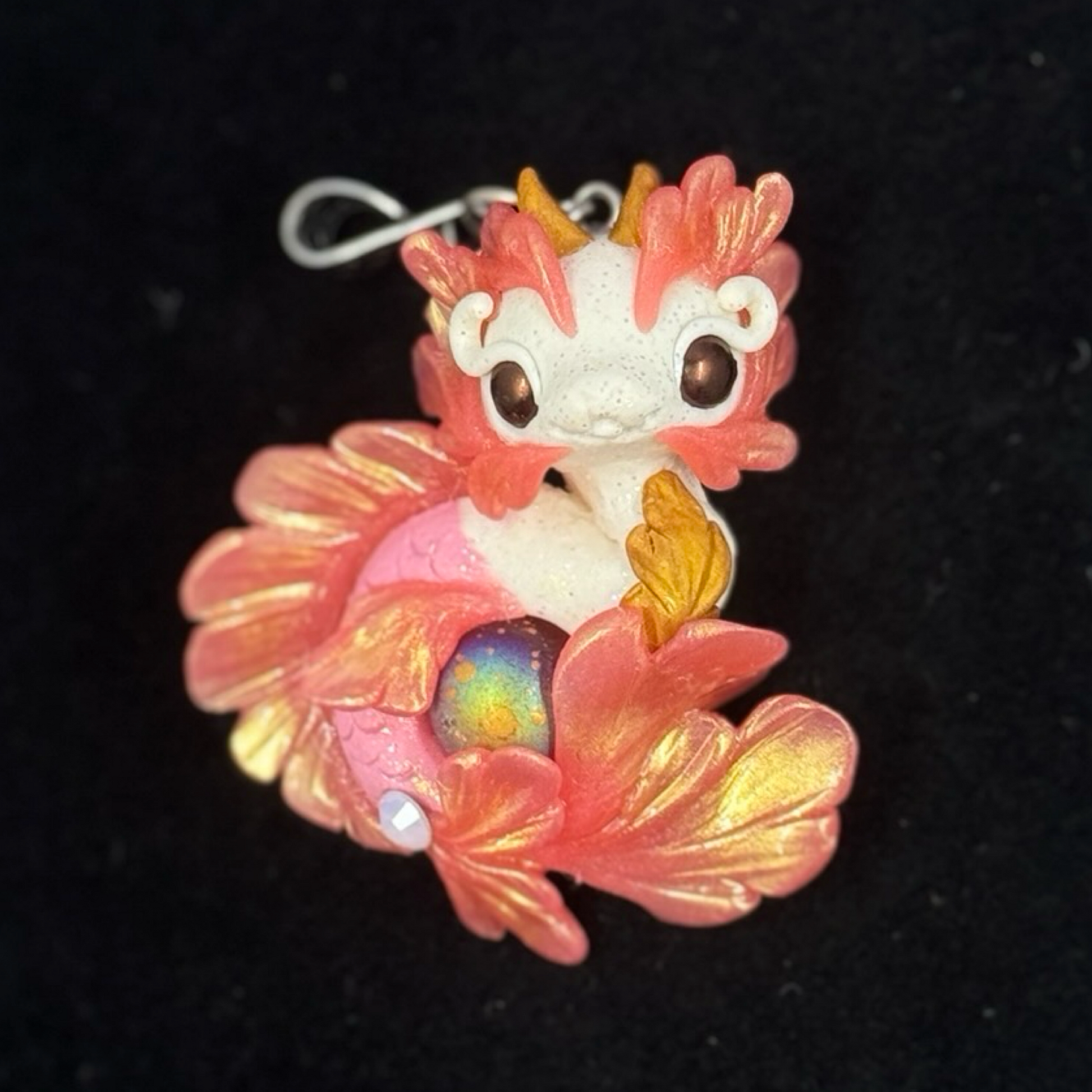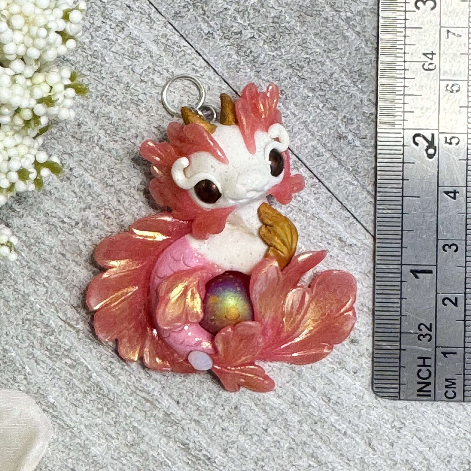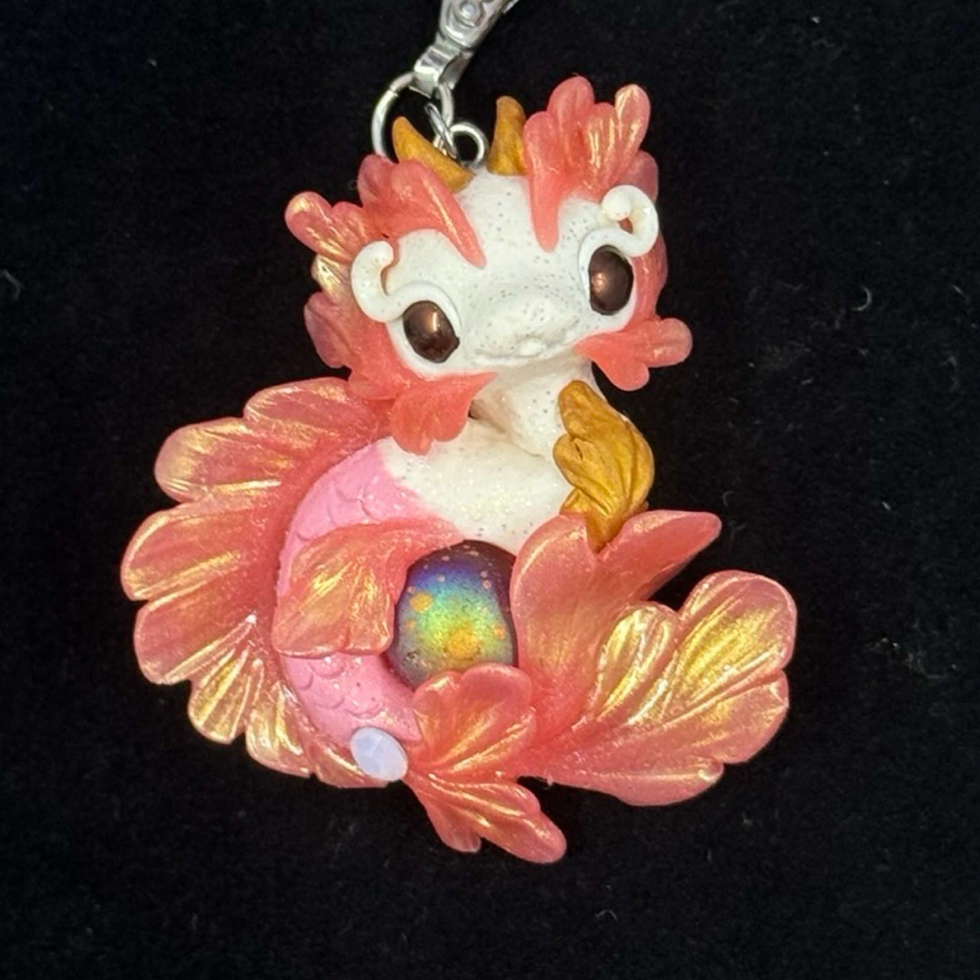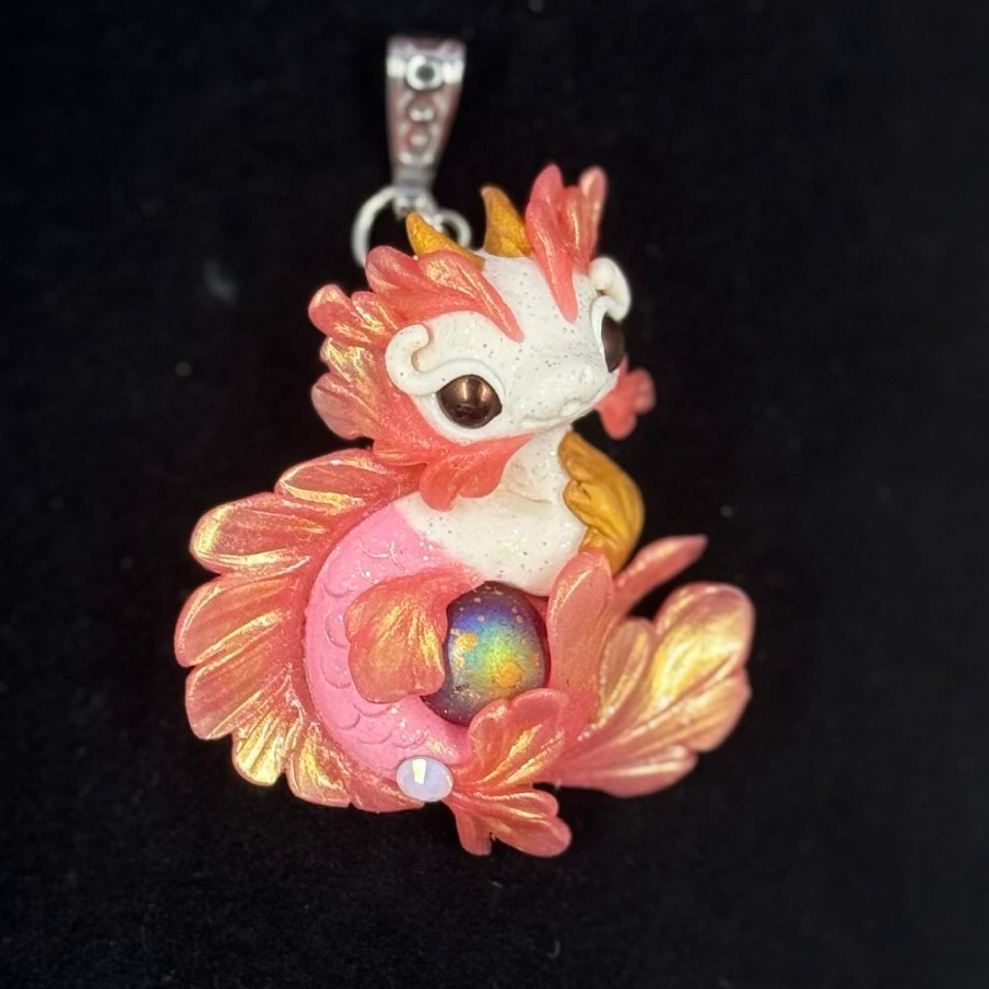 This White and Red Baby Sea Dragon Pendant is a playful and enchanting creation made from polymer clay. Adorned with sparkling glass beads, vibrant pigment powders, and a glossy glass marble, it’s finished with UV resin and varnish for a radiant shine. Ready to wear on an 18" leather cord necklace, this one-of-a-kind sea dragon adds a magical splash of color and charm to any outfit.