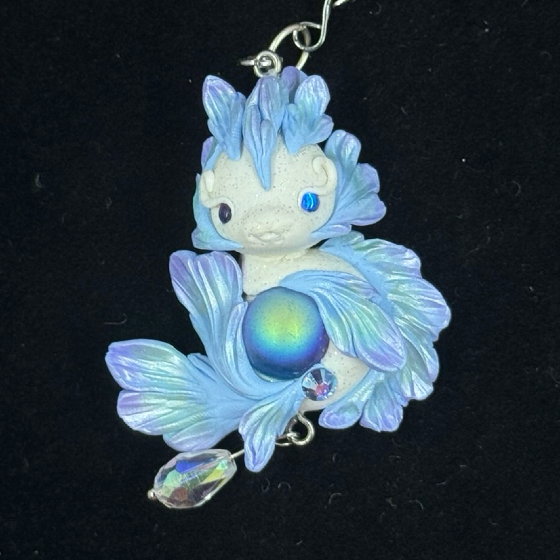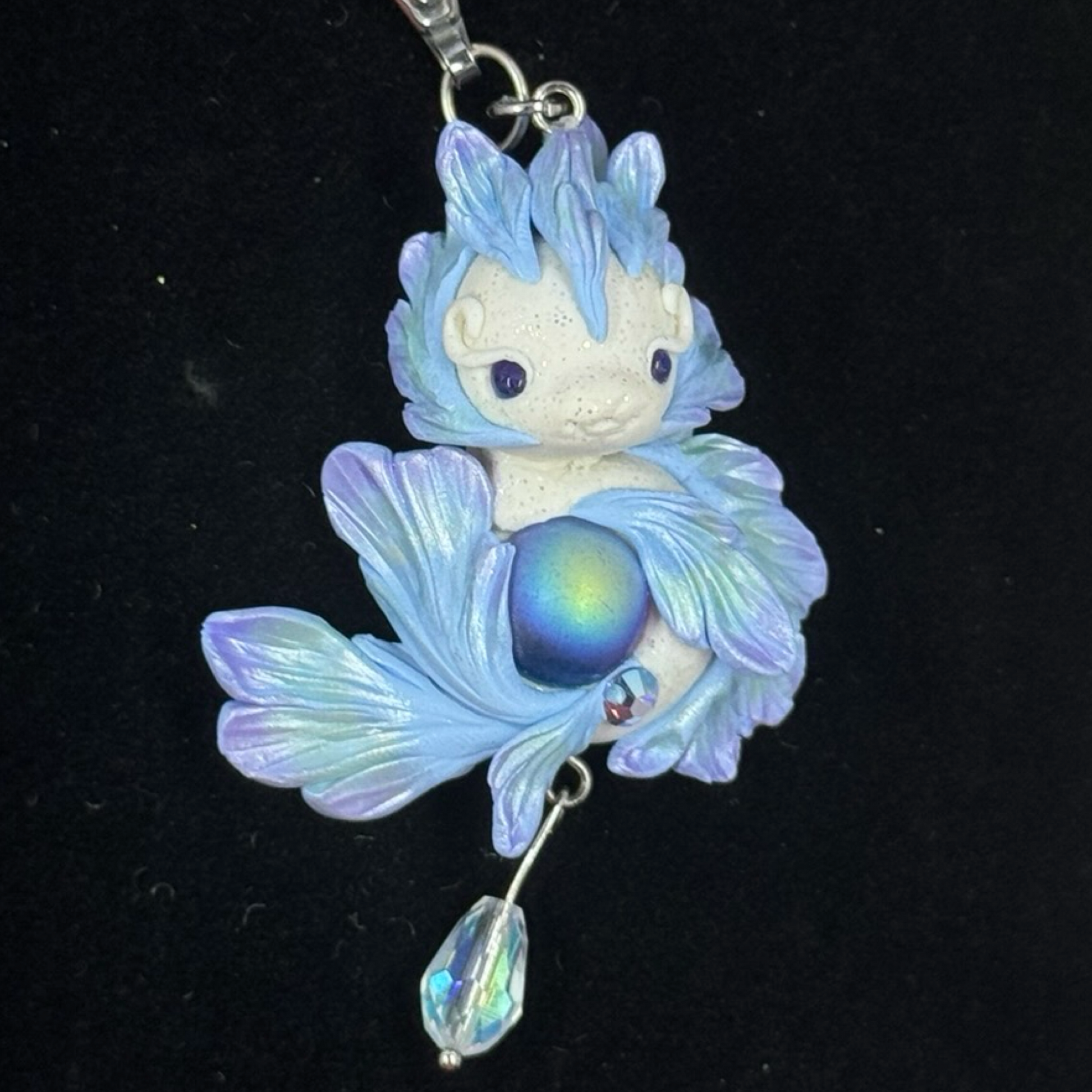 White Blue, Purple and Green Shimmer Baby Dragon Pendant with Crystal