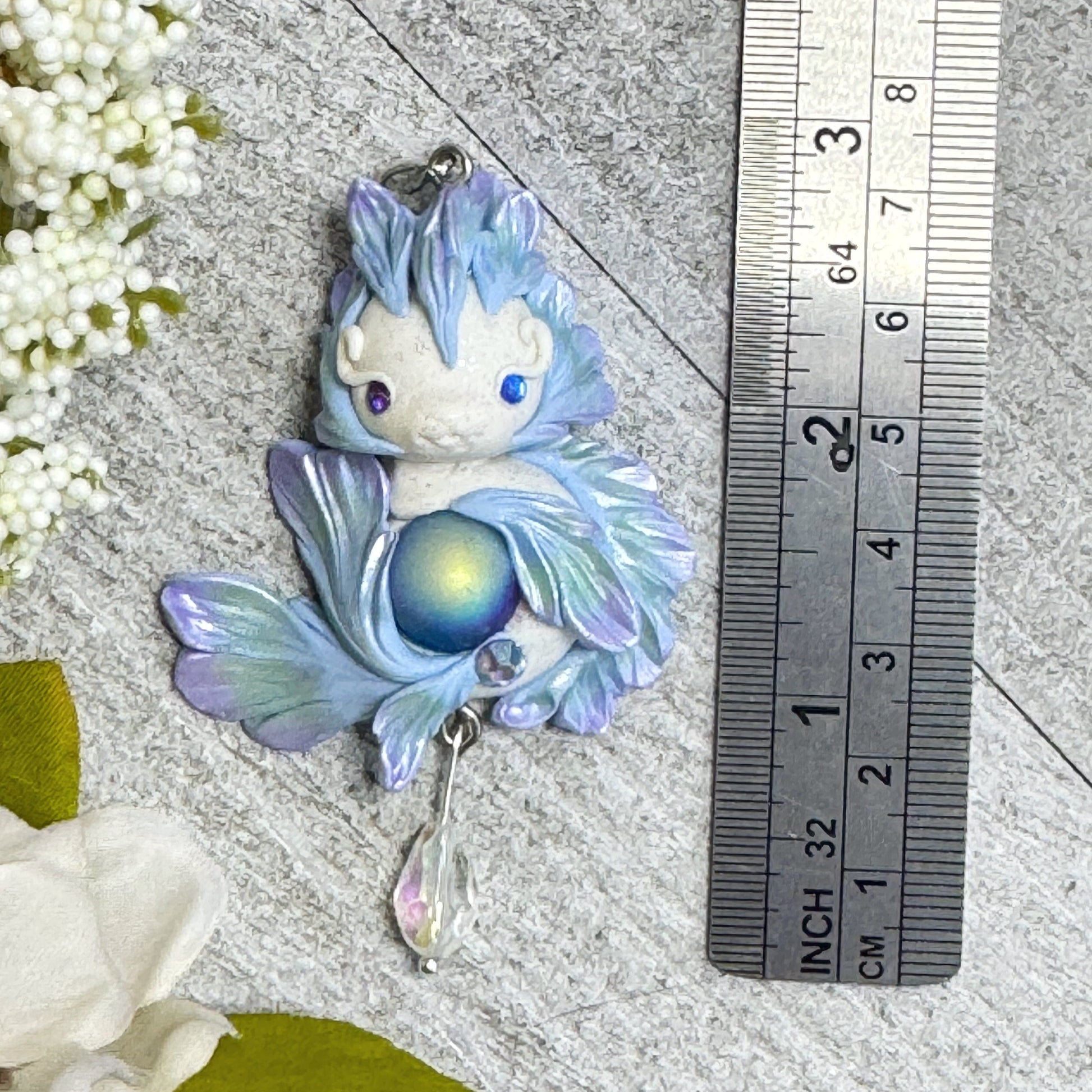 Bring a touch of magic to your style with this playful baby dragon pendant shimmering in white, purple, and green. Crafted from polymer clay and glass beads, it sparkles with pigment powders and a glass marble centerpiece. Finished with varnish and UV resin for lasting shine, it hangs on an 18" leather cord—ready to enchant any outfit with its one-of-a-kind charm.