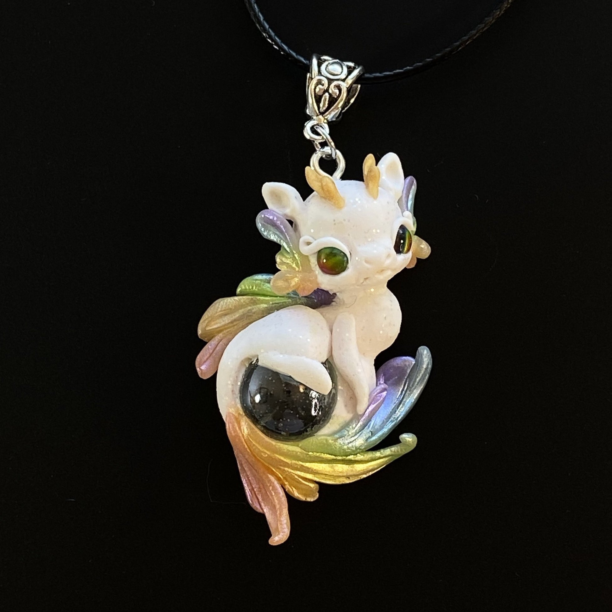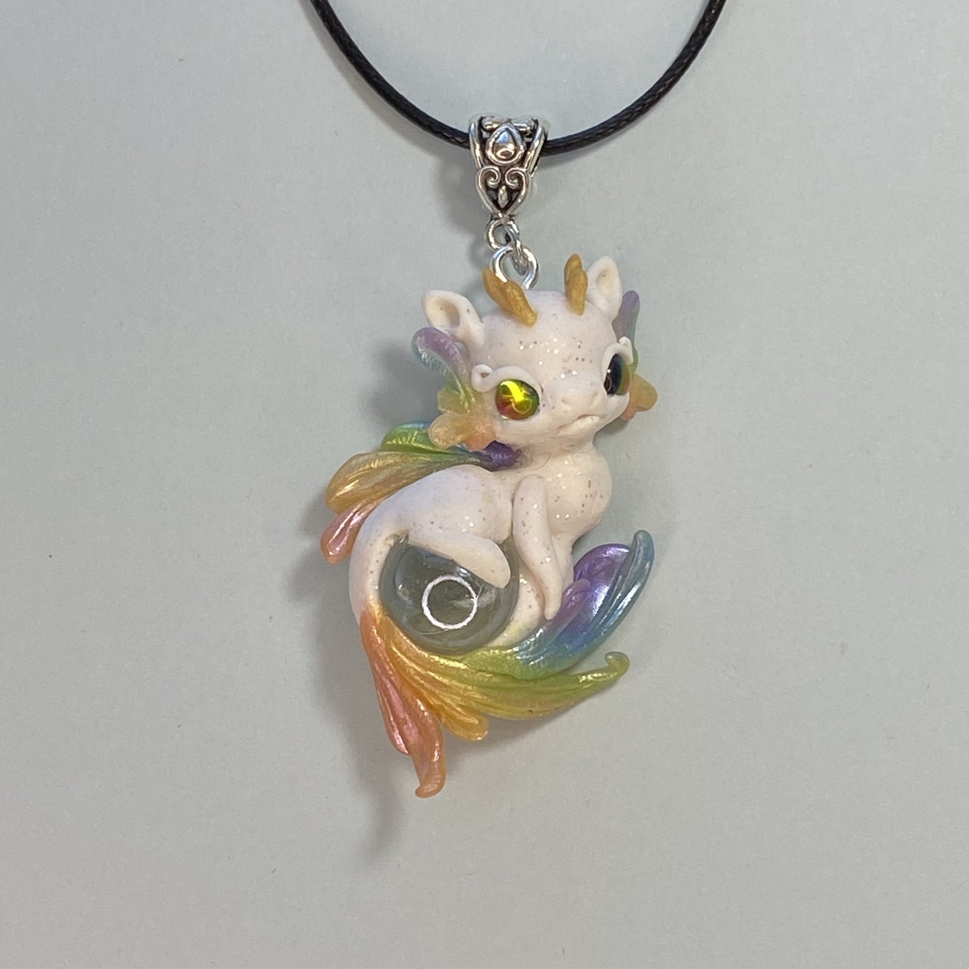This tiny Rainbow Dragon baby is holding a glass Marble. Materials used include premo sculpey in frost white and translucent, pearl ex powders for rainbow shimmer and rainbow ab glass cabochons for eyes. Leather necklace included.