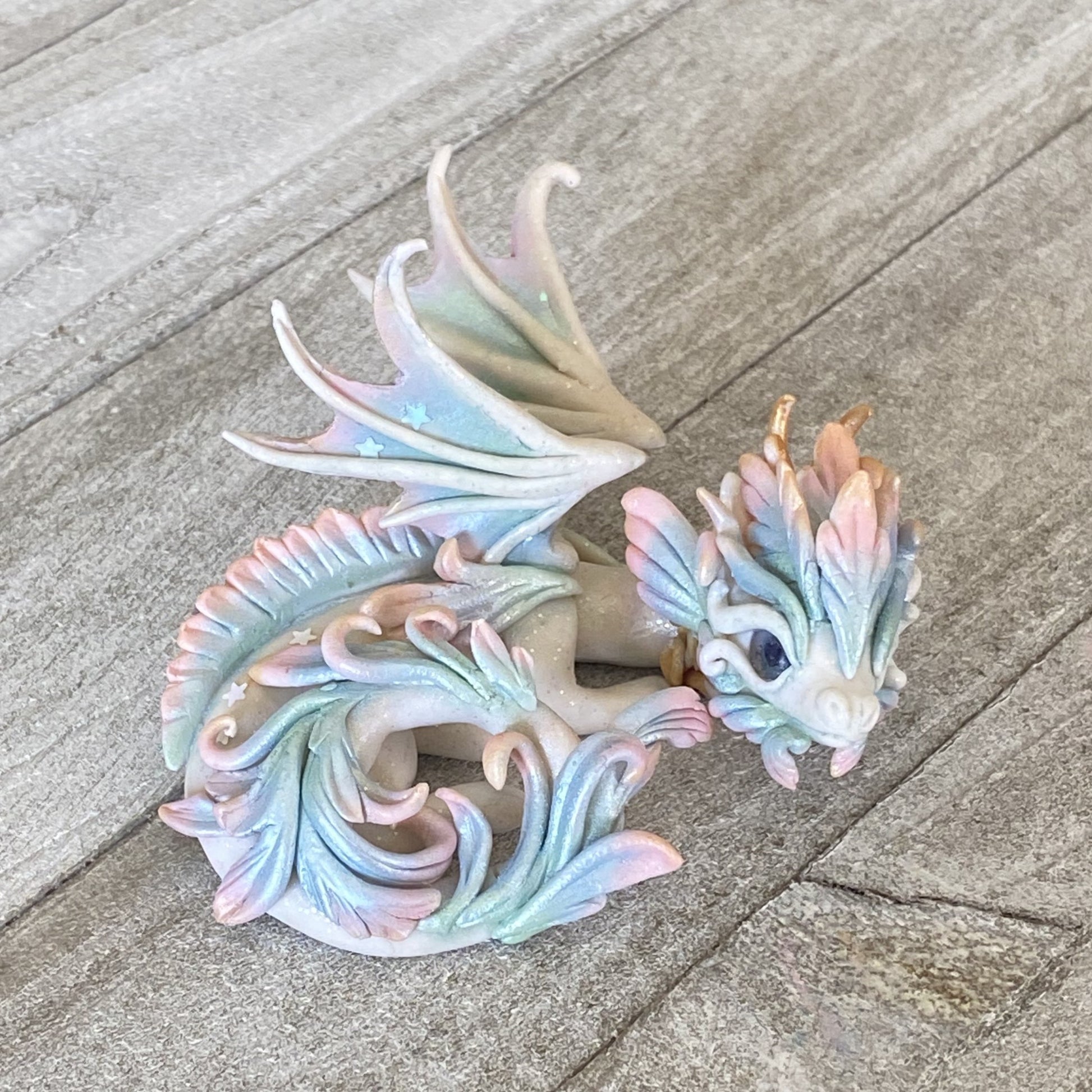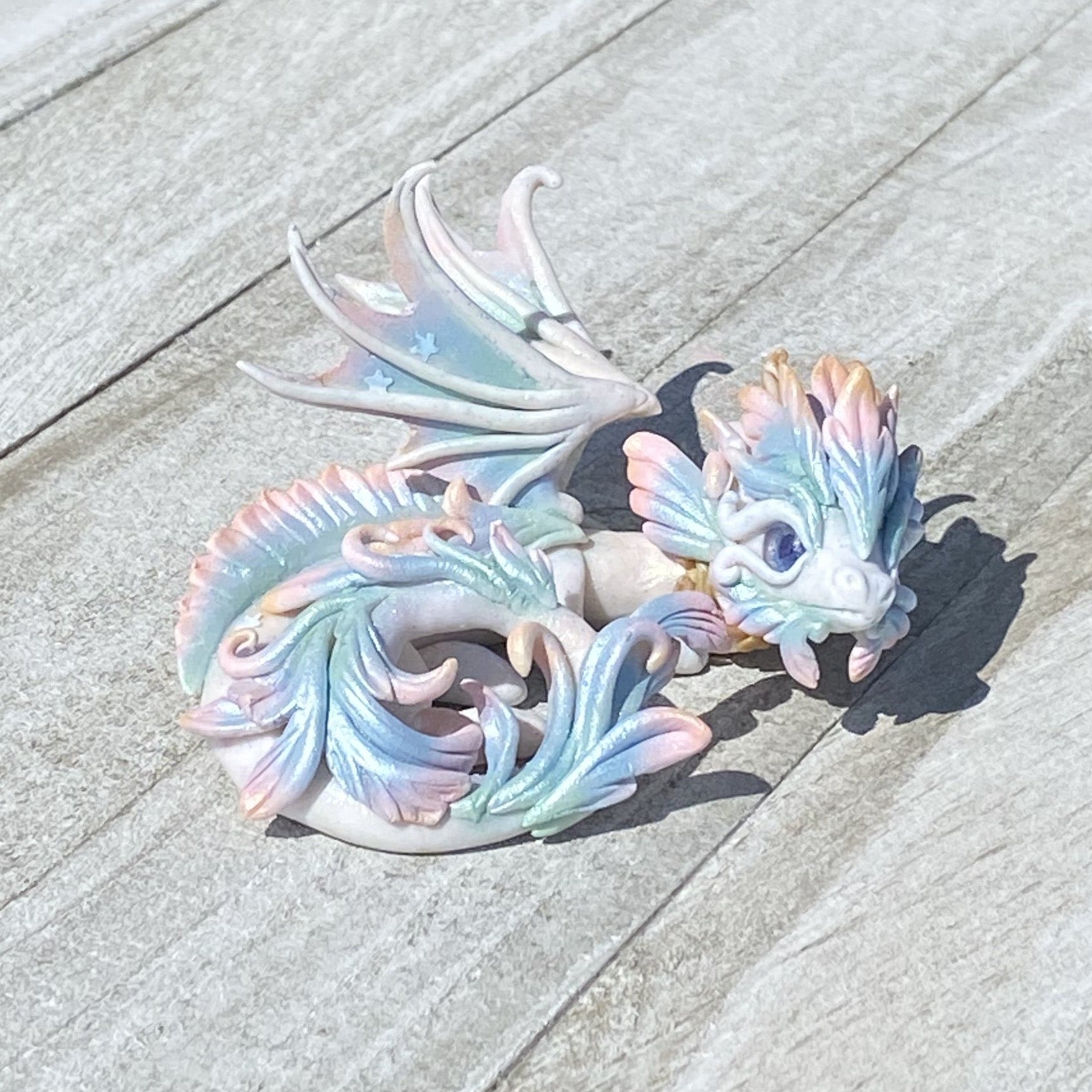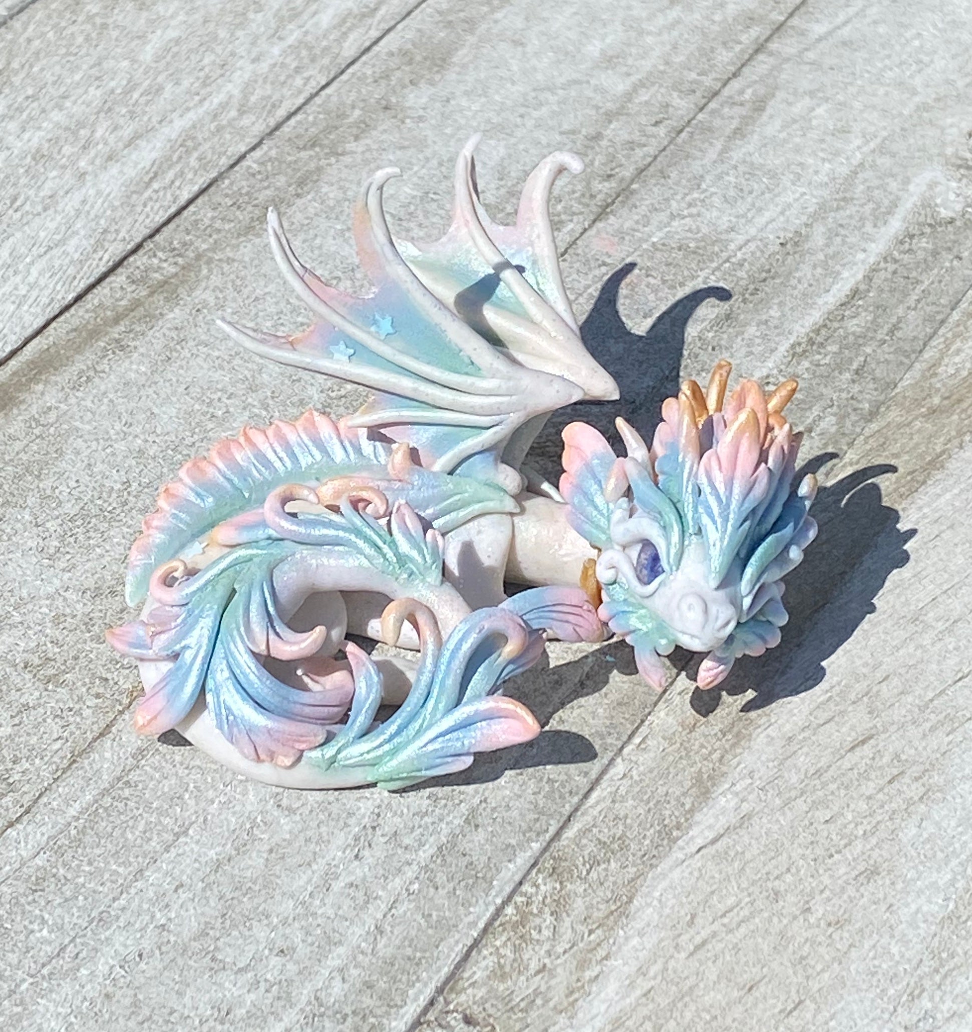 One of my few dragons I've made with wings, this little one is created out of frost white Sculpey Premo clay and accented with rainbow pastel chalks in yummy sherbert colors. She has holographic star confetti adorning her wings and body. Two genuine swarovski crystals, one pink, the other blue are on her collar. She has glass cabochon eyes.