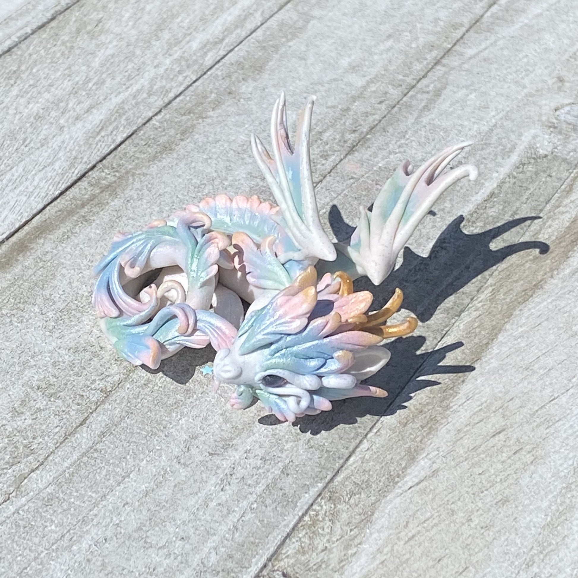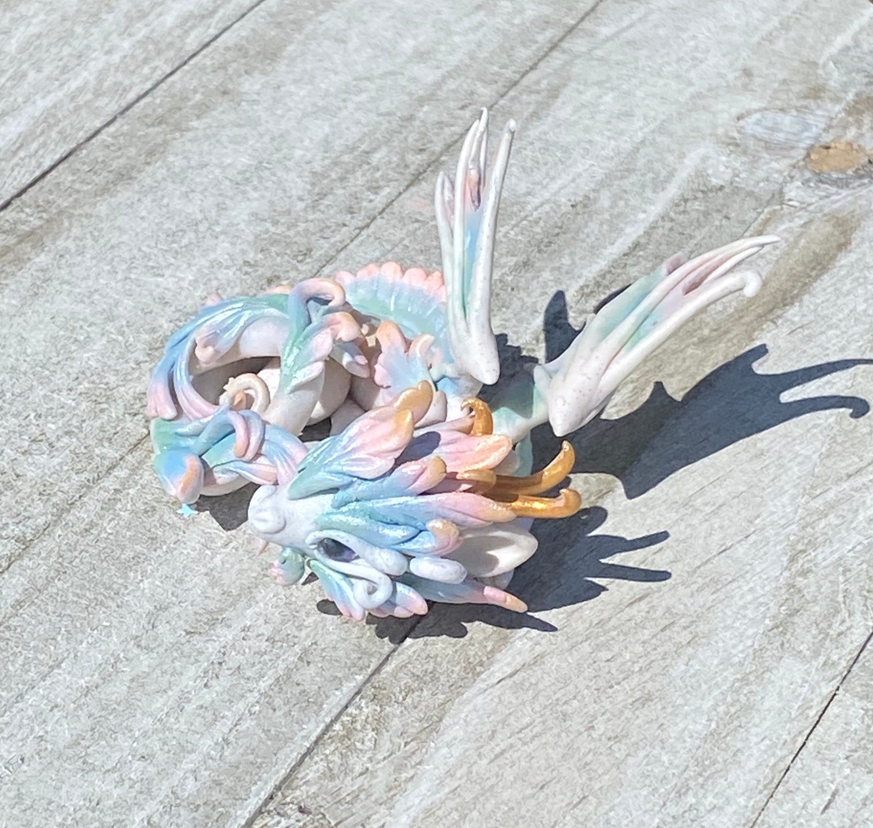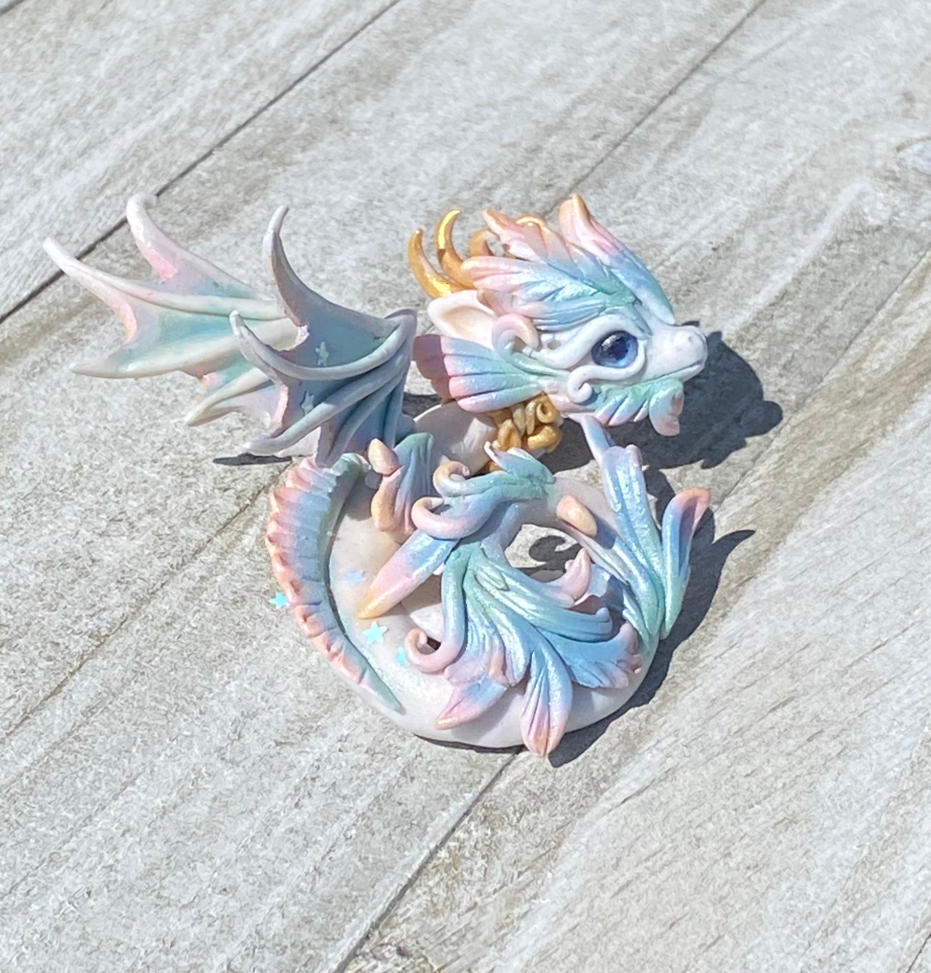One of my few dragons I've made with wings, this little one is created out of frost white Sculpey Premo clay and accented with rainbow pastel chalks in yummy sherbert colors. She has holographic star confetti adorning her wings and body. Two genuine swarovski crystals, one pink, the other blue are on her collar. She has glass cabochon eyes.