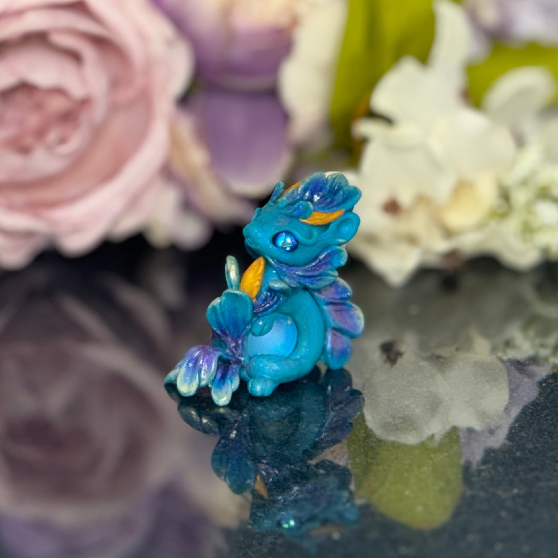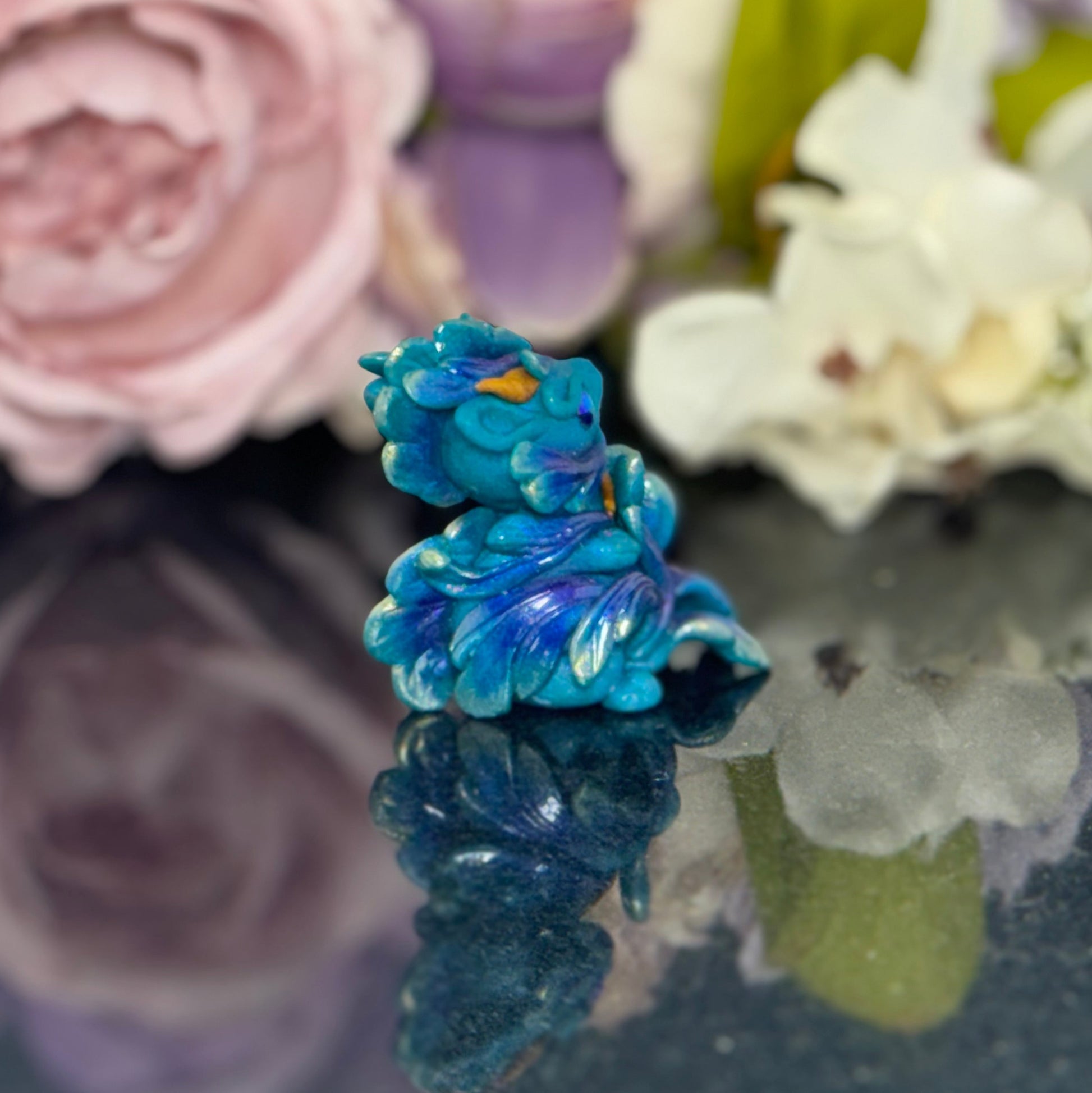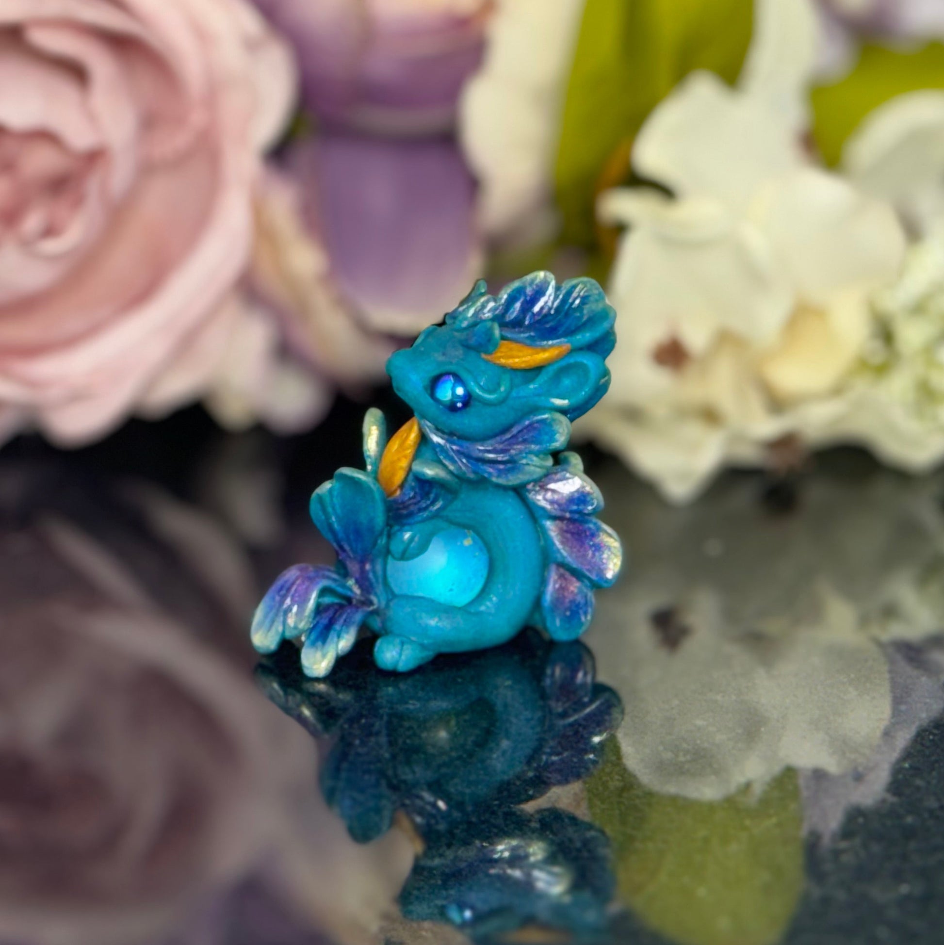 Add a splash of whimsy to your desk with the Teal Marble Dragon Desk Pet! Crafted from polymer clay and vibrant pigment powders, this little dragon features sparkling glass beads and a mesmerizing glass marble. Finished with a glossy varnish, it’s the perfect playful companion to brighten your workspace and spark your imagination.