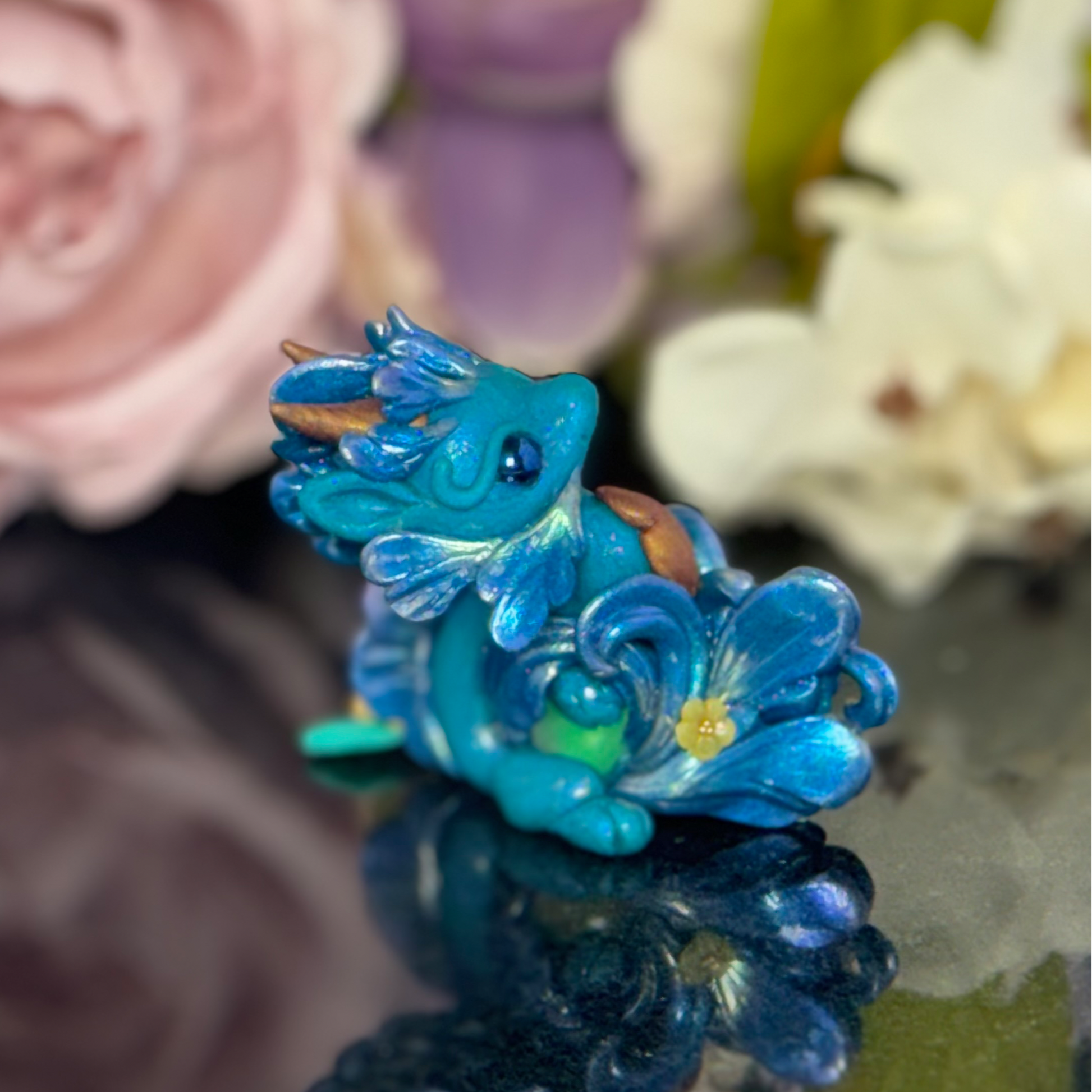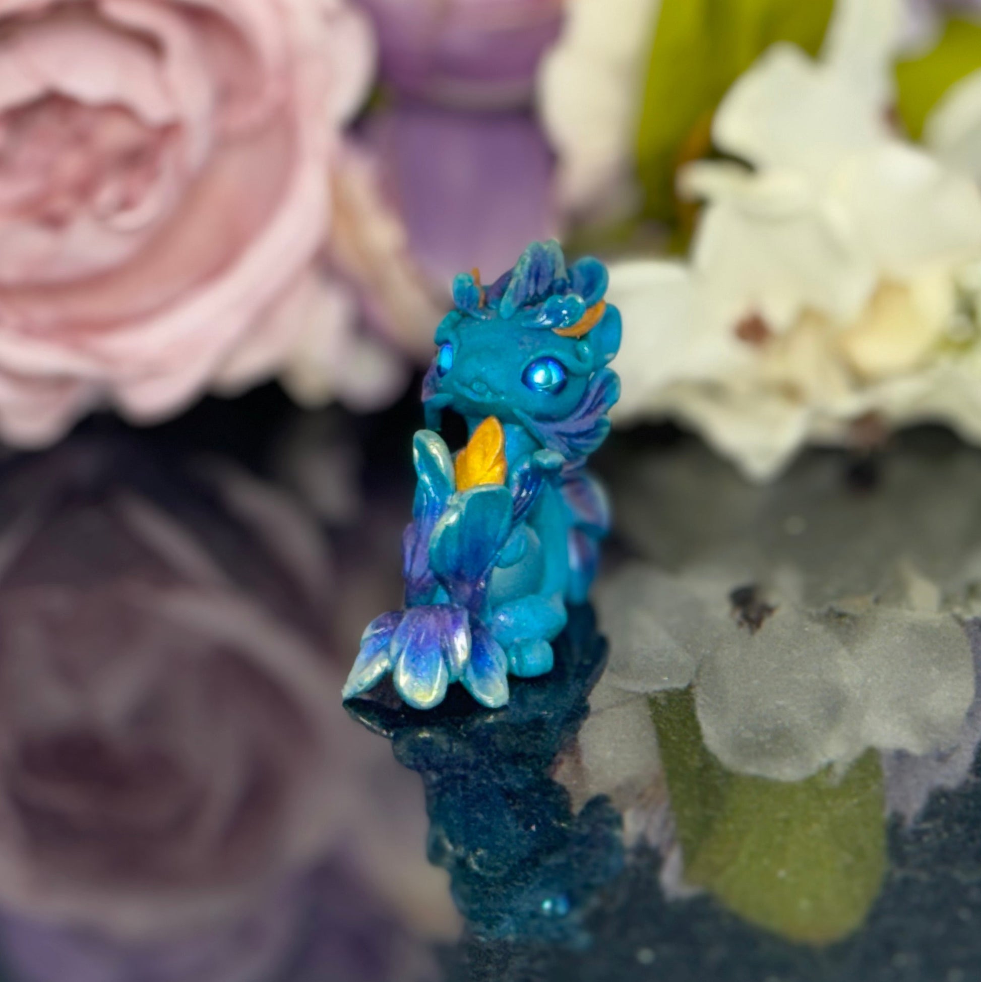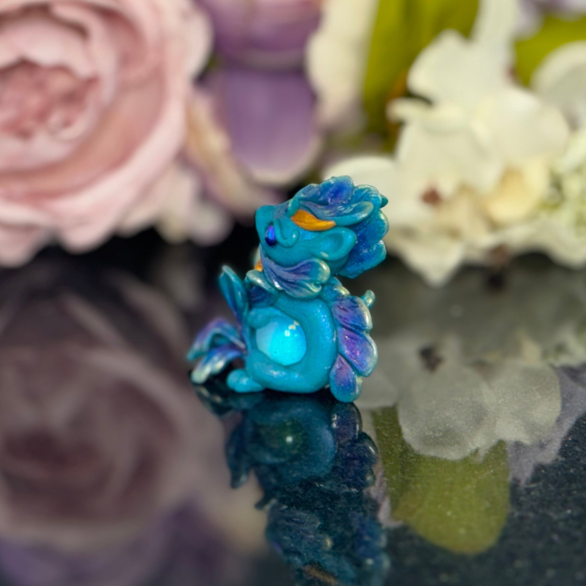 Add a splash of whimsy to your desk with the Teal Marble Dragon Desk Pet! Crafted from polymer clay and vibrant pigment powders, this little dragon features sparkling glass beads and a mesmerizing glass marble. Finished with a glossy varnish, it’s the perfect playful companion to brighten your workspace and spark your imagination.