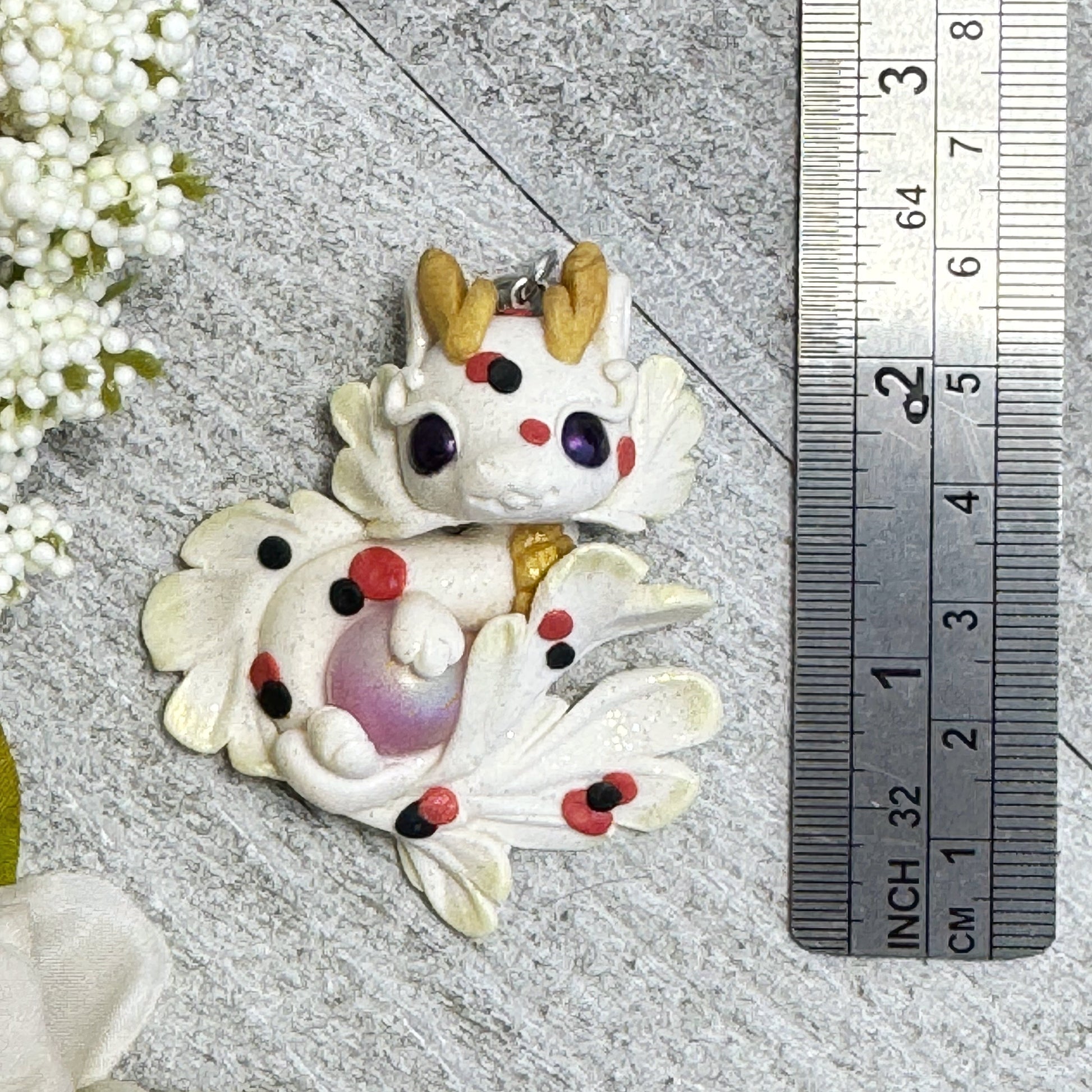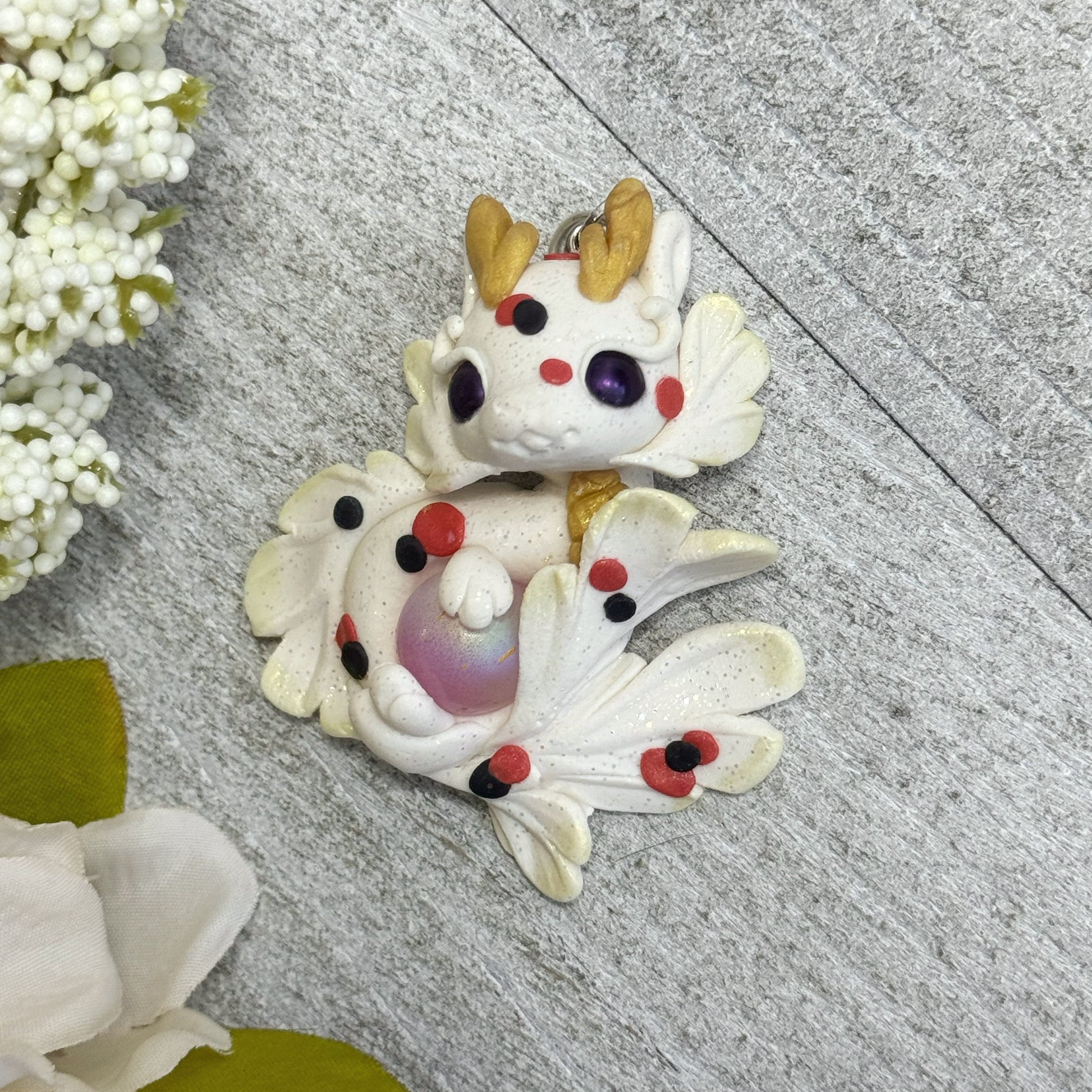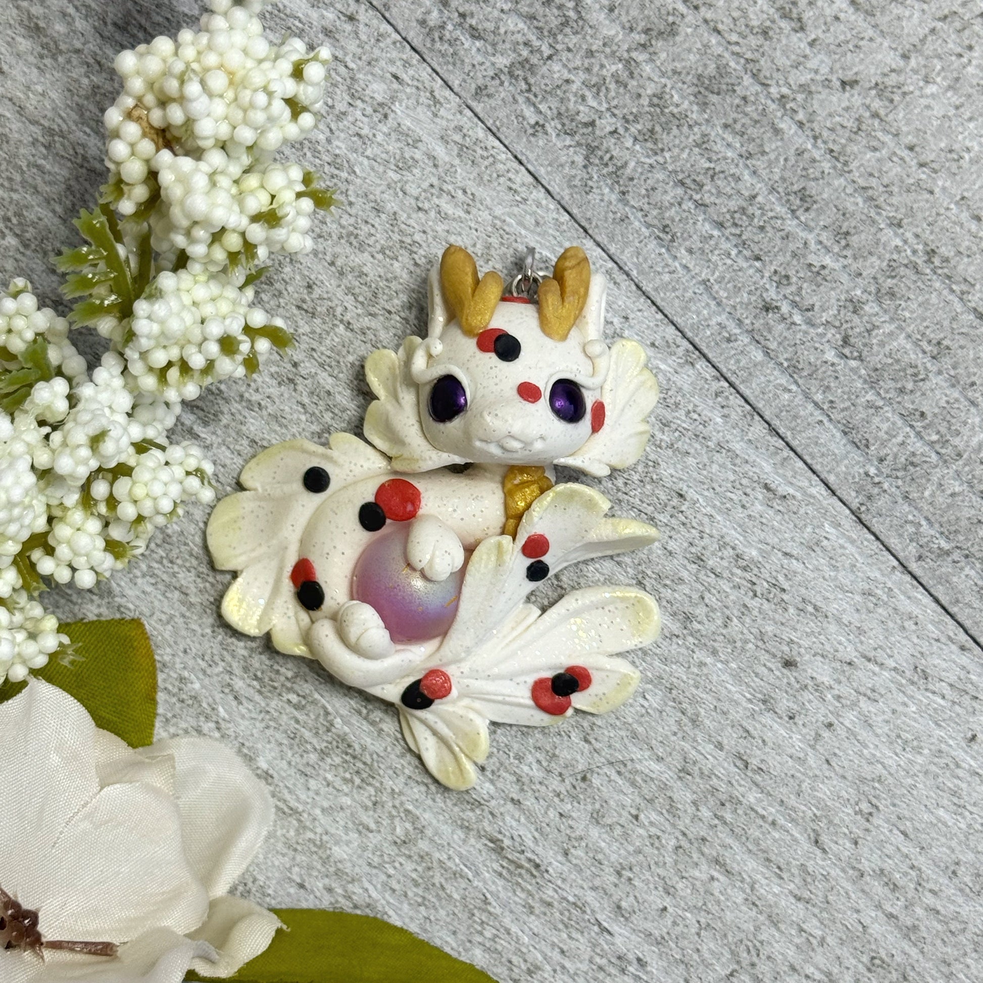 This White Dragon Pendant with Red and Black Koi Spots is a playful and captivating creation made from polymer clay. Adorned with sparkling glass beads, vibrant pigment powders, and a glossy glass marble, it shines with a smooth varnish finish. Paired with an 18" leather cord necklace, this one-of-a-kind dragon adds a magical and unique touch to any outfit.