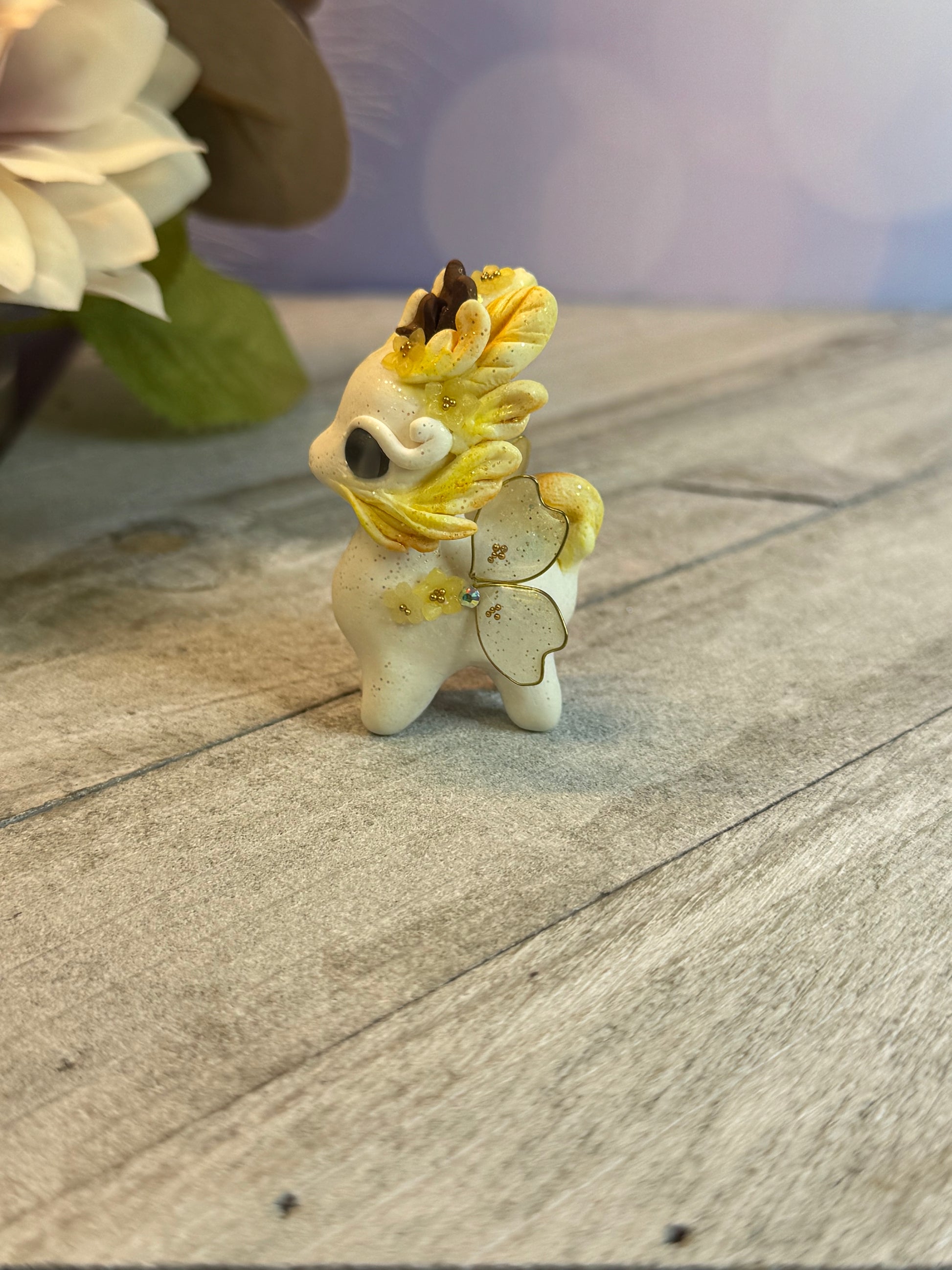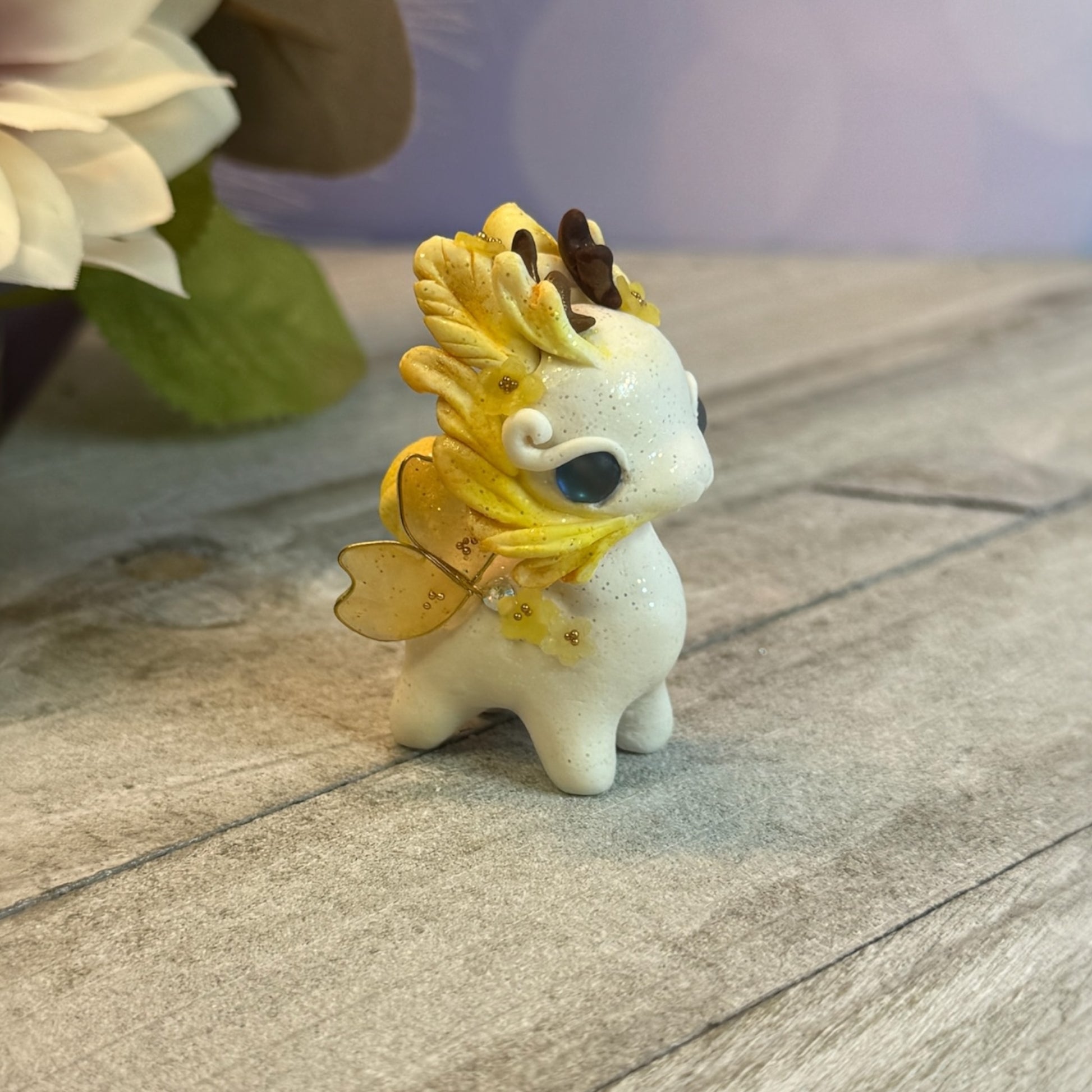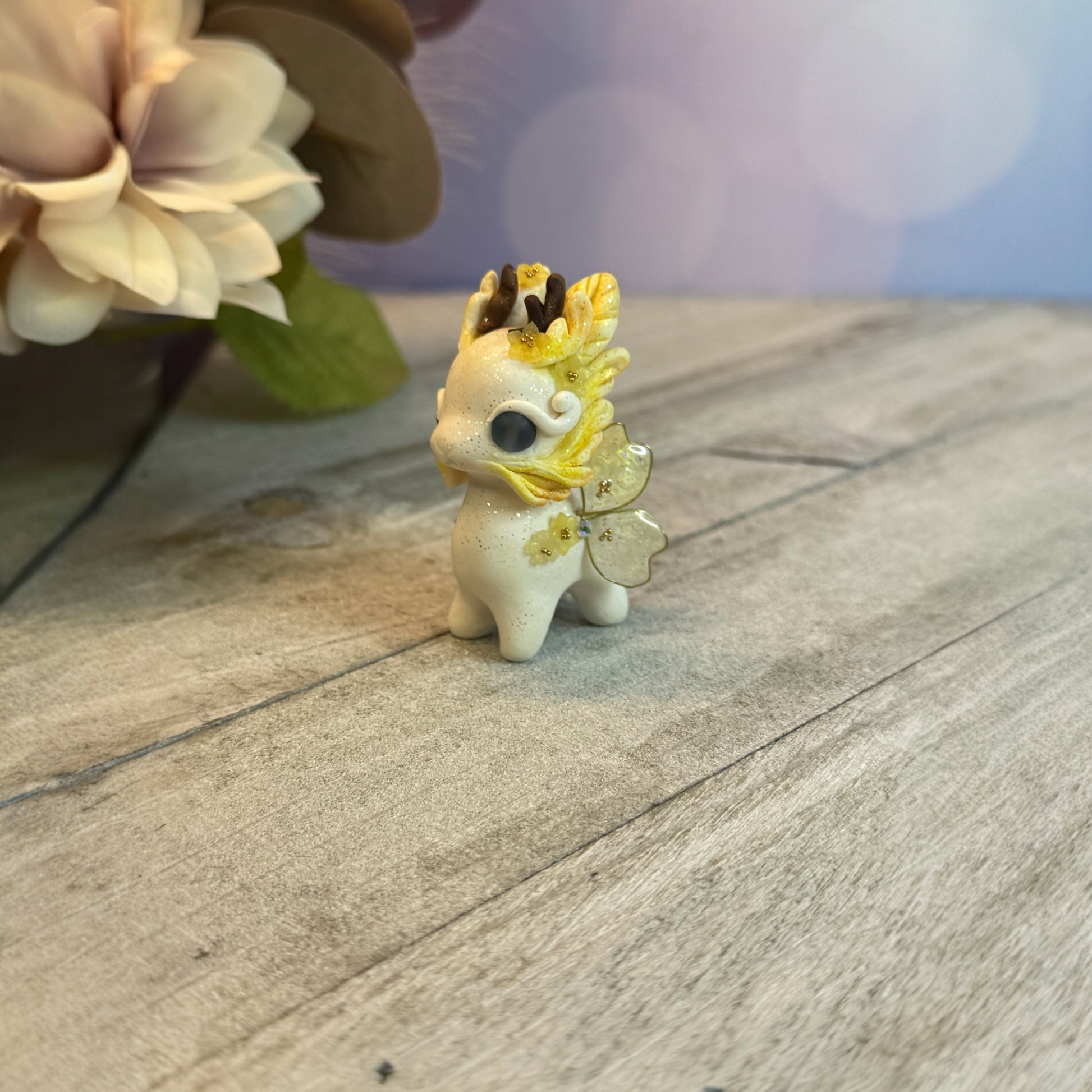 Meet the Dark Purple Shimmer Bunnigon, a playful little creature handmade with love from premo polymer clay. Adorned with resin and wire cherry blossom wings, glass bead eyes, and gold seed beads, this whimsical desk pet doubles as a guardian for your workspace. It's a one-of-a-kind addition to your collection!