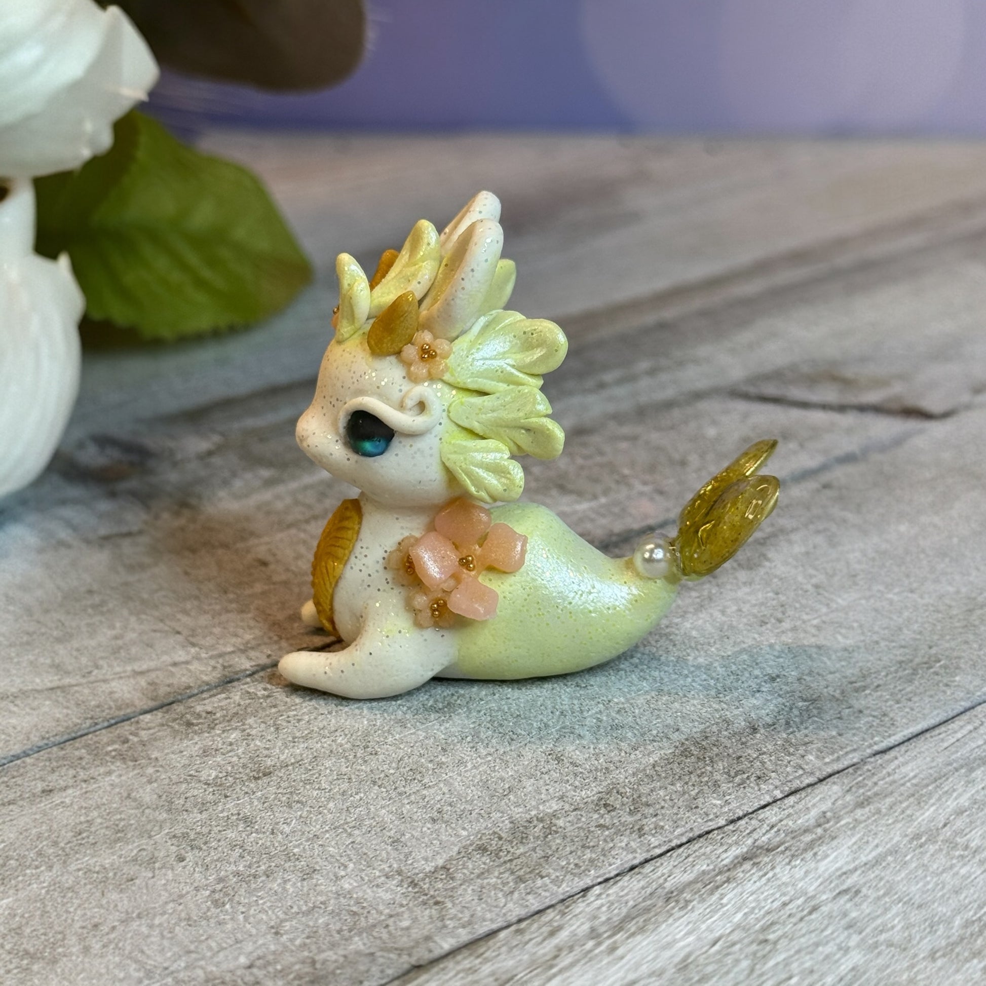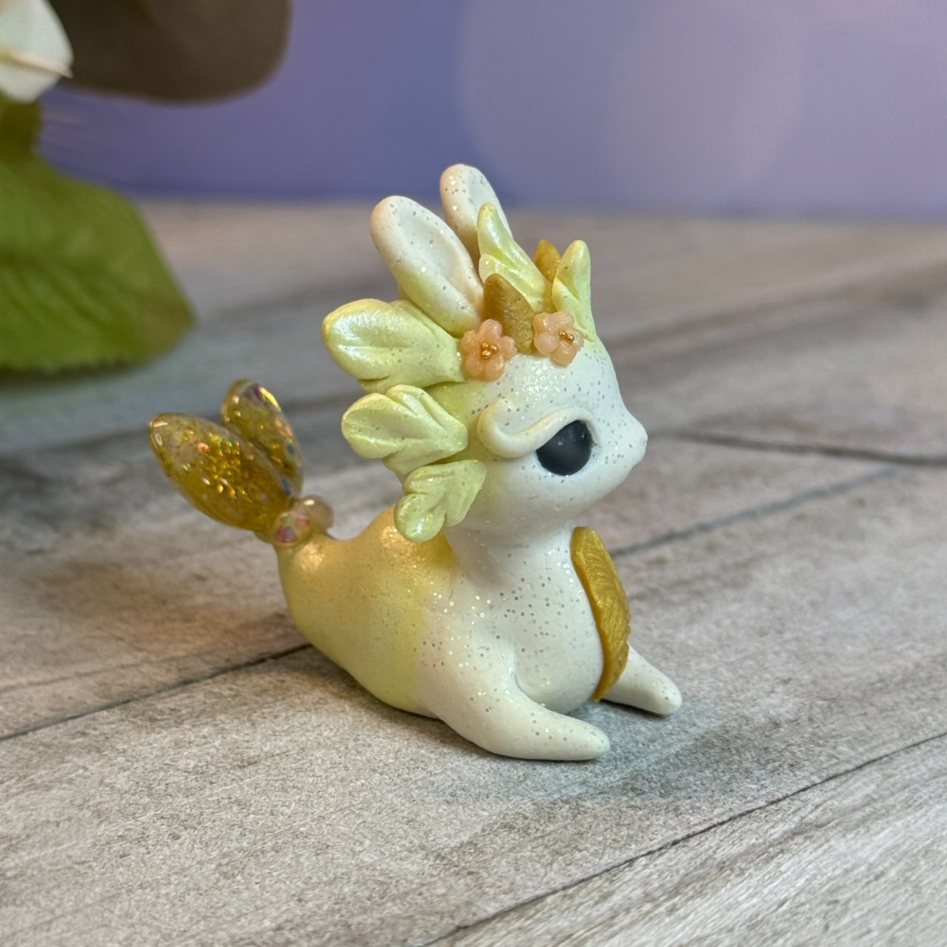 Introducing the Chonky Yellow Kelpie Bunnigon, made with Premo Polymer clay and featuring iridescent glass bead eyes, a resin and wire fin, faux pearls and crystals, and an aluminum armature. Its pastel pigments give it a cute and playful look, making it the perfect addition to any desk as a pet with a twist.